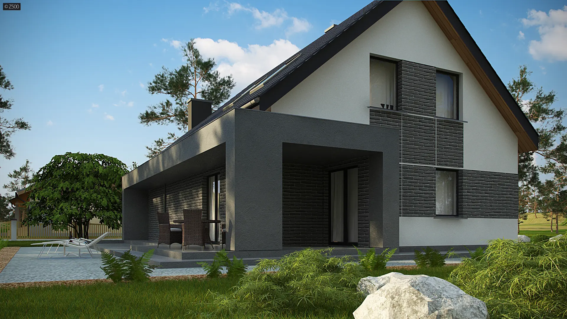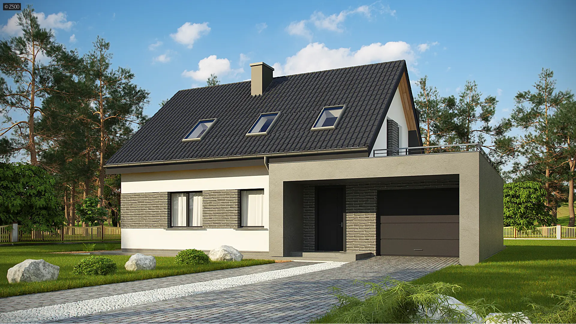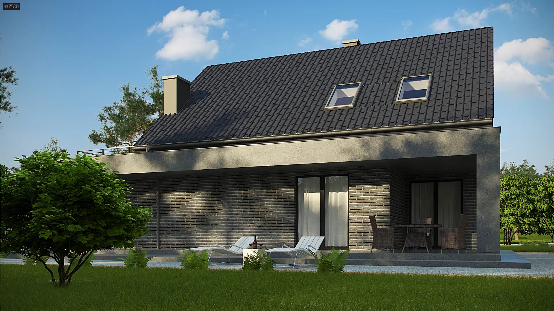 Z347 to dom, który posiada salon i kuchnię od frontu. Jego plan rozrysowano jako bryłę na planie prostokąta, z poddaszem użytkowym i dachem dwuspadowym. Proste elementy dekoracyjne służą jednocześnie jako zadaszenie wejścia i tarasu. Elewacja o biało-szarej kolorystyce daje wrażenie czystości, schludności i skromności. Wyżej wymienione atuty architektoniczne są korzystne dla kieszeni inwestora.