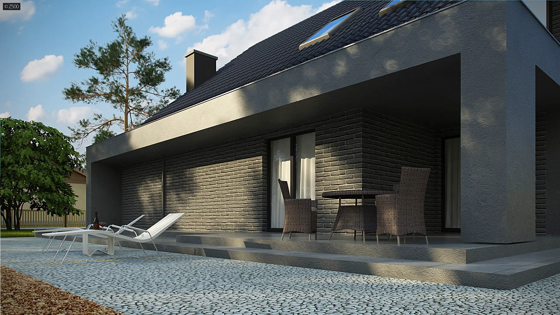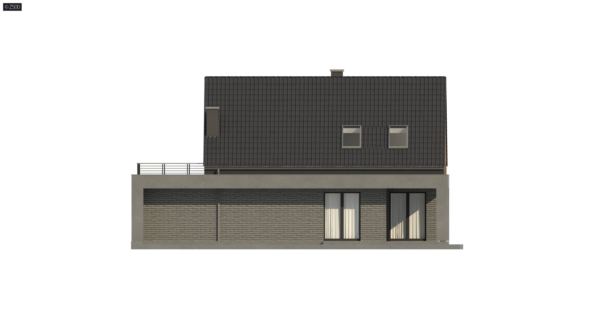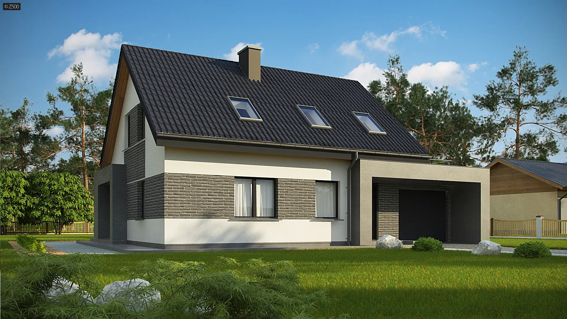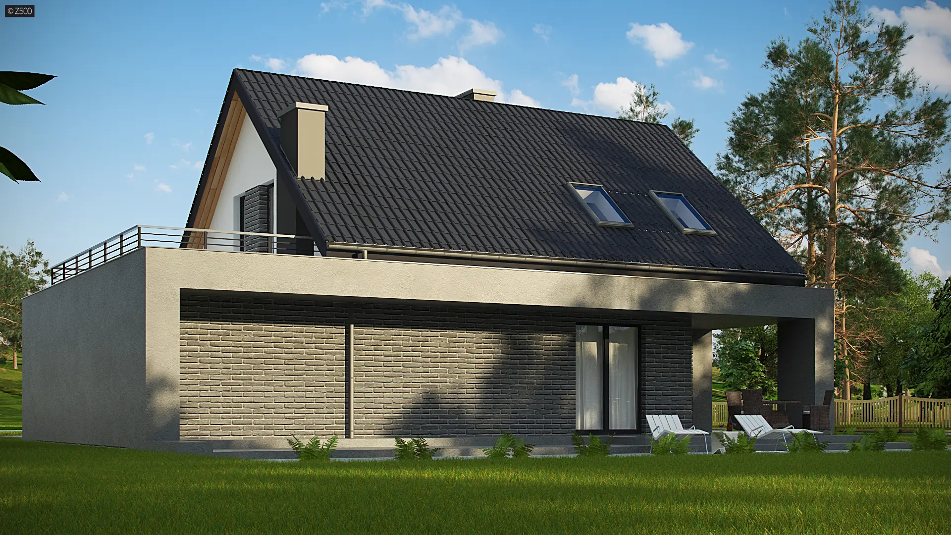 Z347 to dom, który posiada salon i kuchnię od frontu. Jego plan rozrysowano jako bryłę na planie prostokąta, z poddaszem użytkowym i dachem dwuspadowym. Proste elementy dekoracyjne służą jednocześnie jako zadaszenie wejścia i tarasu. Elewacja o biało-szarej kolorystyce daje wrażenie czystości, schludności i skromności. Wyżej wymienione atuty architektoniczne są korzystne dla kieszeni inwestora.