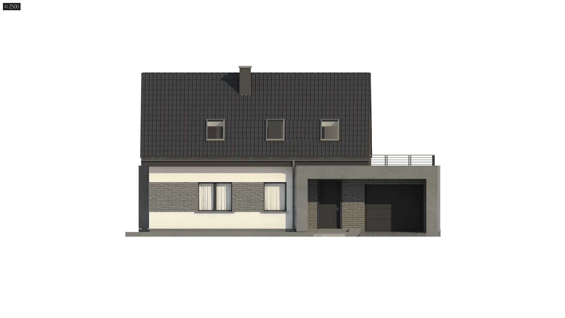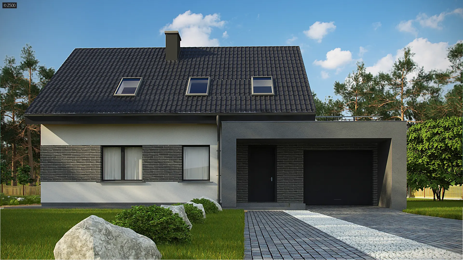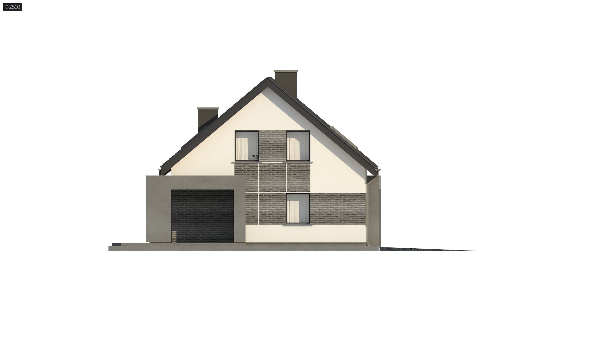Kompaktowy dom z dachem dwuspadowym, salonem i kuchnią od frontu oraz garażem.