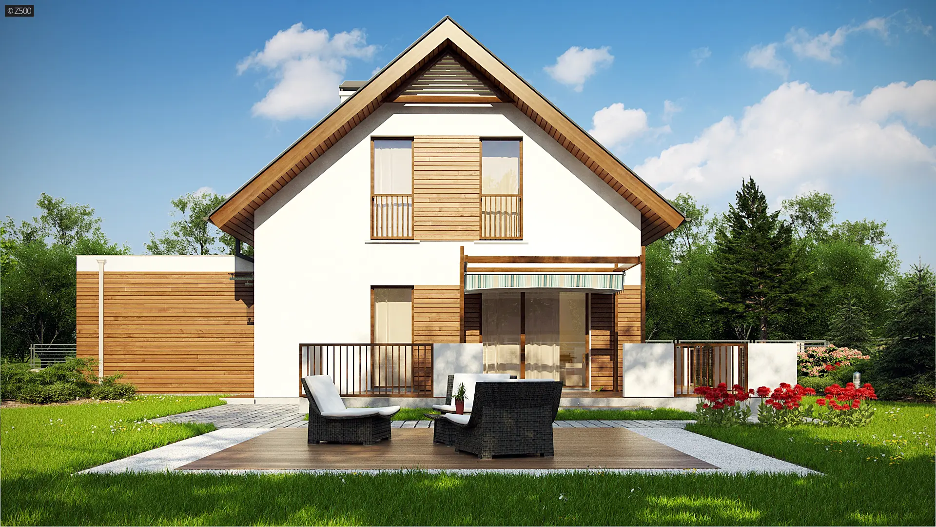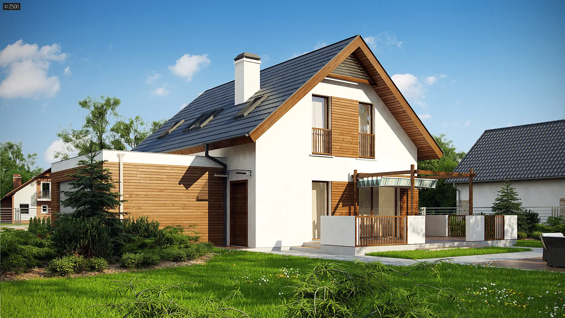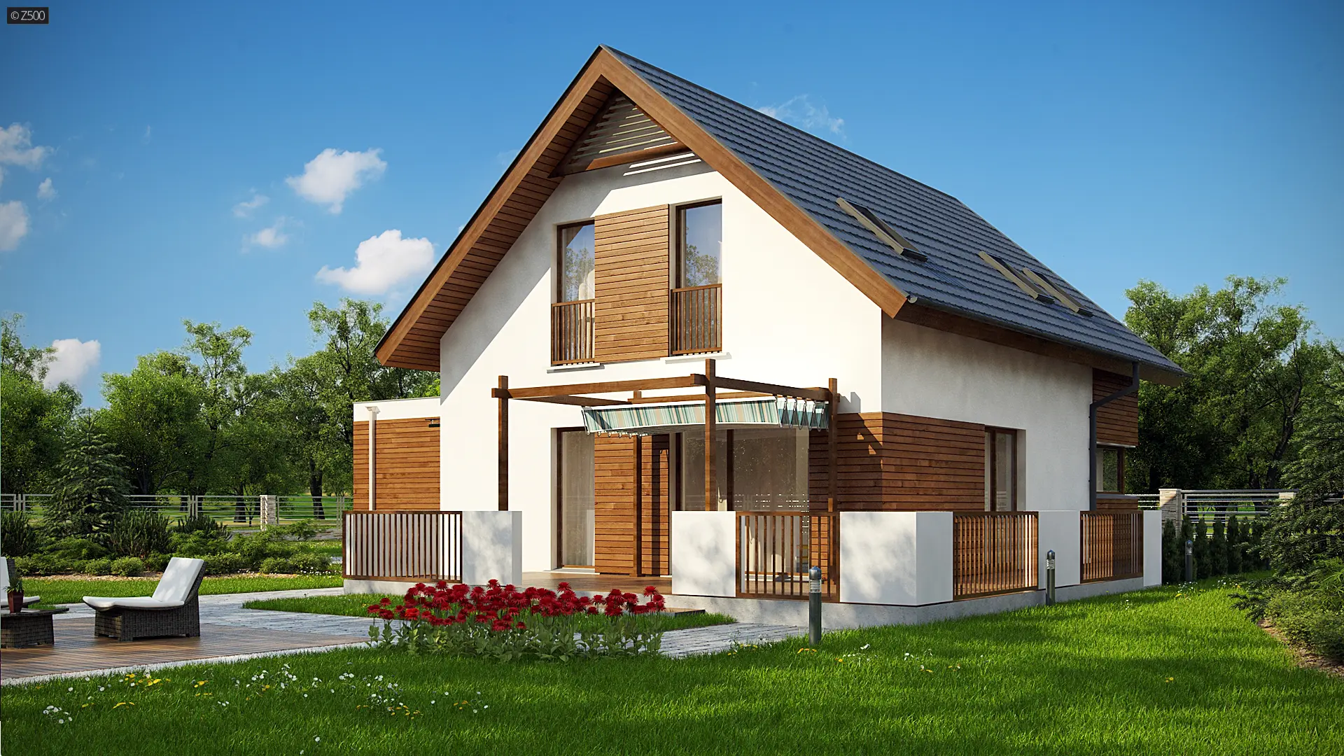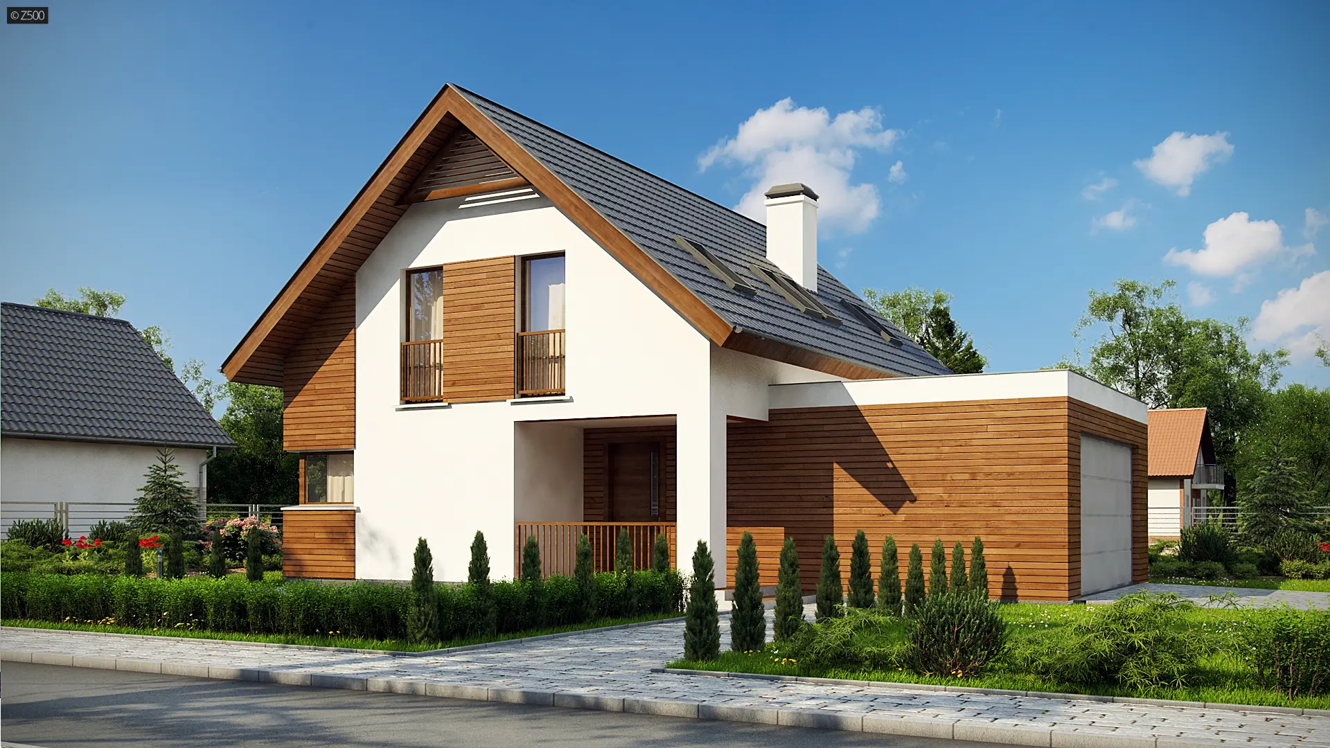 Nowoczesny dom z poddaszem użytkowym i tradycyjnym dachem dwuspadowym.