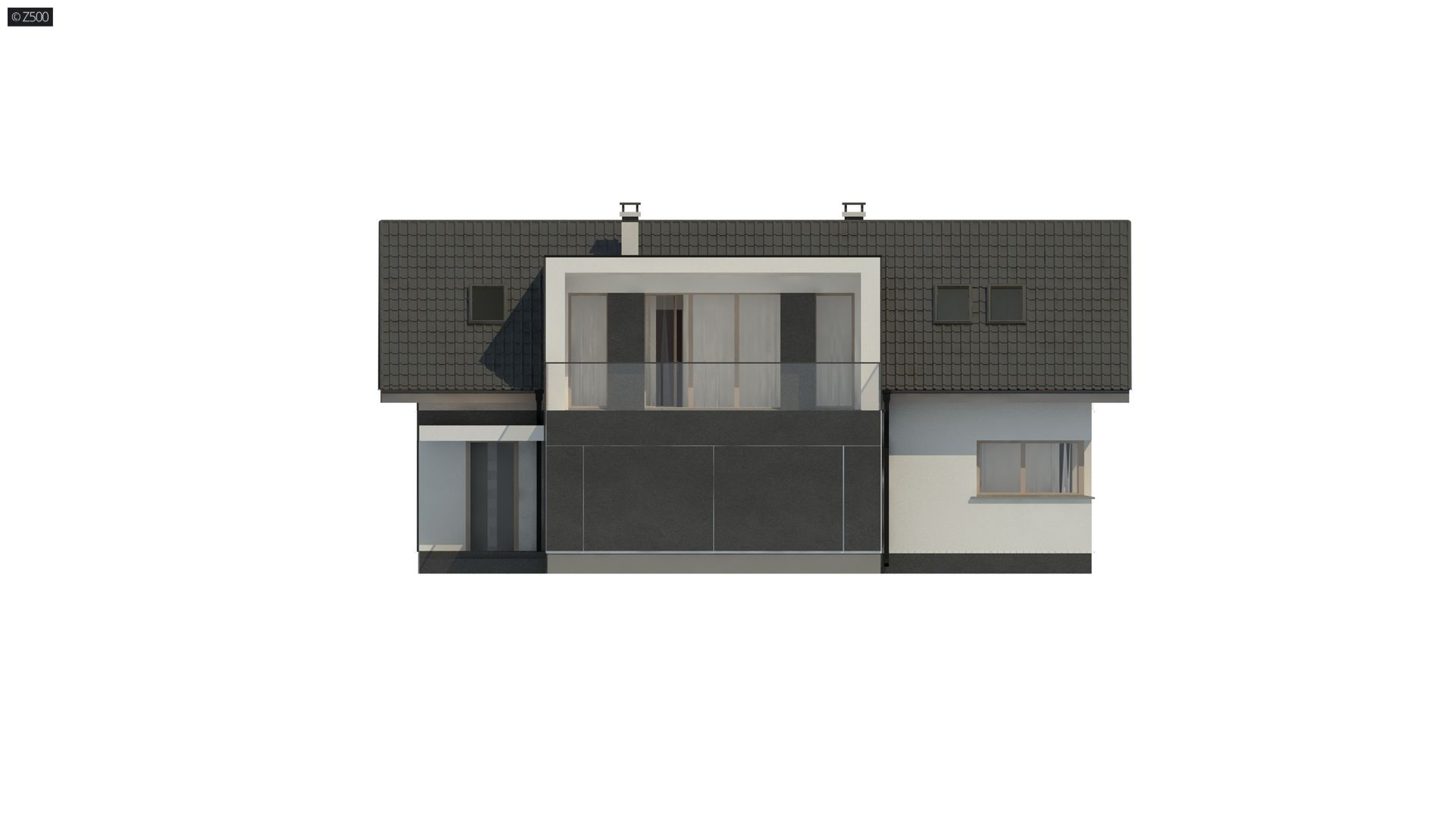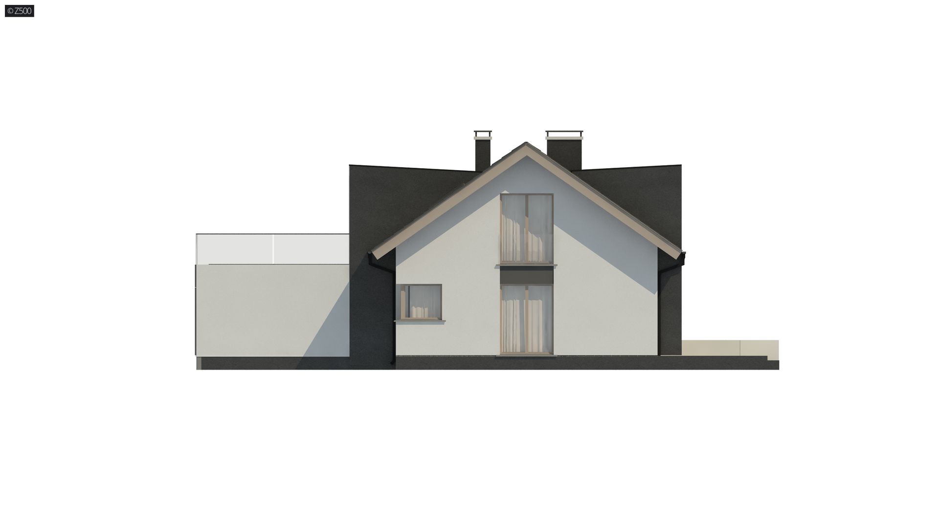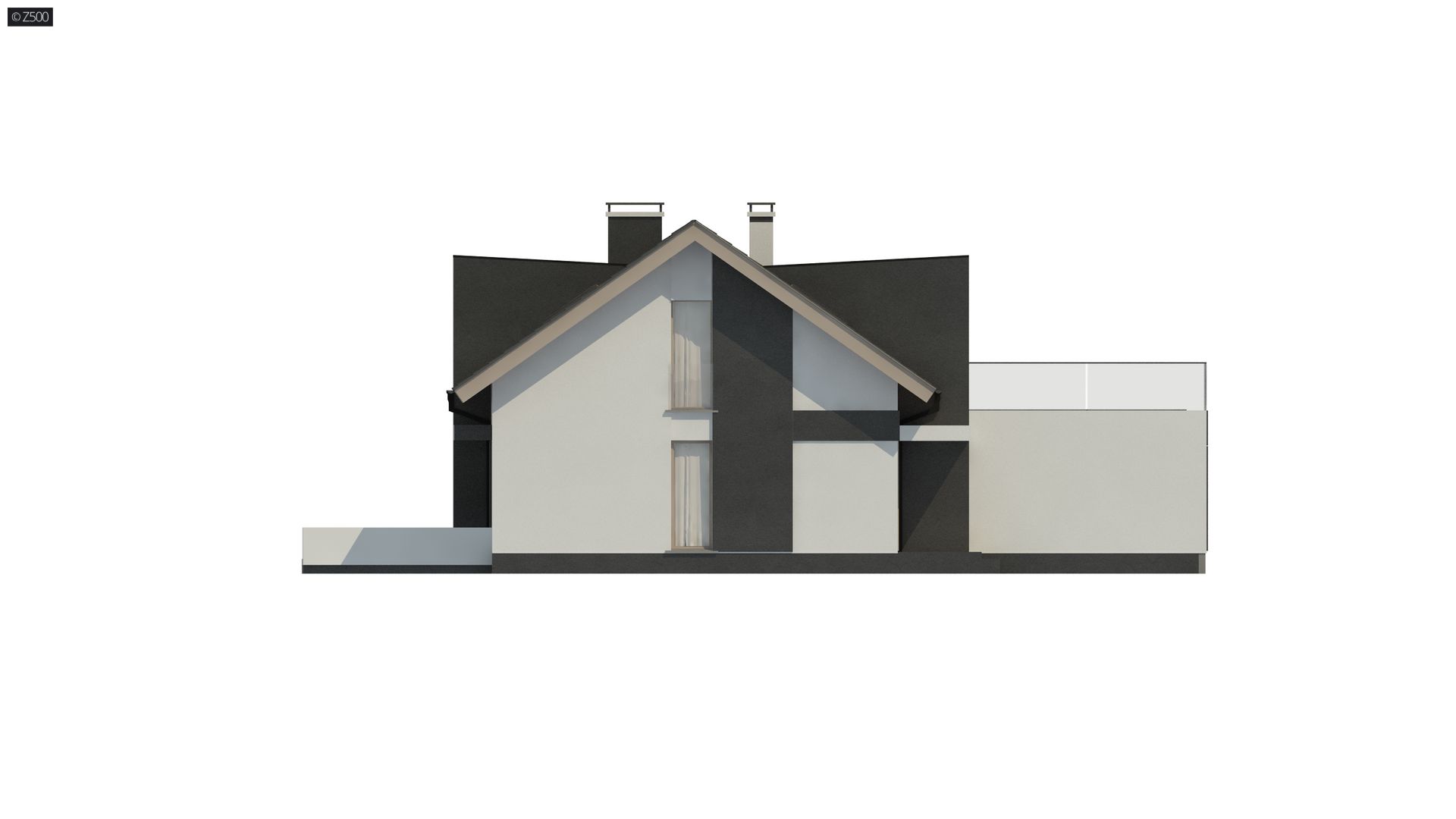 Nowoczesna, biało-szara bryła. Dach dwuspadowy, którego dodatkową zaletą oprócz atrakcyjnego kształtu, jest niska cena jego wykonania.