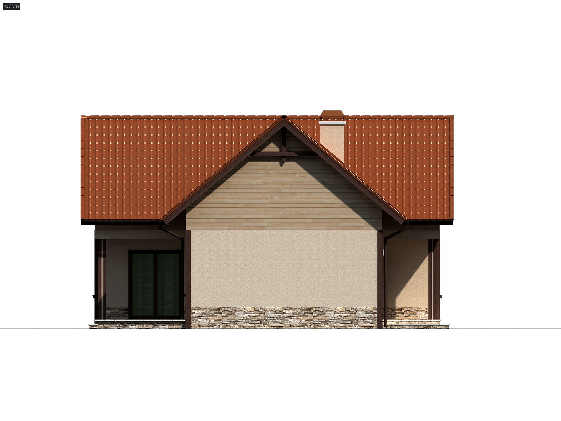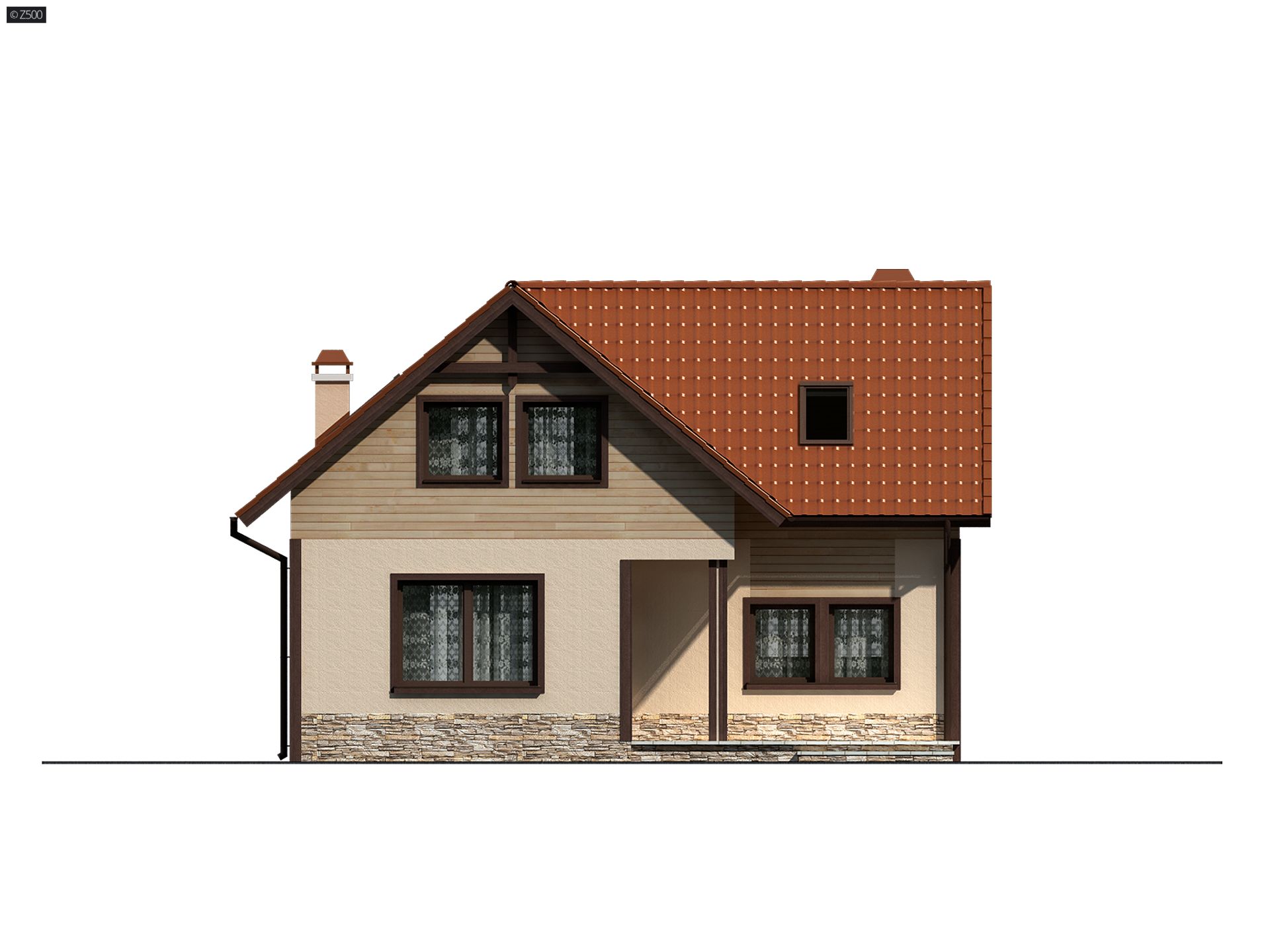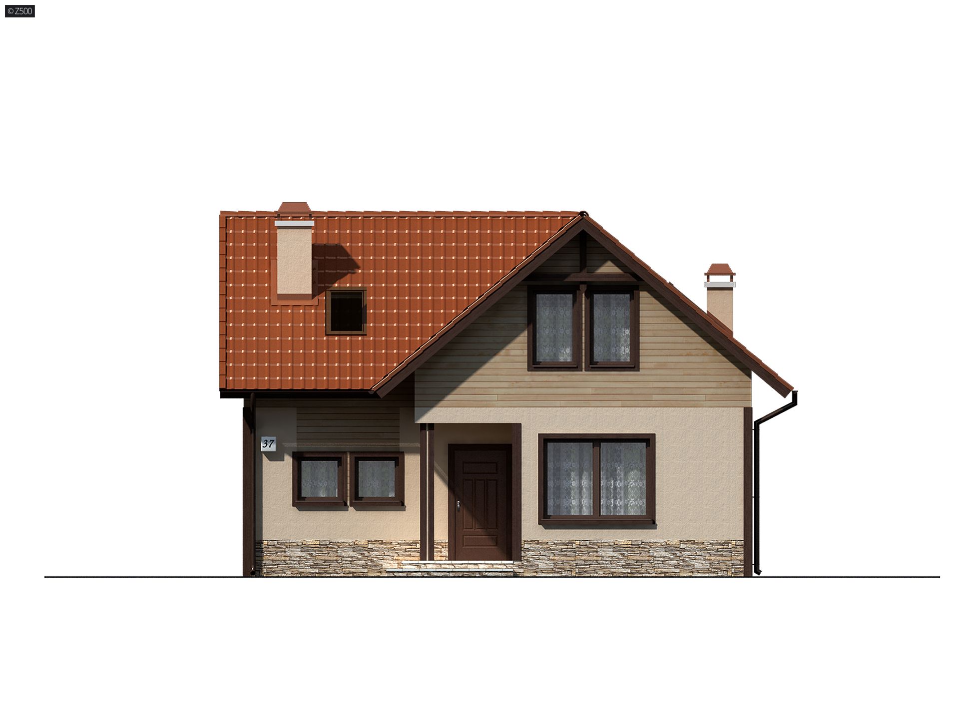 Z37 to uroczy projekt, który można usytuować na niewielkiej działce. O jego charakterze decyduje ciekawe wykończenie elewacji okładziną z desek oraz tynkiem w beżowym odcieniu. Razem z dachem pokrytym czerwono-ceglastą dachówką, tworzą spójną, pełną uroku całość.