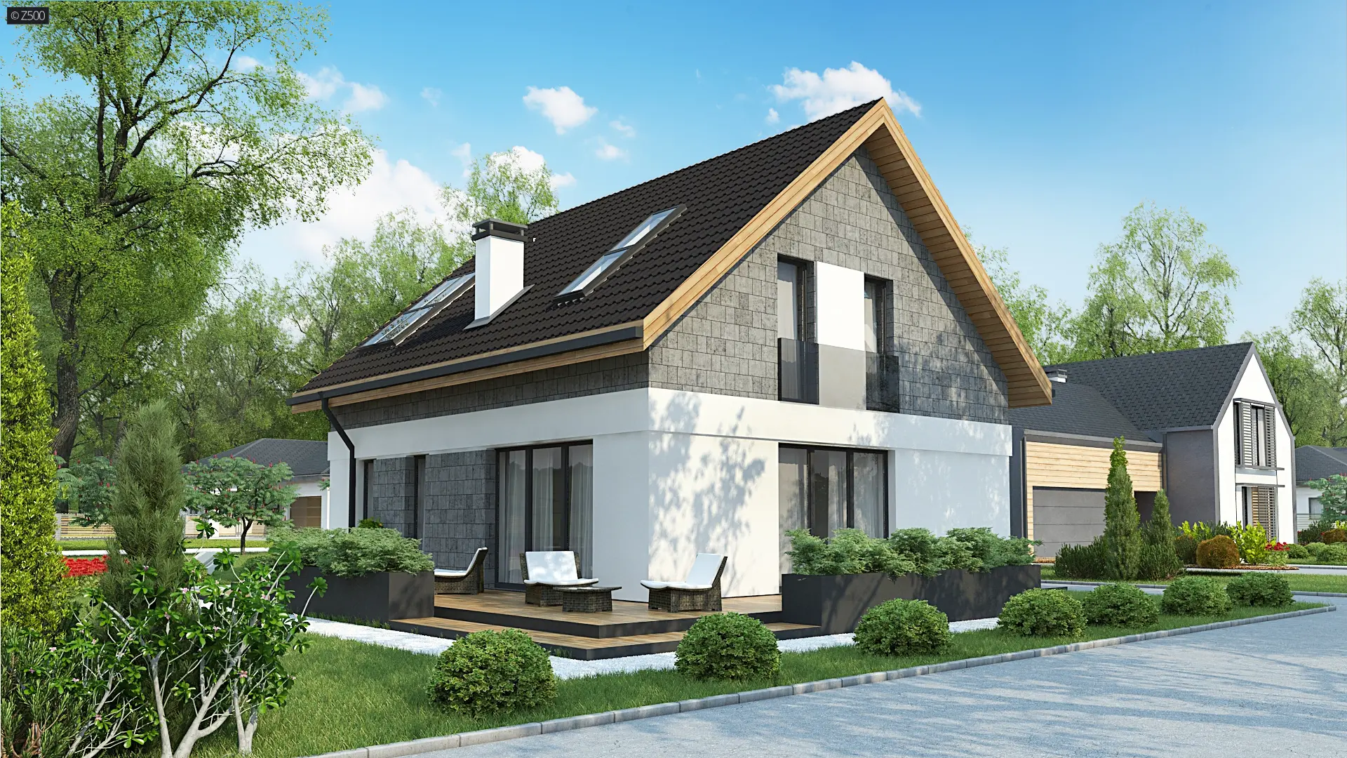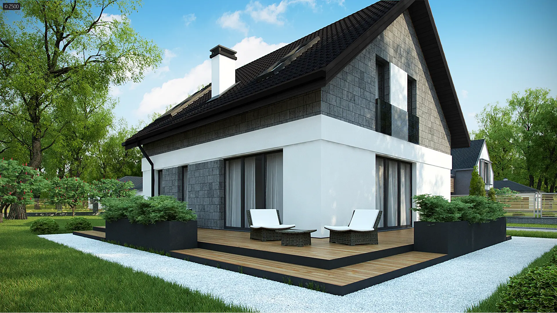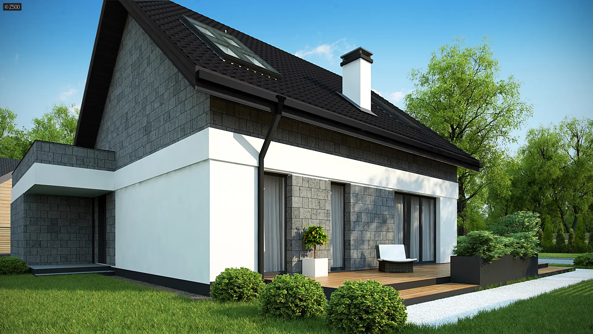Na wykończenie elewacji składa się proste połączenie jasnego tynku z szarością. Duże, portfenetrowe okna na poddaszu użytkowym rozmieszczono w ten sposób, aby jak najbardziej doświetlały wnętrza, nadając im ciepła i słonecznego blasku.