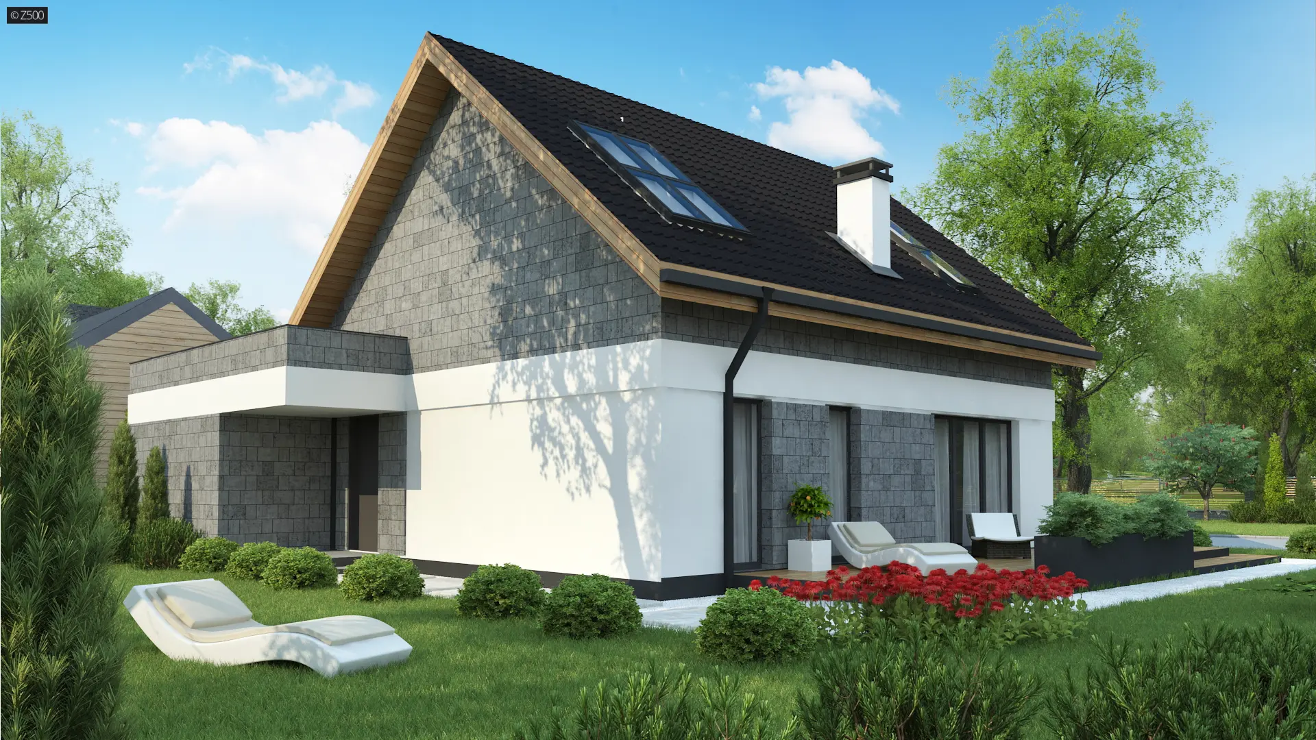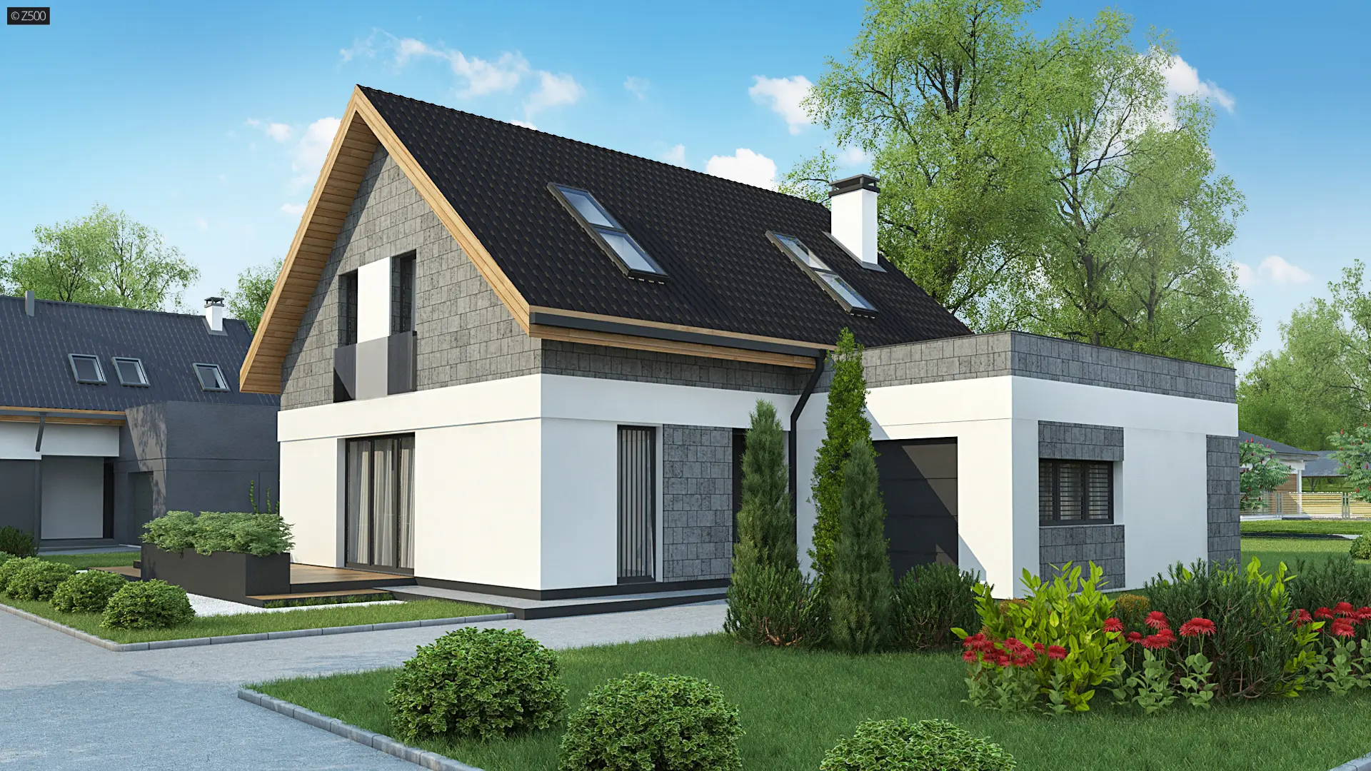 Z371 to klasyczny projekt domu jednorodzinnego z dachem dwuspadowym oraz nowoczesnym, płaskim dachem nad jednostanowiskowym garażem.