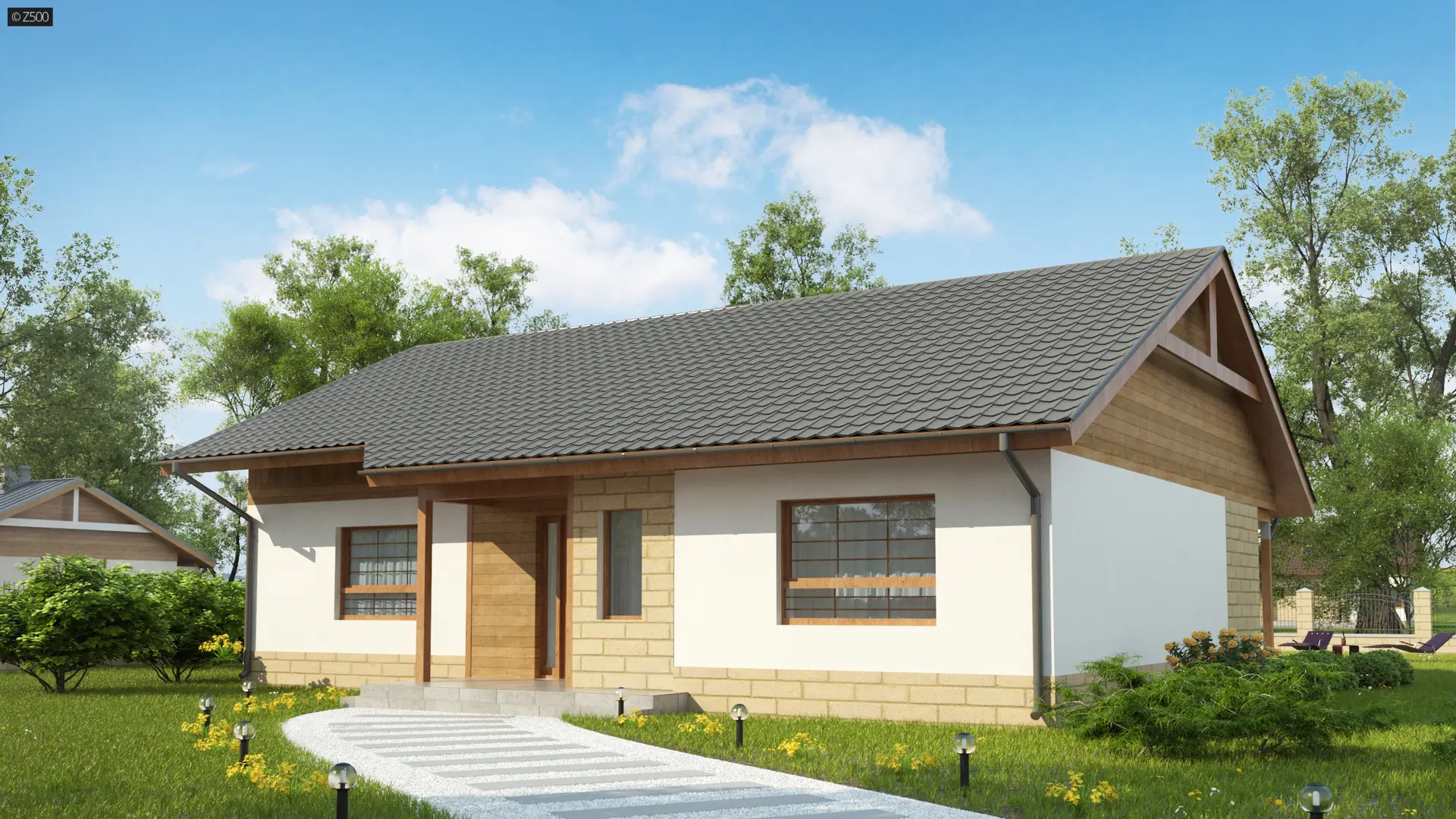 Drewniany dom parterowy z trzema dużymi pokojami, ekonomiczny w budowie