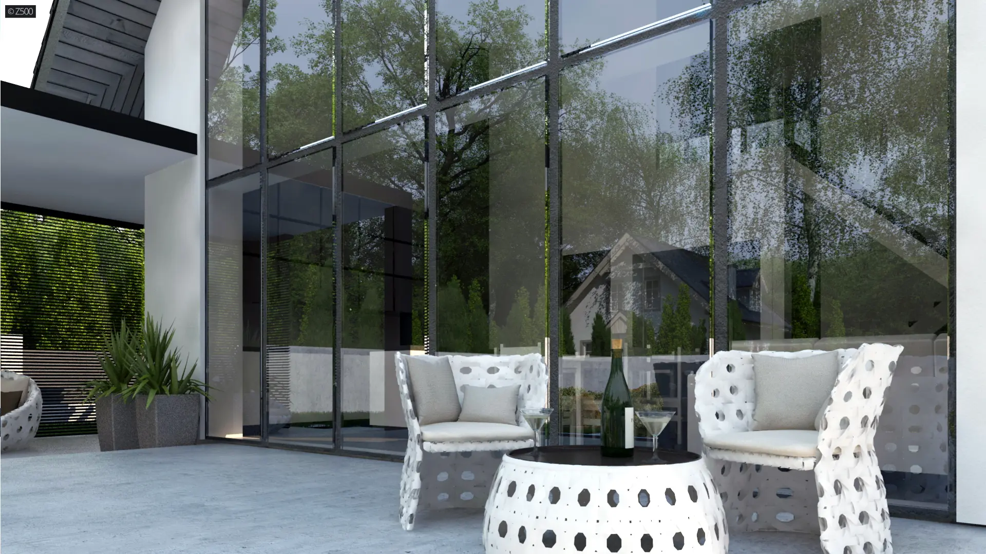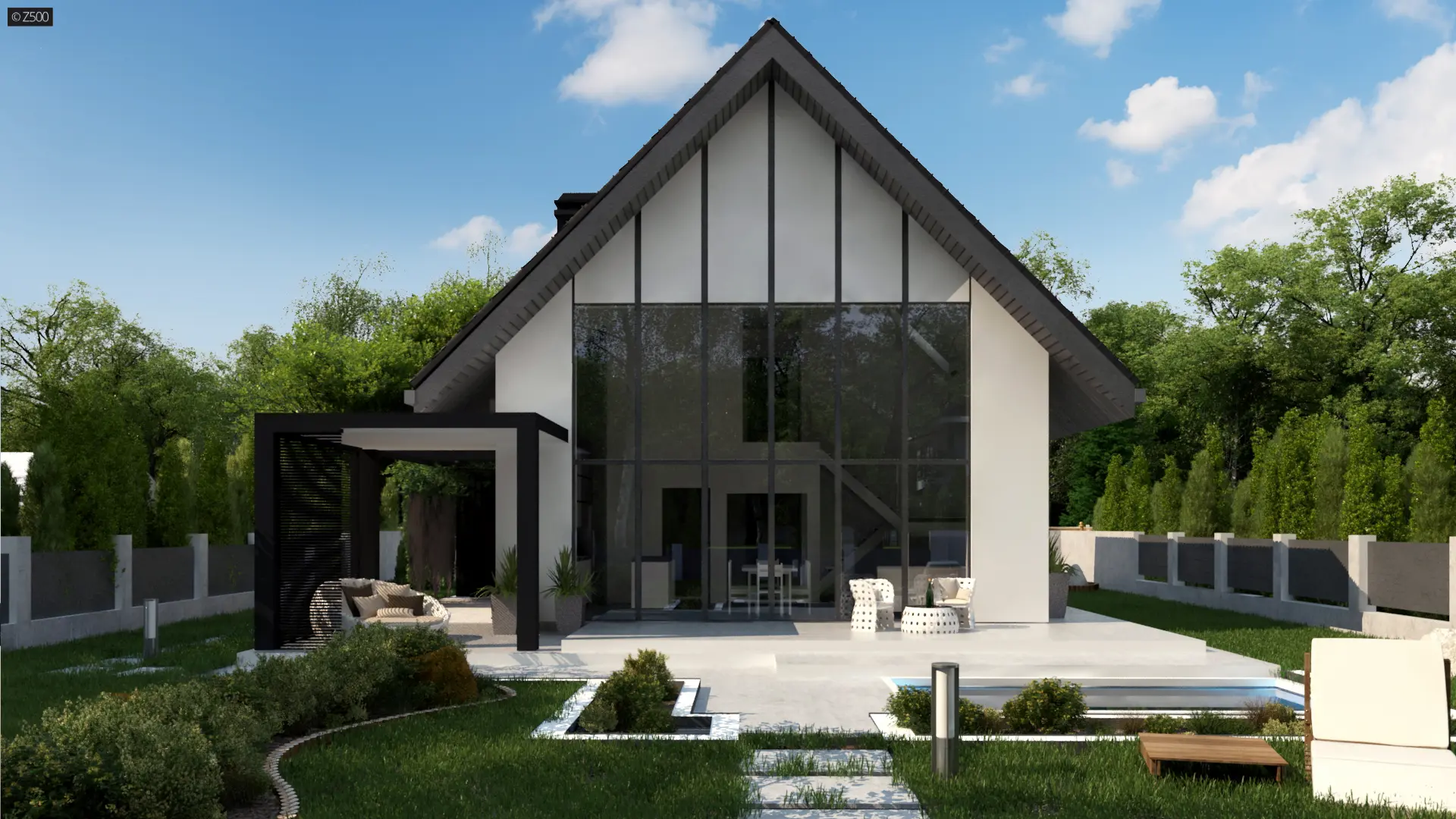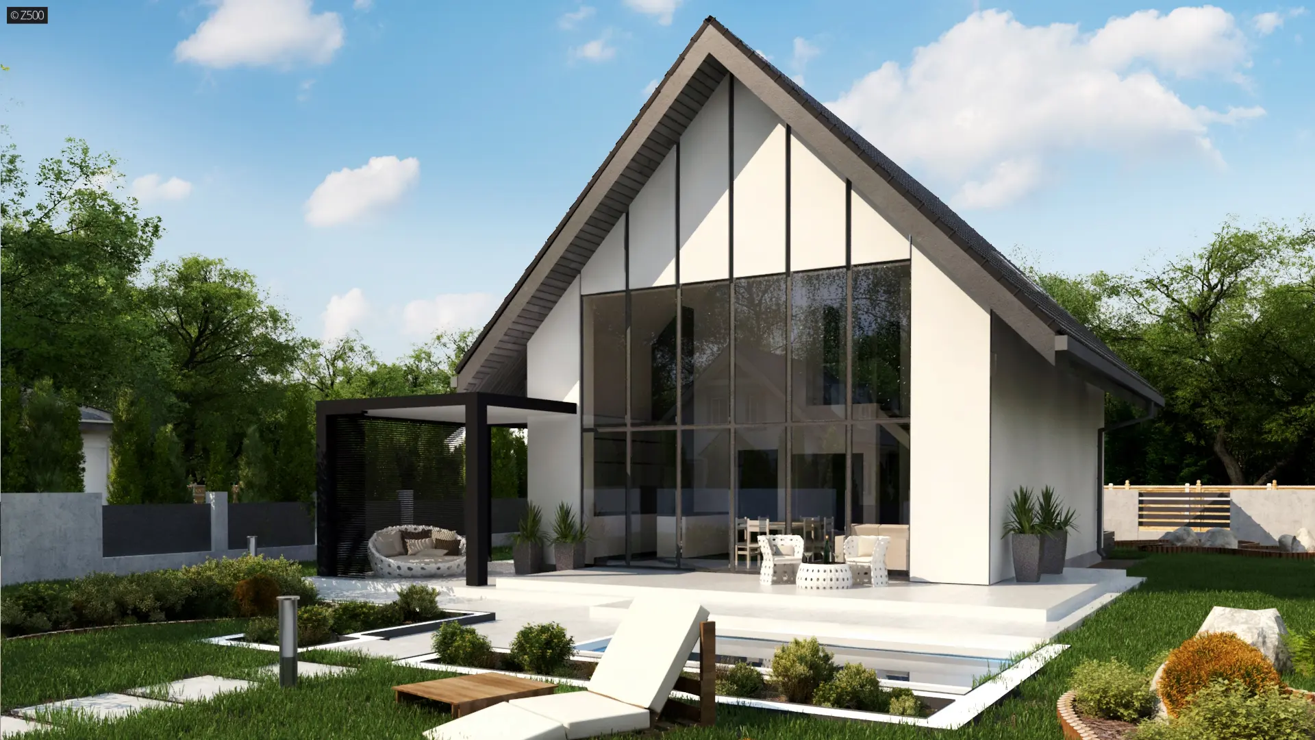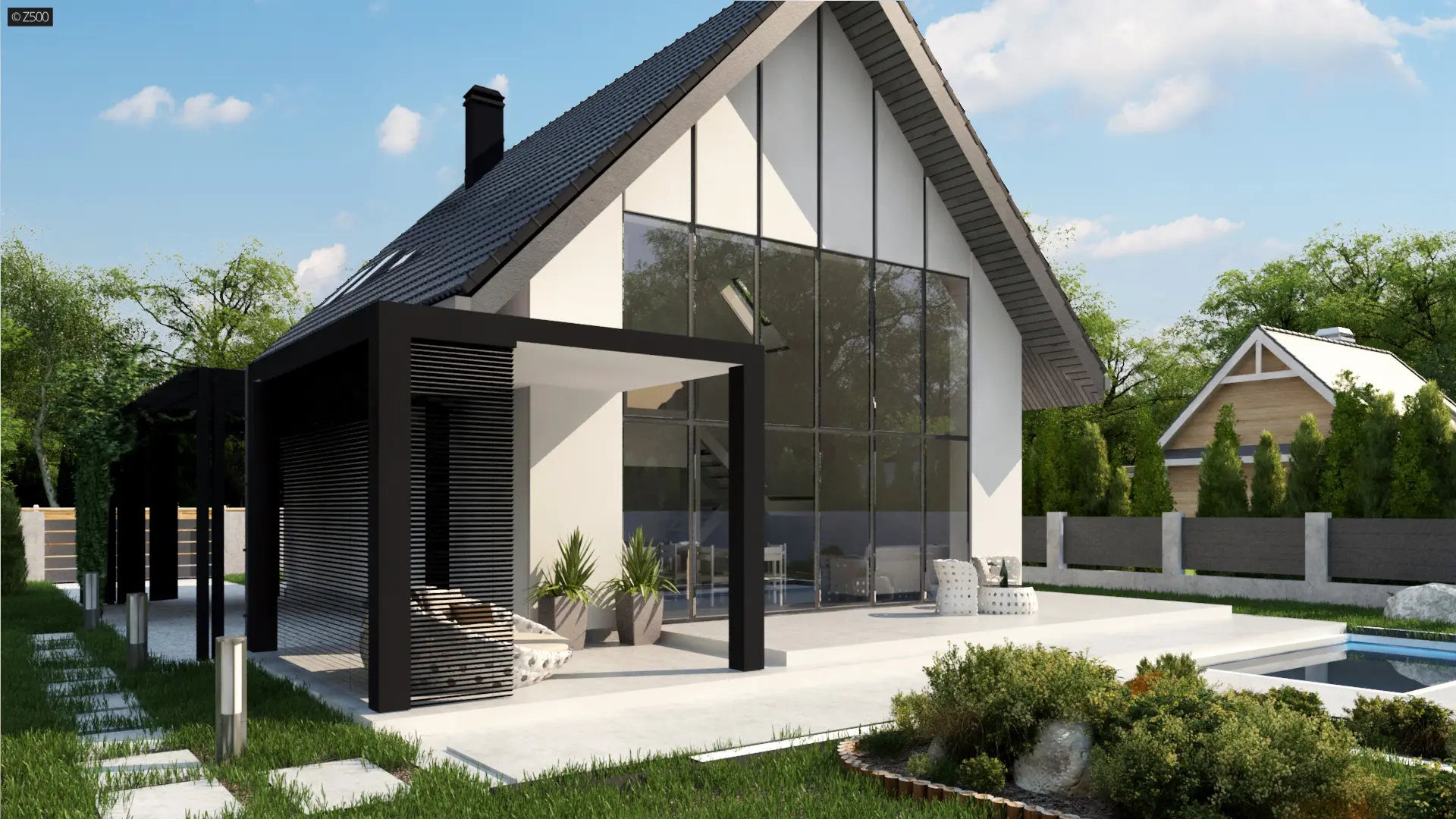 W związku z tym, iż domek nie ma okien na elewacjach bocznych, istnieje możliwość dobudowania garażu- alternatywą może być wiata pokazana na wizualizacjach.