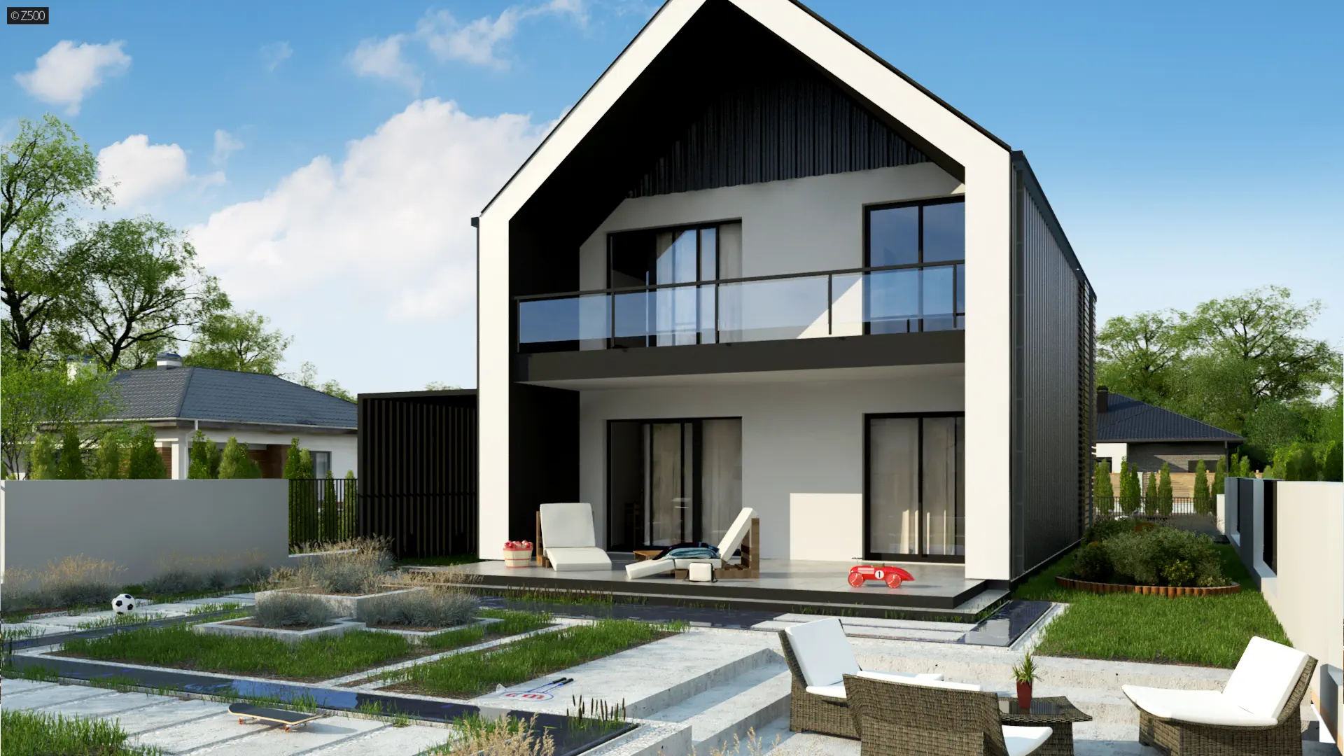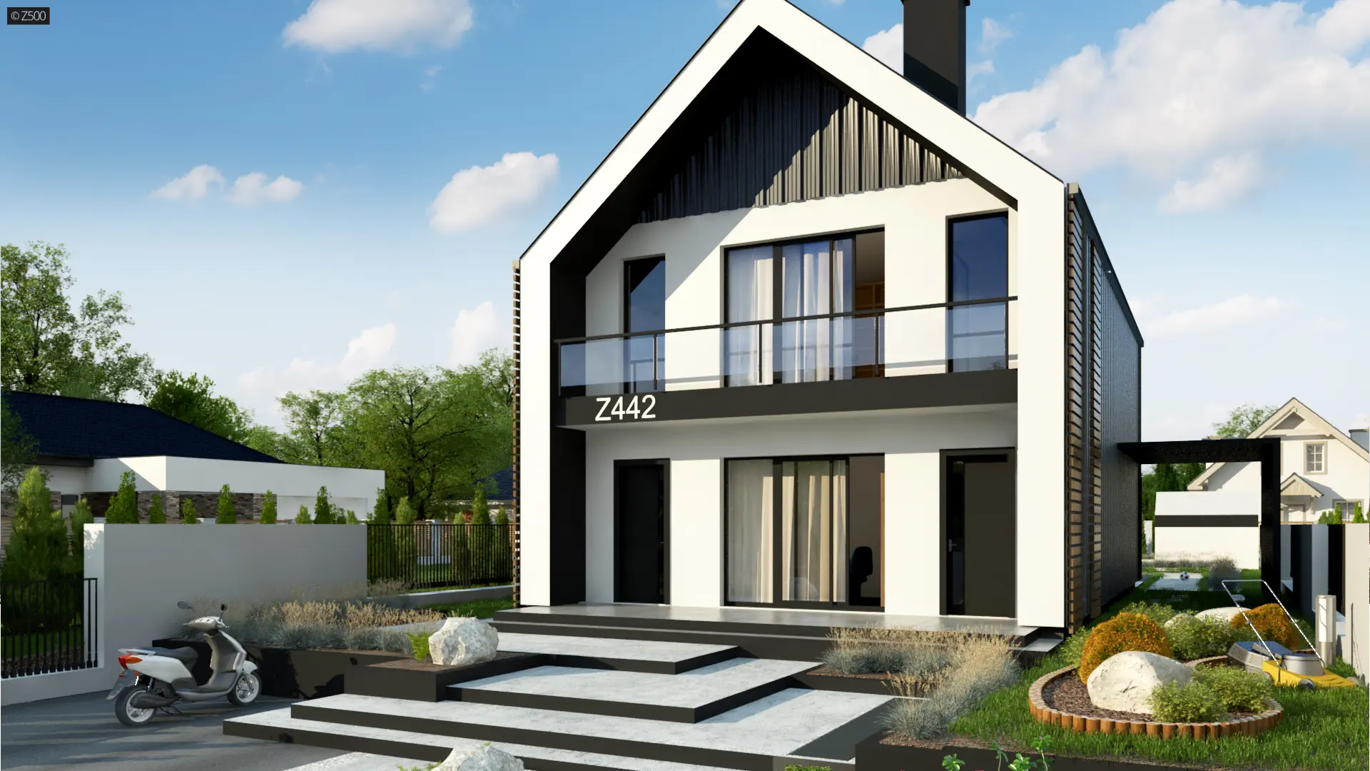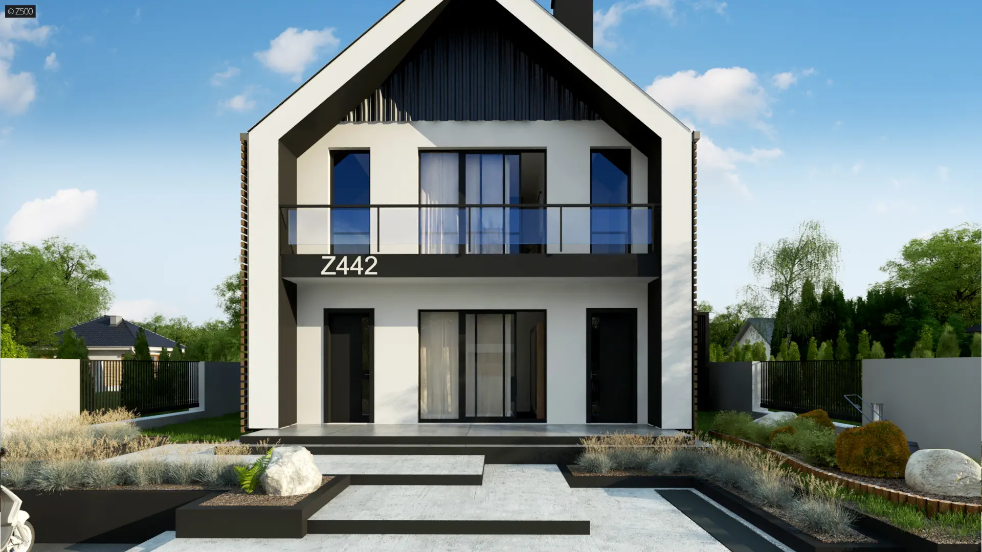 Projekt Z442 jest stworzony dla ludzi ceniących sobie nowoczesność w „małym wydaniu”. Rozwiązaniem dość nietypowym są dwa pokoje na poddaszu – każdy z nich posiada własną garderobę i wyjście na w pełni zadaszony balkon. Przestrzeń pod schodami -często niewykorzystywana- tutaj okazała się idealnym miejscem na schowek z przesuwnymi lub składanymi drzwiami. Dodatkowo na parterze znajduje się pomieszczenie, które może pełnić rolę pokoju gościnnego lub gabinetu (usytuowanie go w pobliżu wejścia do domu i łazienki jest bardzo komfortowe).