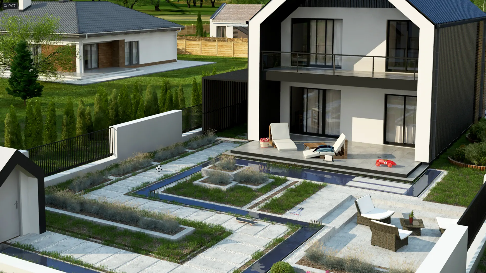 Atutem domu Z442 jest mała powierzchnia użytkowa i funkcjonalność. Dodatkowo jeżeli działka ma szerokość 16 m lub mniej, to domek można odsunąć od granicy działki o 1,5 m, ponieważ nie posiada on okien bocznych – zyskujemy więc dodatkową powierzchnię na zagospodarowanie terenu lub miejsce na samochód. W efekcie najmniejsza szerokość działki może wynosić 11,36 m.