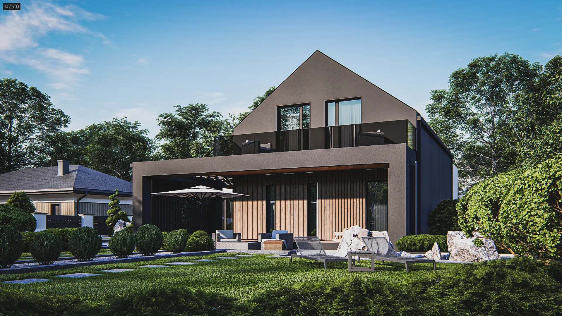 Nowoczesny dom z dużym tarasem i balkonem na piętrze oraz przestronnym salonem