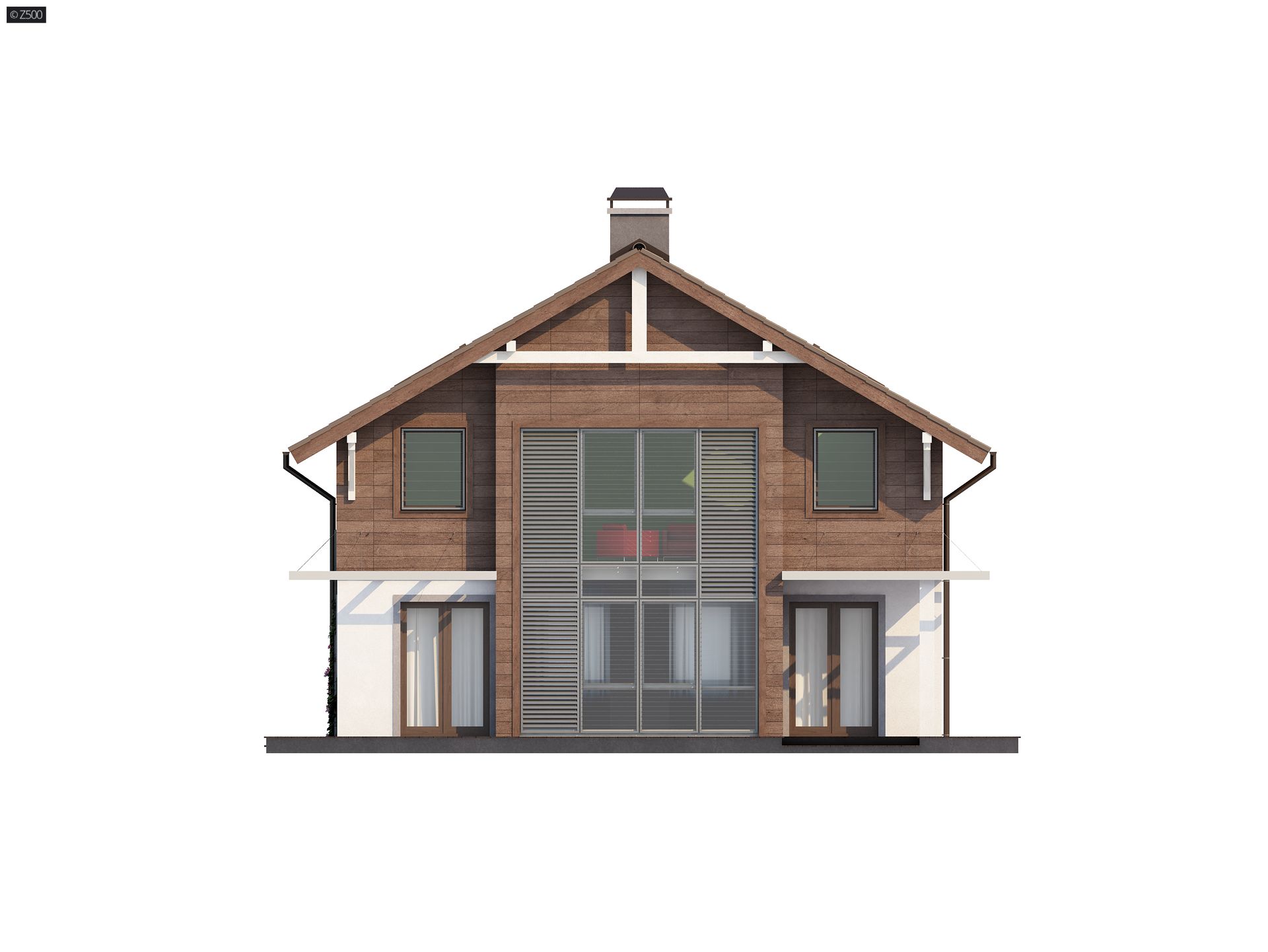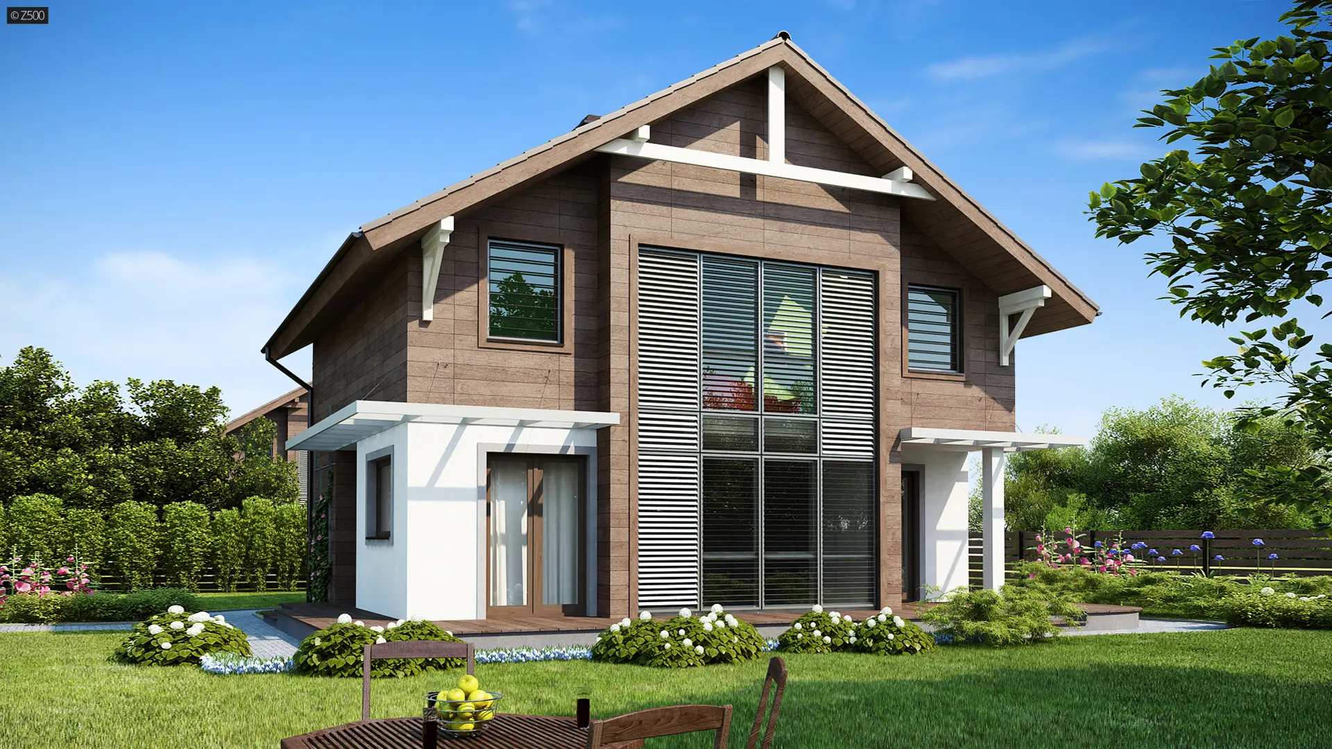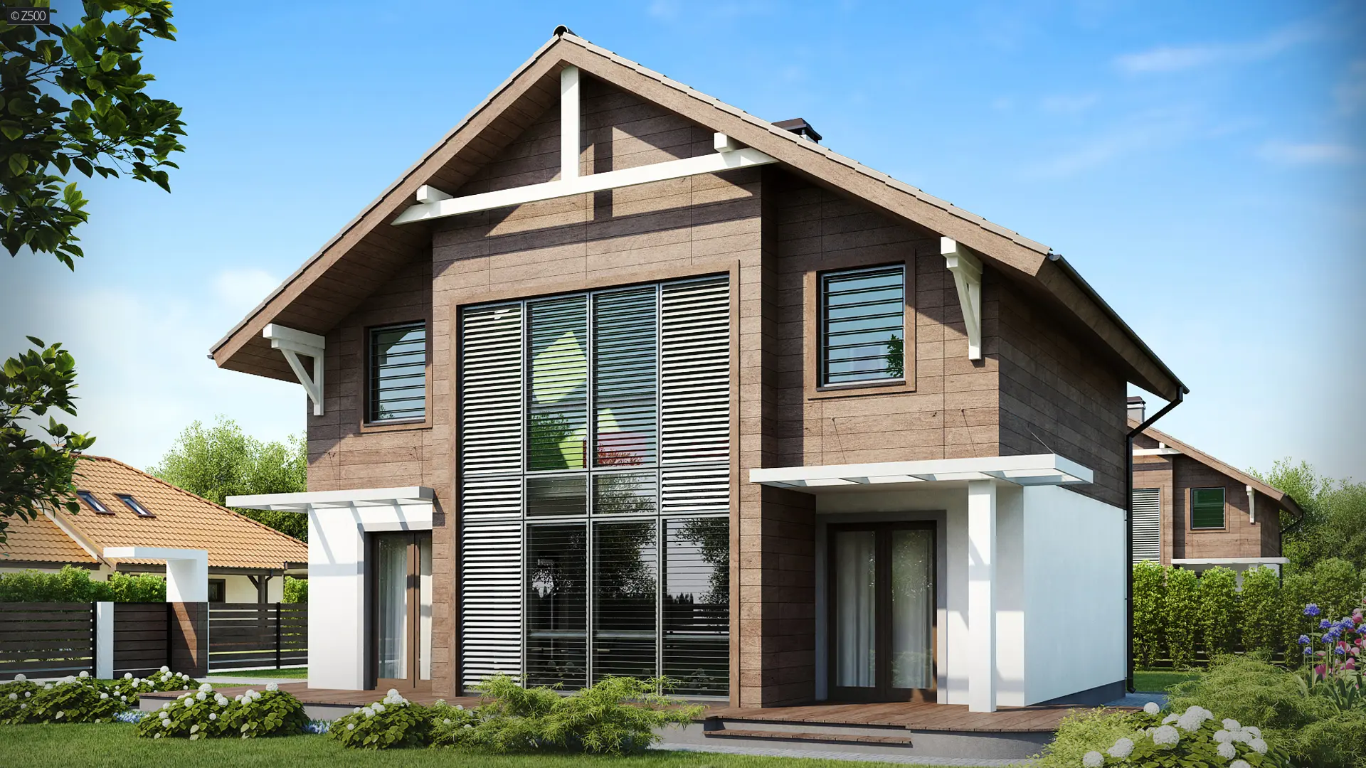 Z47 to piętrowy dom o współczesnym charakterze. Zwartą, prostą bryłę przekrytą dwuspadowym dachem urozmaicają duże przeszklenia połączone z ciepłym drewnem. Taras przysłaniają efektowne drewniane pergole.