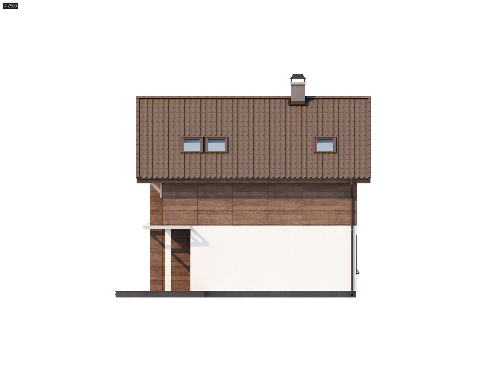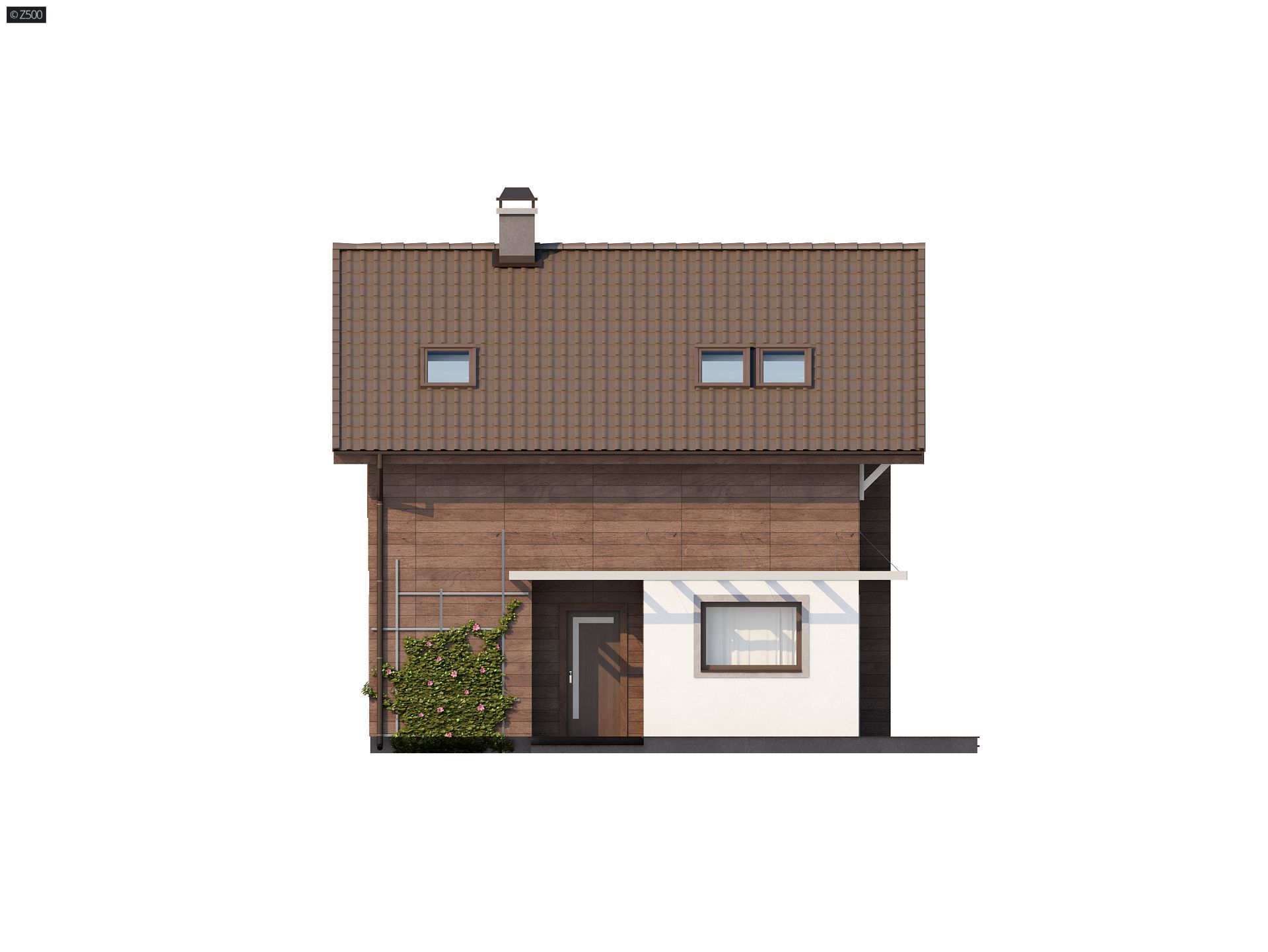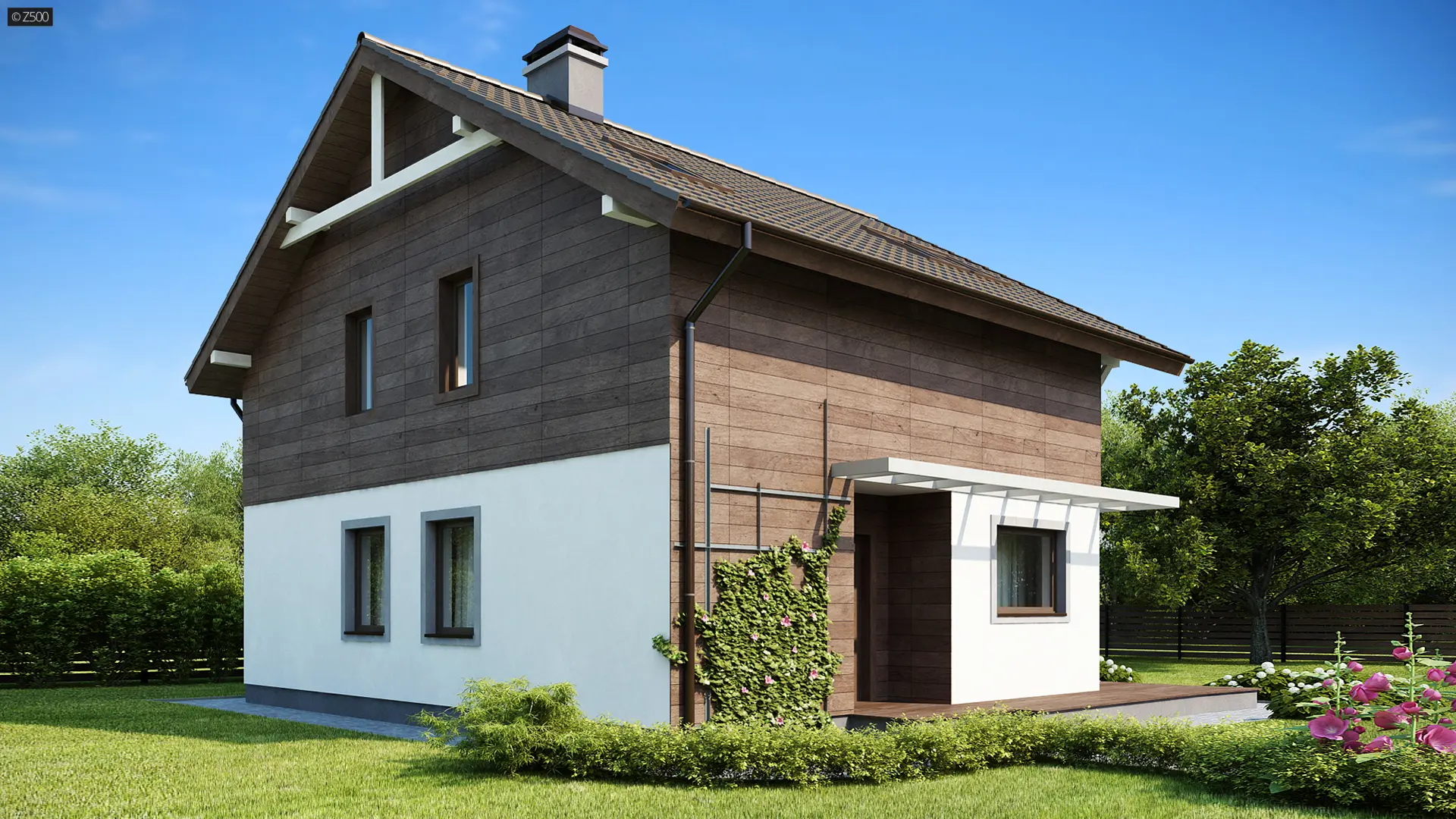 Z47 to piętrowy dom o współczesnym charakterze. Zwartą, prostą bryłę przekrytą dwuspadowym dachem urozmaicają duże przeszklenia połączone z ciepłym drewnem. Taras przysłaniają efektowne drewniane pergole.