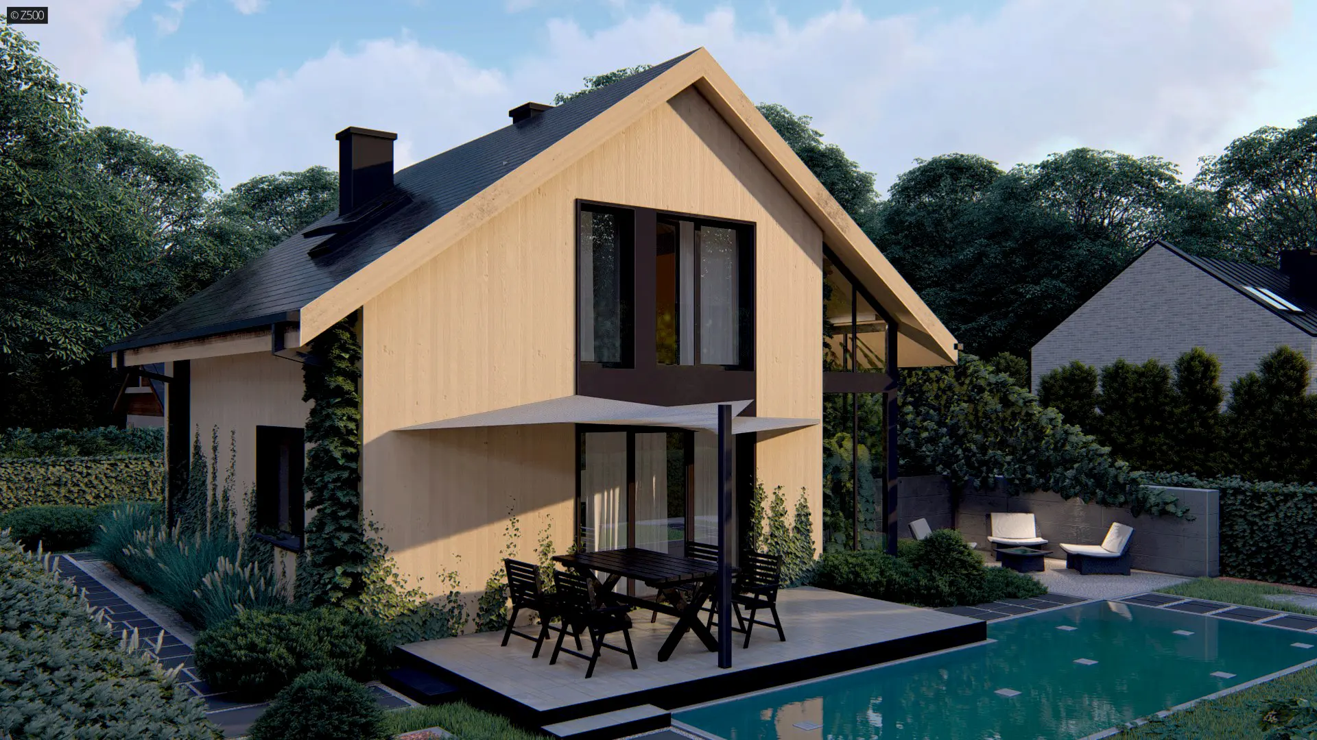 Projekt prostego domu o konstrukcji drewnianej o powierzchni 100m2 z oranżerią.