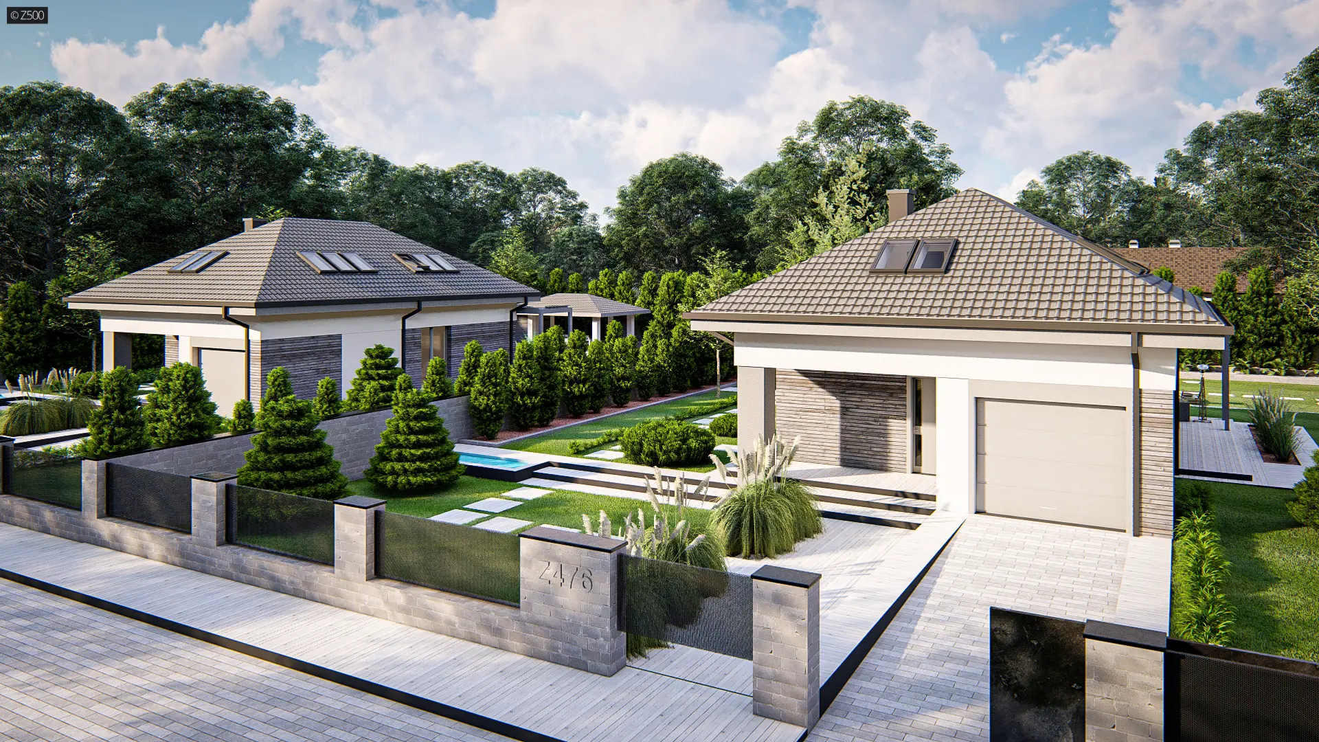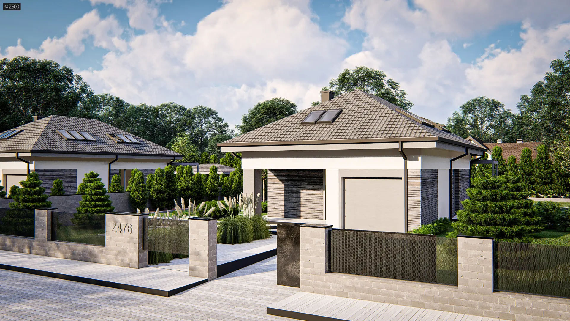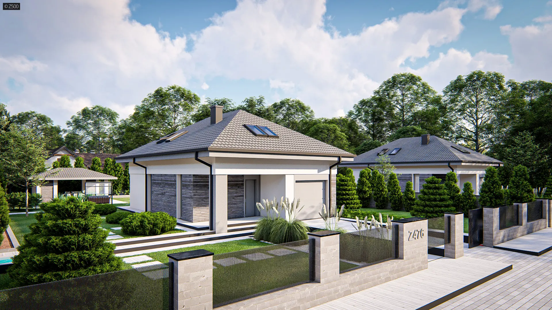 Dom z poddaszem użytkowym, kopertowym dachem i garażem jednostanowiskowym.