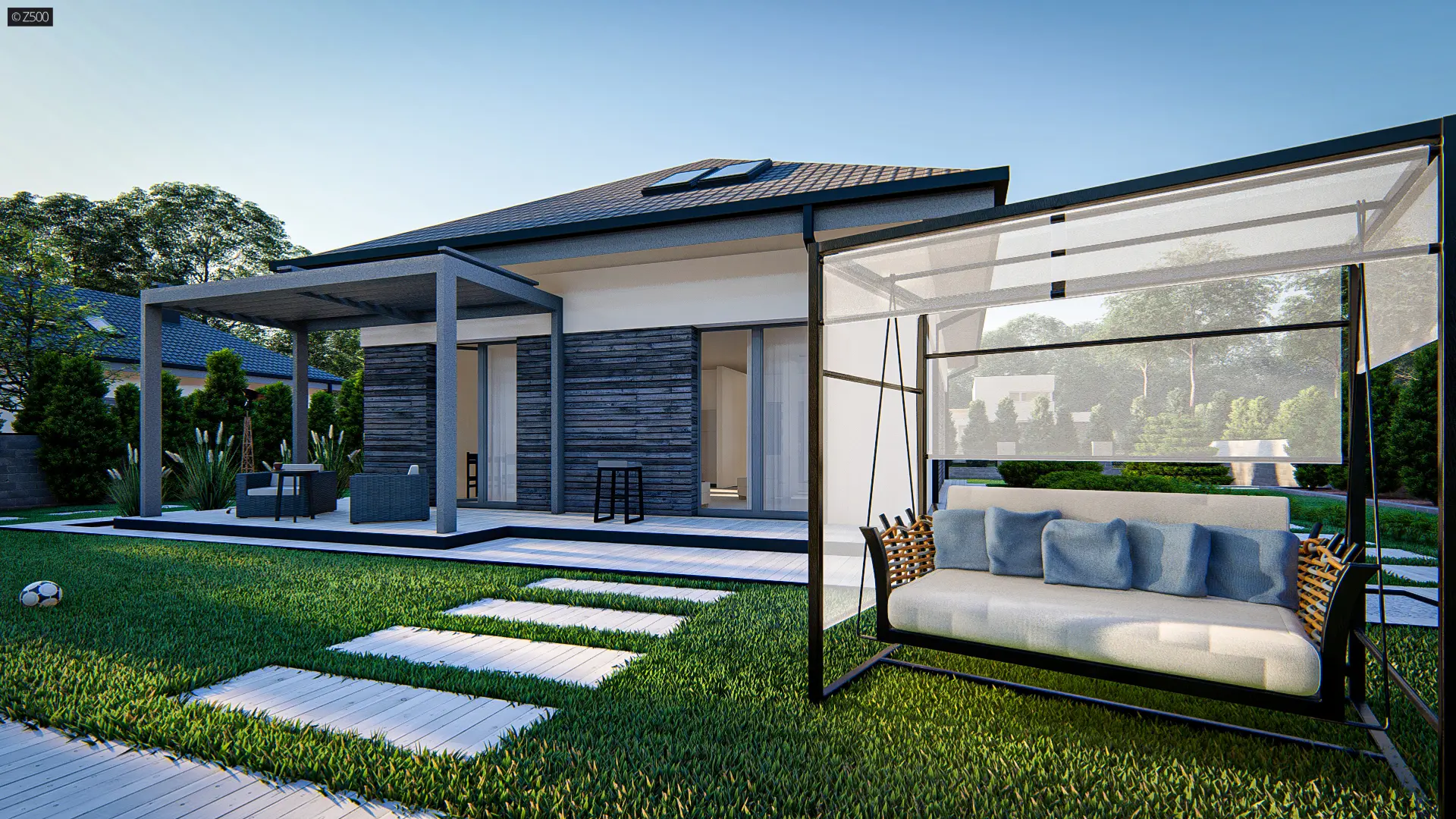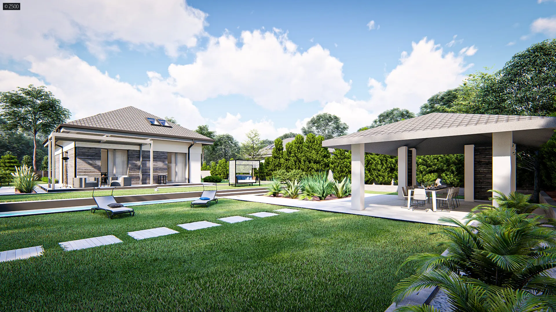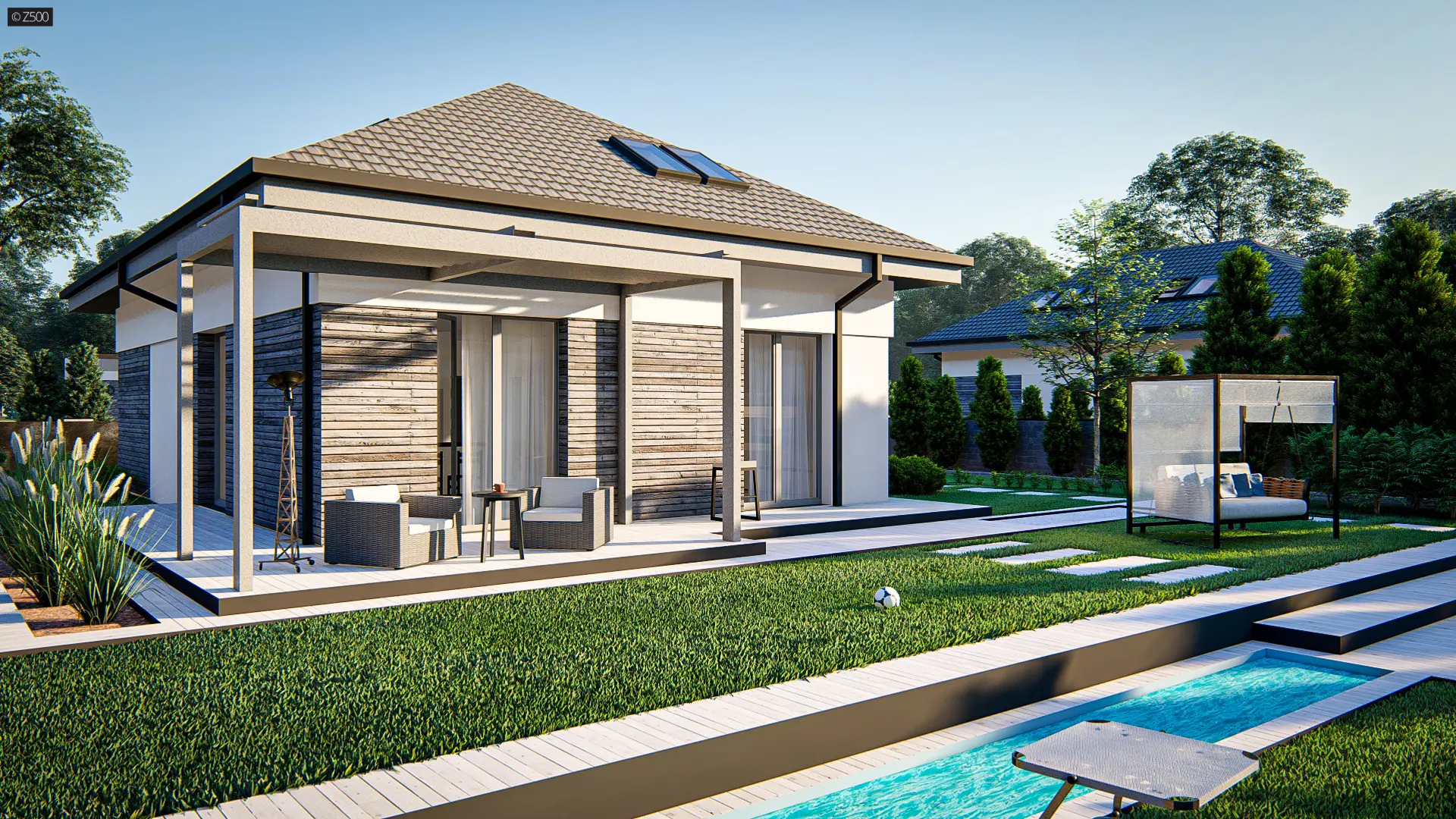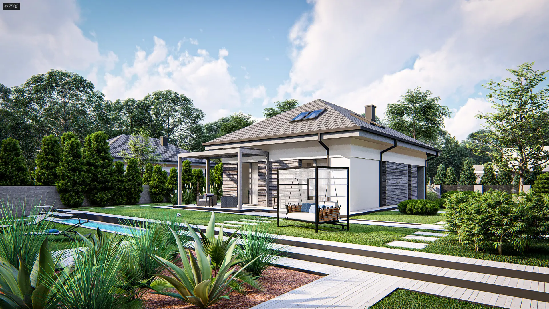 Dom z poddaszem użytkowym, kopertowym dachem i garażem jednostanowiskowym.