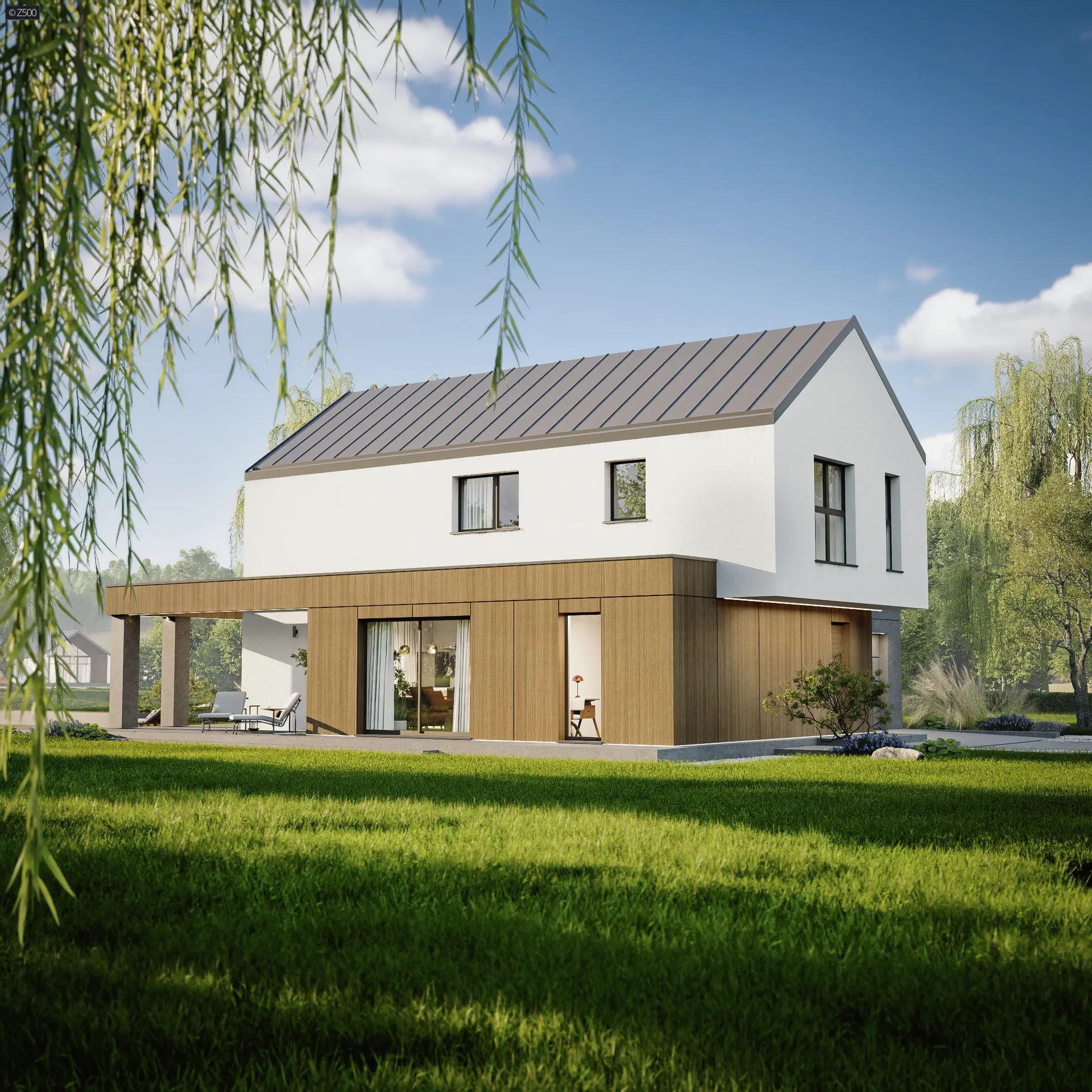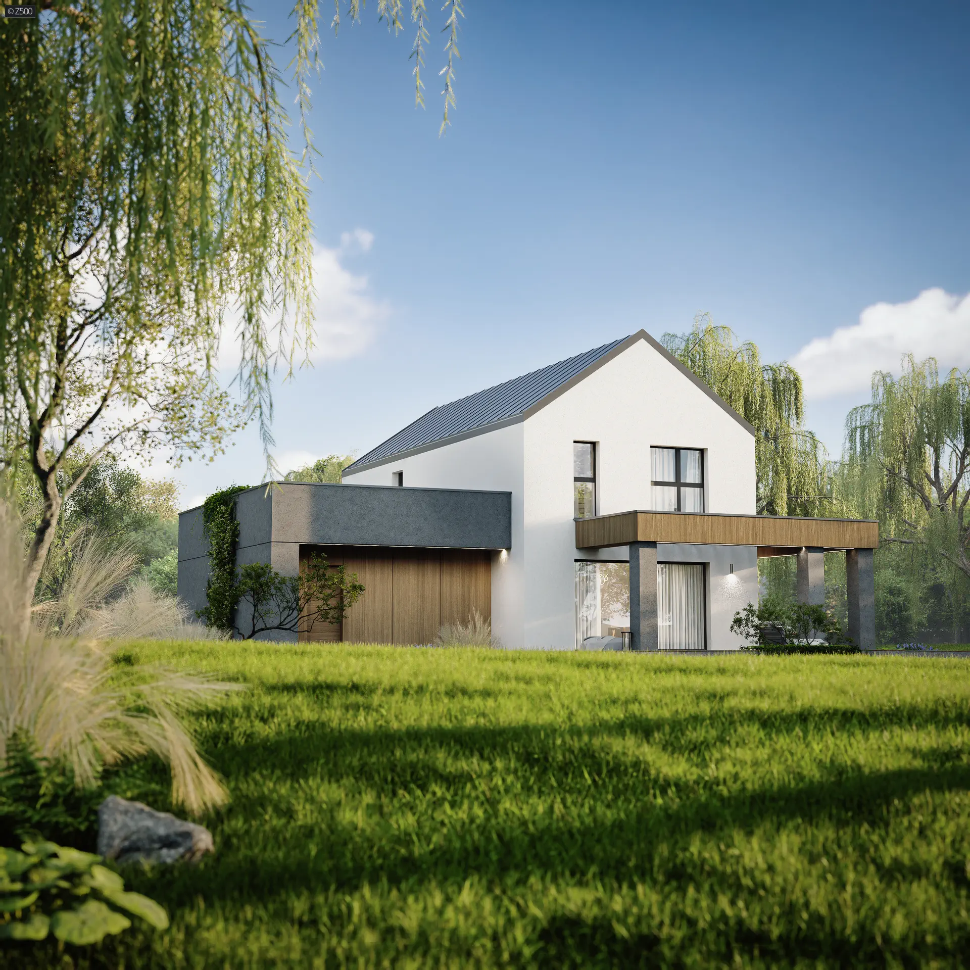 Energooszczędny dom w stylu nowoczesnej stodoły z tarasem nad garażem