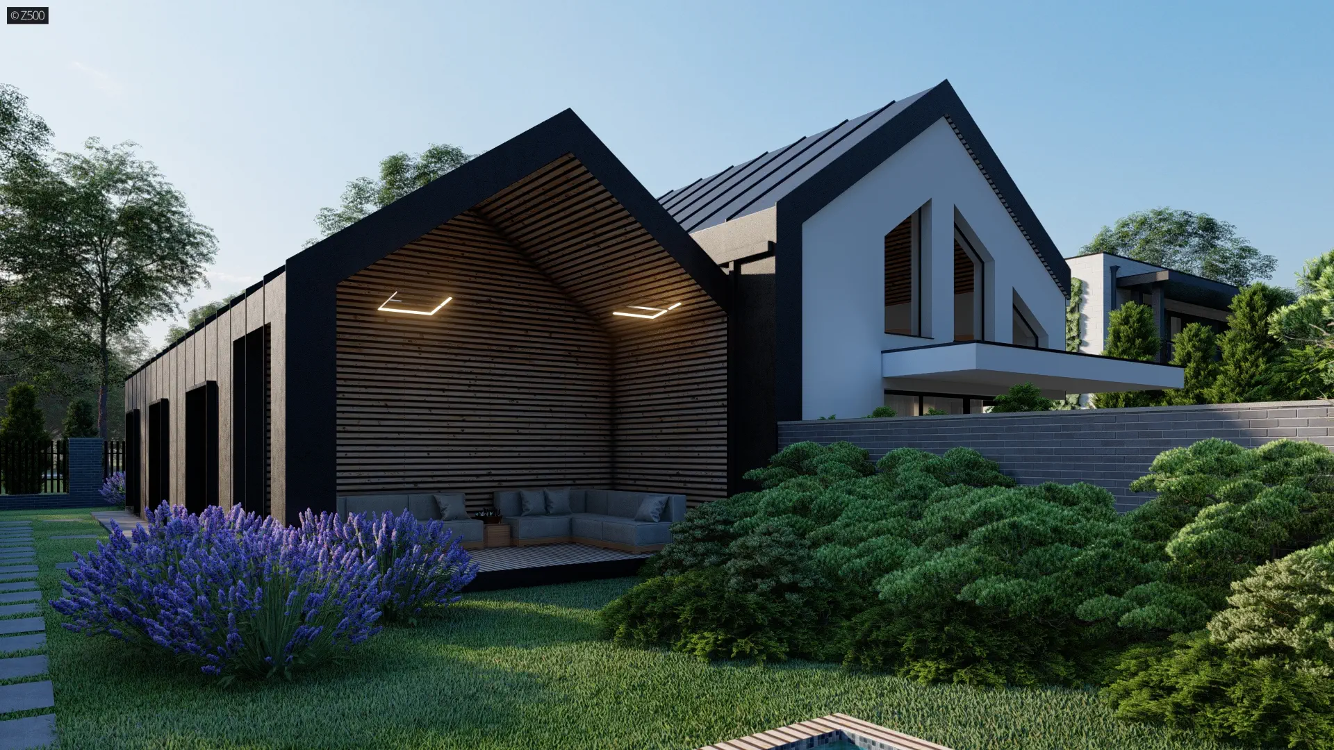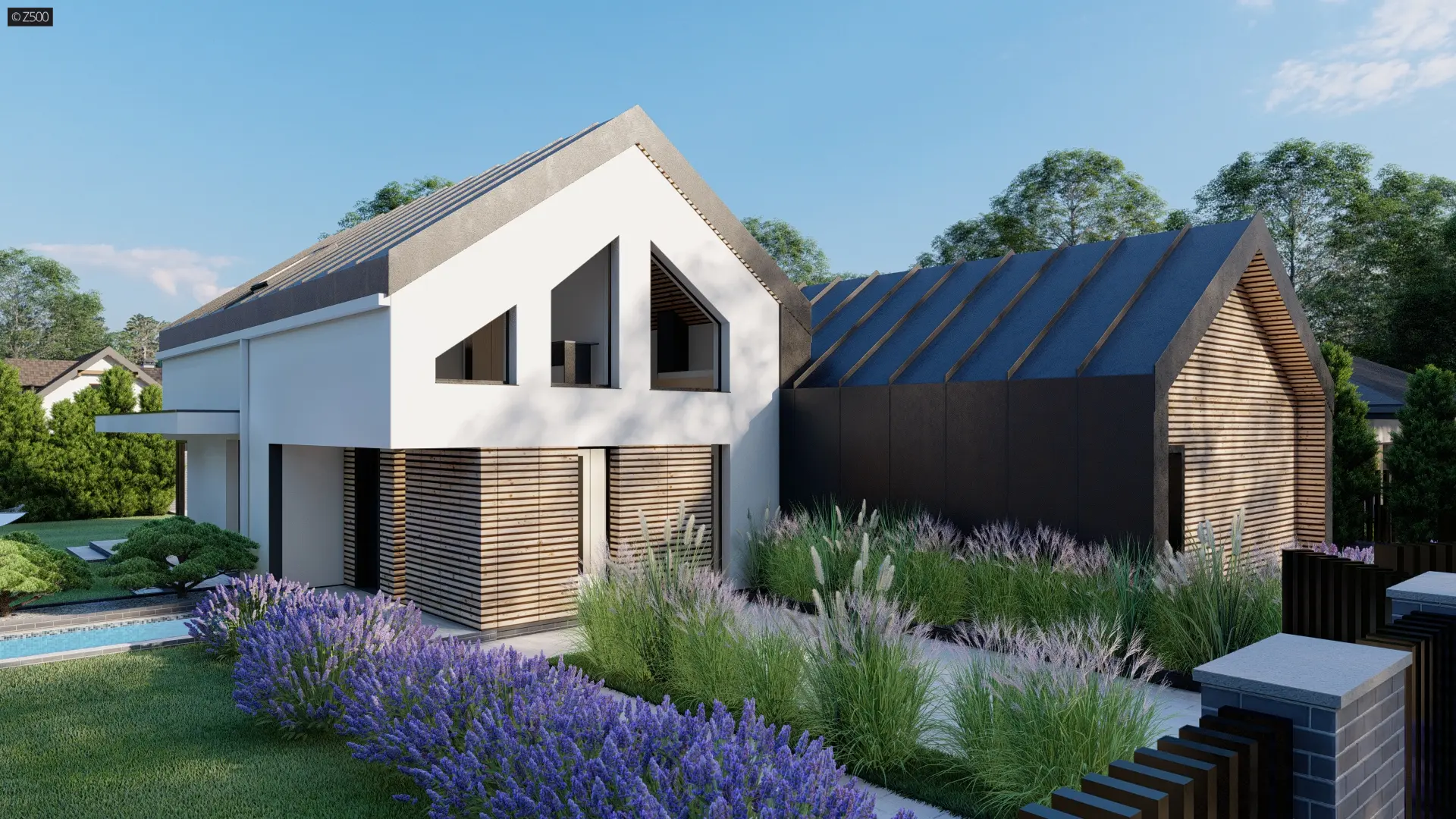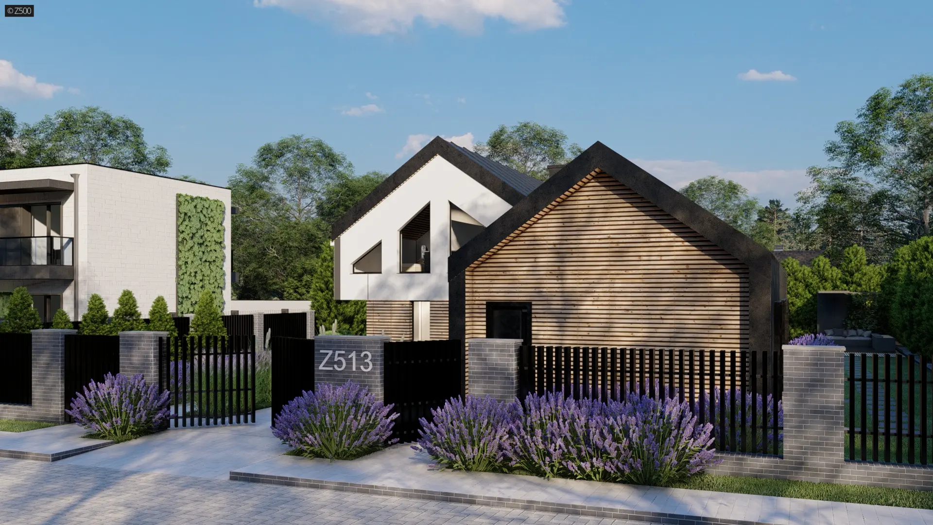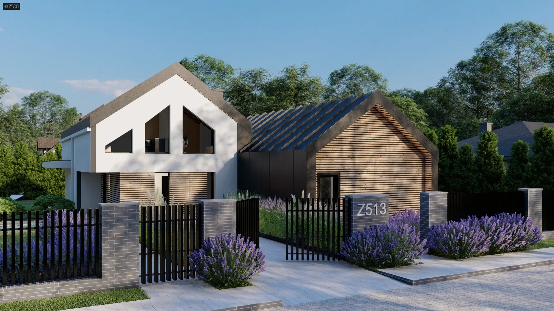 Z513 to dom z użytkowym poddaszem w stylu nowoczesnej stodoły z niezależnym podwójnym wejściem. Elewacja budynku została wykonana z białego tynku strukturalnego z elementami drewna i przeszkleniami.