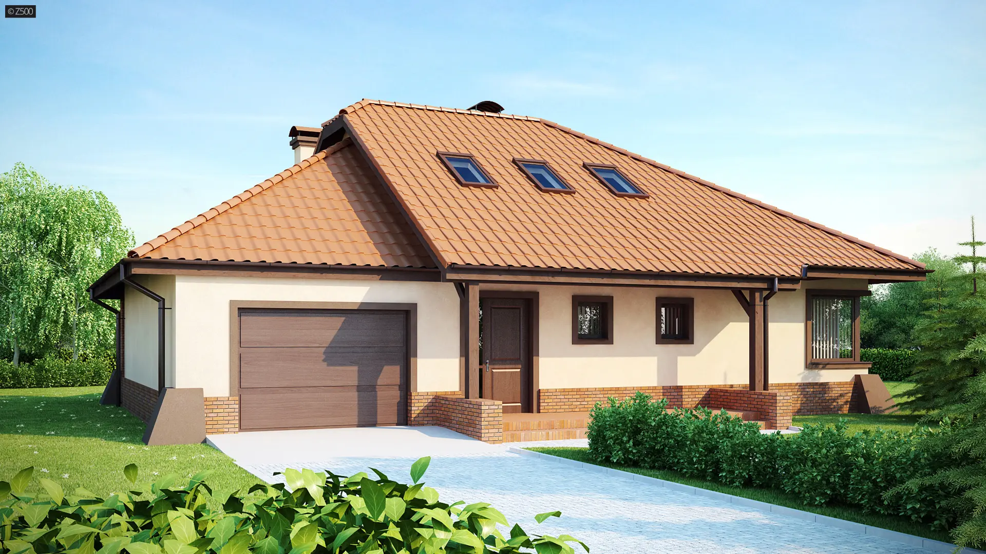 Projekt domu z użytecznym poddaszem, garażem i falistym dachem.