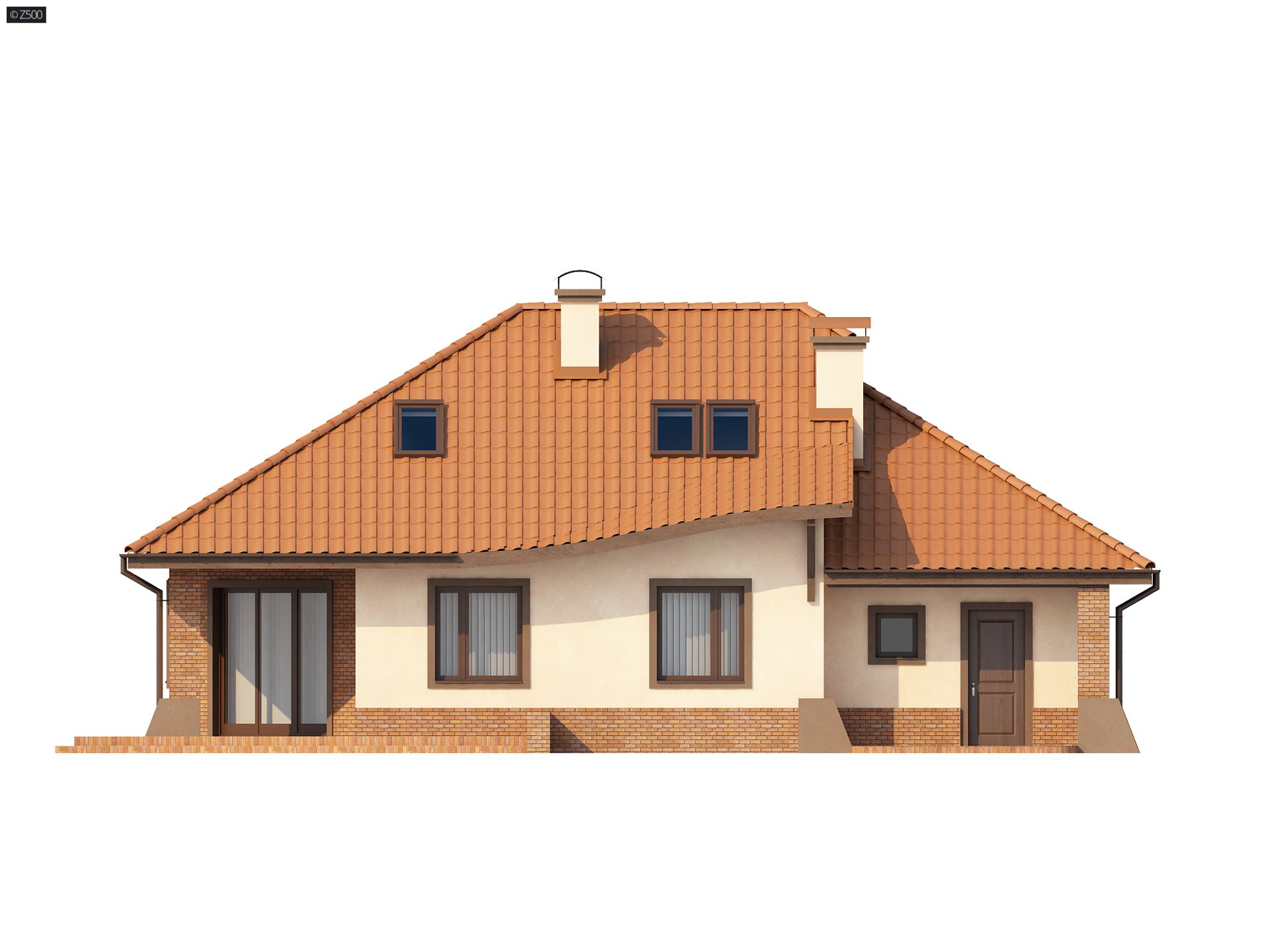 Z centralnego holu na parterze mamy dostęp do wszystkich pomieszczeń, w tym do pokoju gościnnego i wc z natryskiem. Część dzienną stanowi salon, który jest ciekawie rozplanowany i podzielony na strefy: jadalną i wypoczynkową. Dodatkowo przy samej kuchni przewidziano obszerną spiżarnię doświetloną oknem. W lewej części domu znajduje się garaż z pomieszczeniem gospodarczym dostępnym od zewnątrz. Poddasze domu, to wygodna przestrzeń nocna składająca się trzech sypialni i łazienki. W pokojach przewidziano miejsce na szafy. Duża łazienka ma dostęp do praktycznego pomieszczenia, które można przeznaczyć na pralnię i suszarnie.
