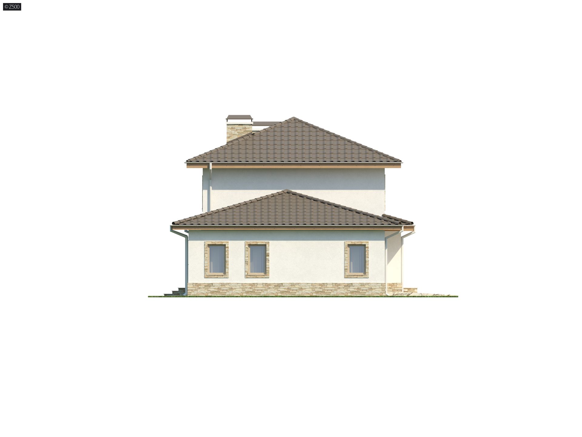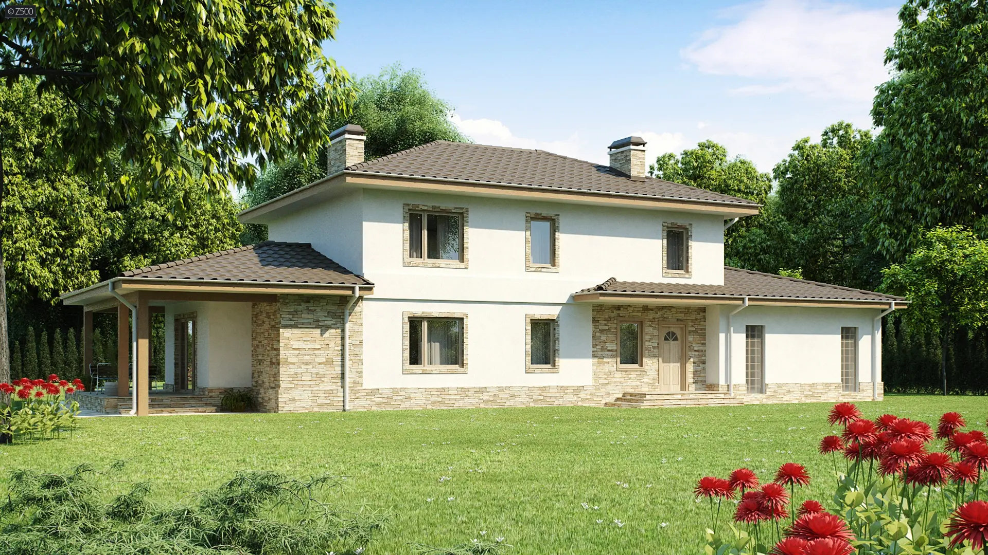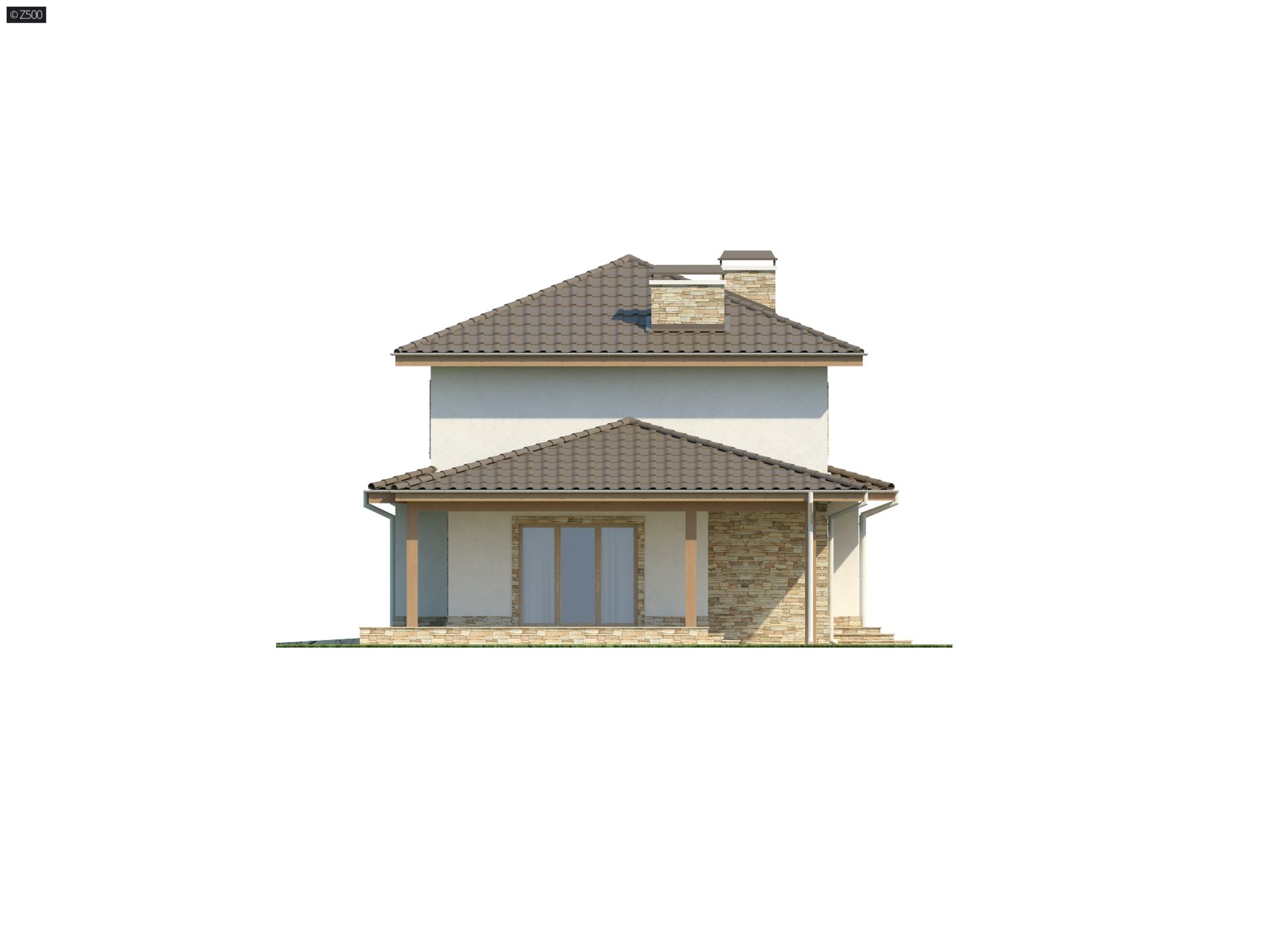 Z74 to projekt domu piętrowy z bogatym układem funkcjonalnym. Bryła budynku, rozbudowana w części parterowej, podzielona jest na część dzienną z tarasem i intymna strefę z przejściem do garażu