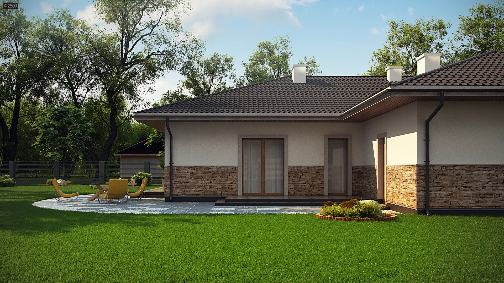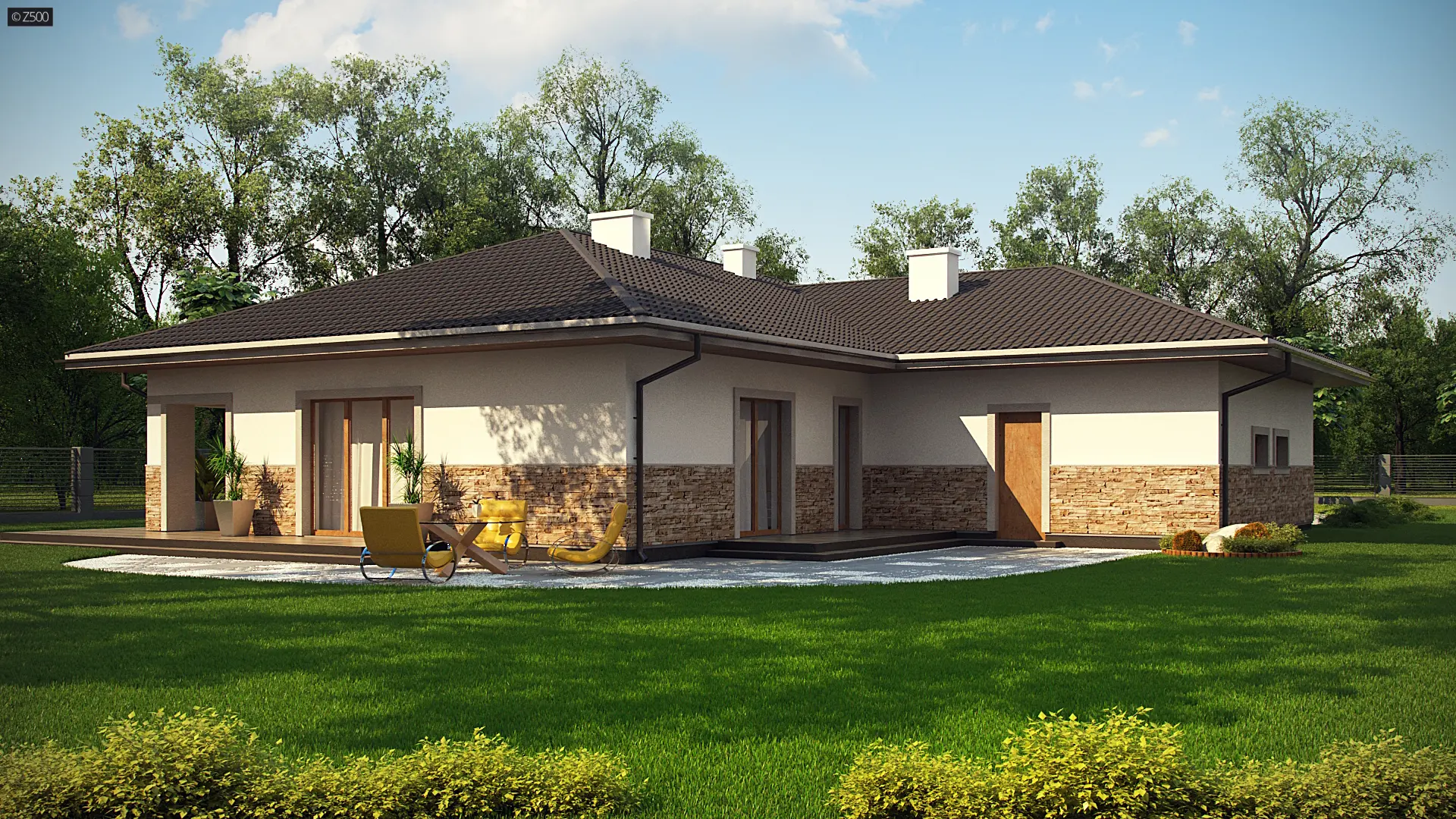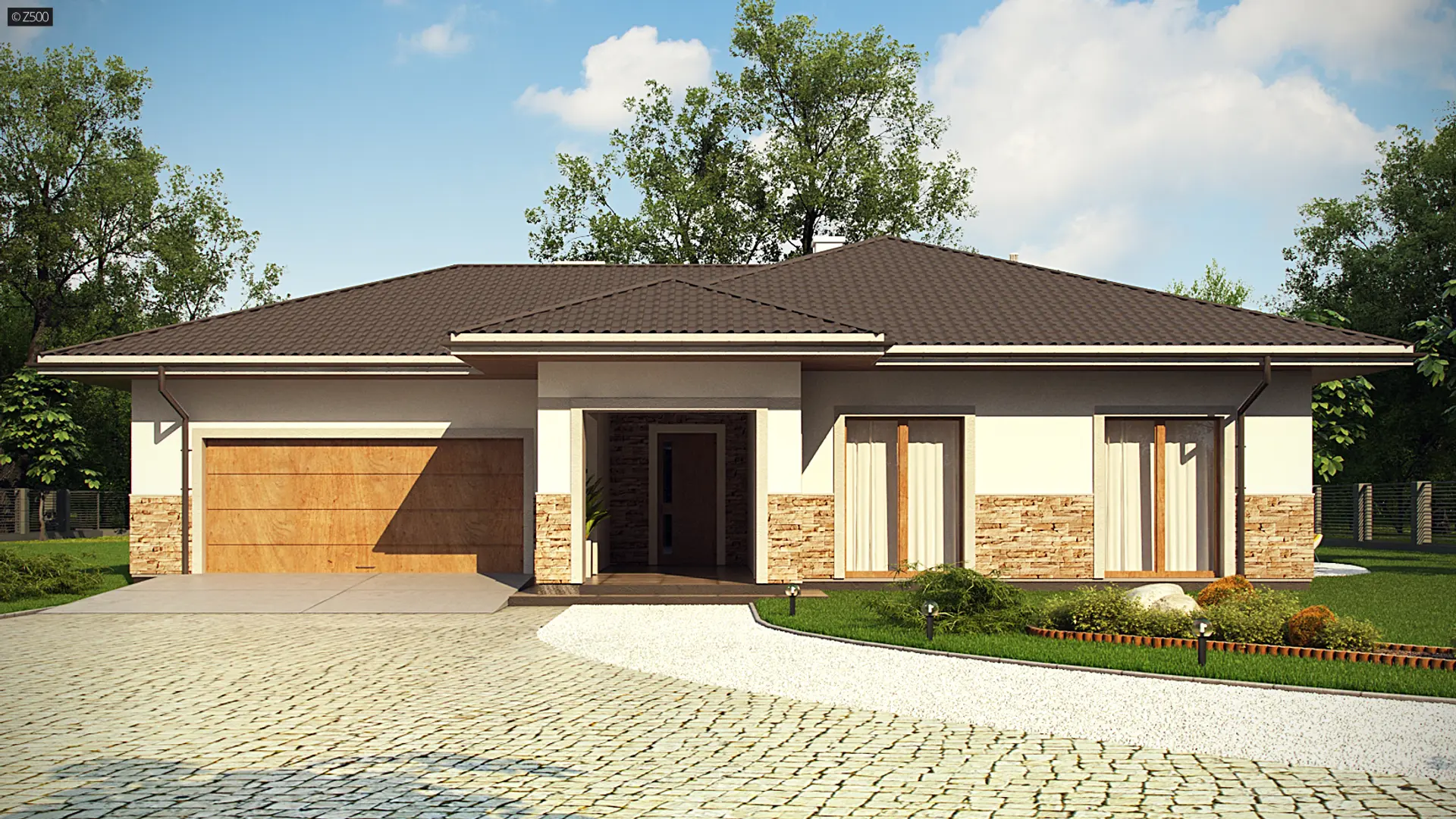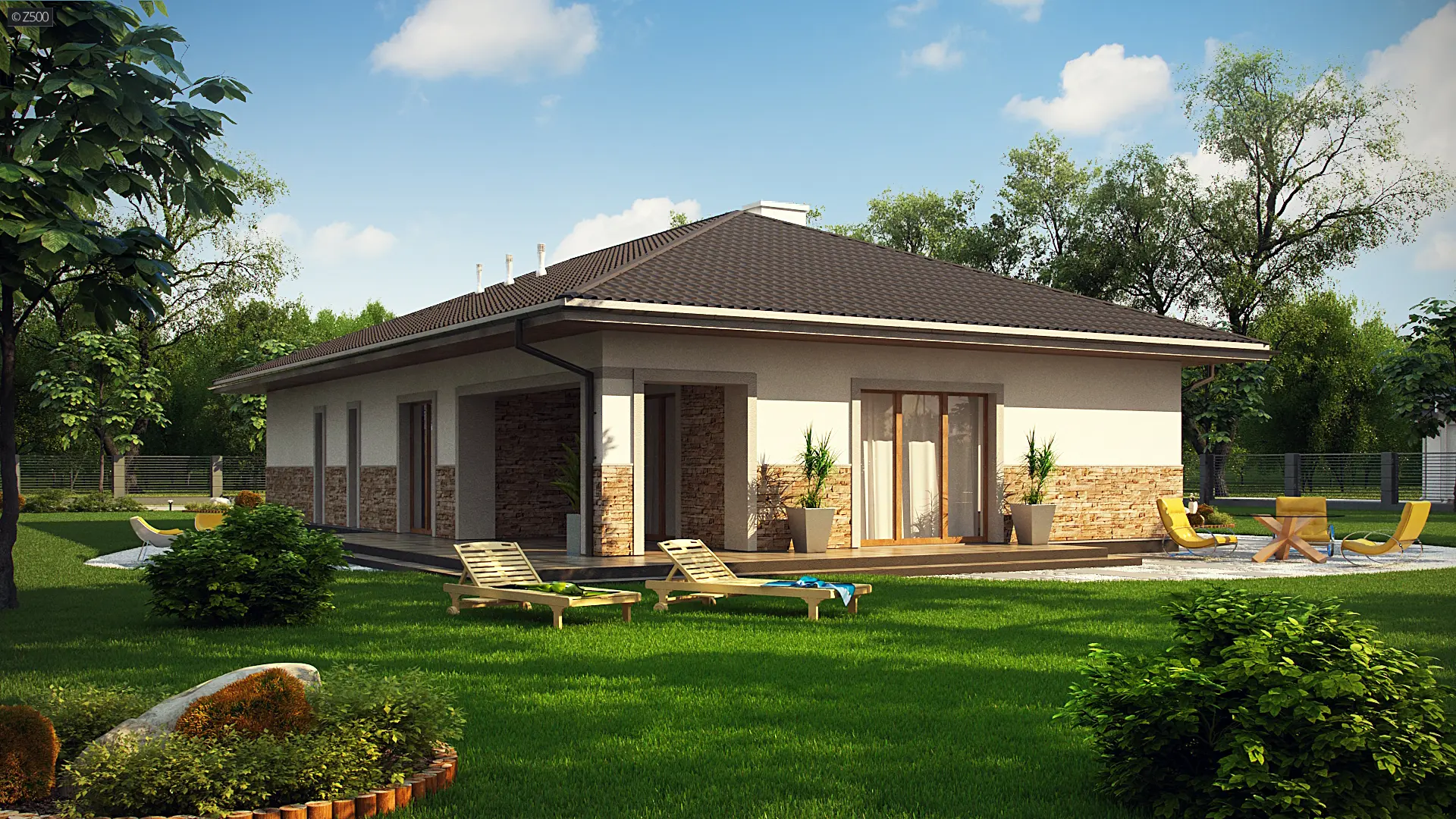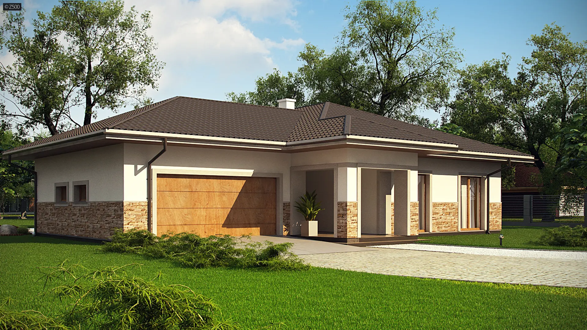 Projekt Z80- to dom o prostej, parterowej bryle z subtelnym detalem wykończenia elewacji w postaci naturalnej okładziny kamiennej. Jest to budynek, który klimatem nawiązuje do architektury skandynawskiej.