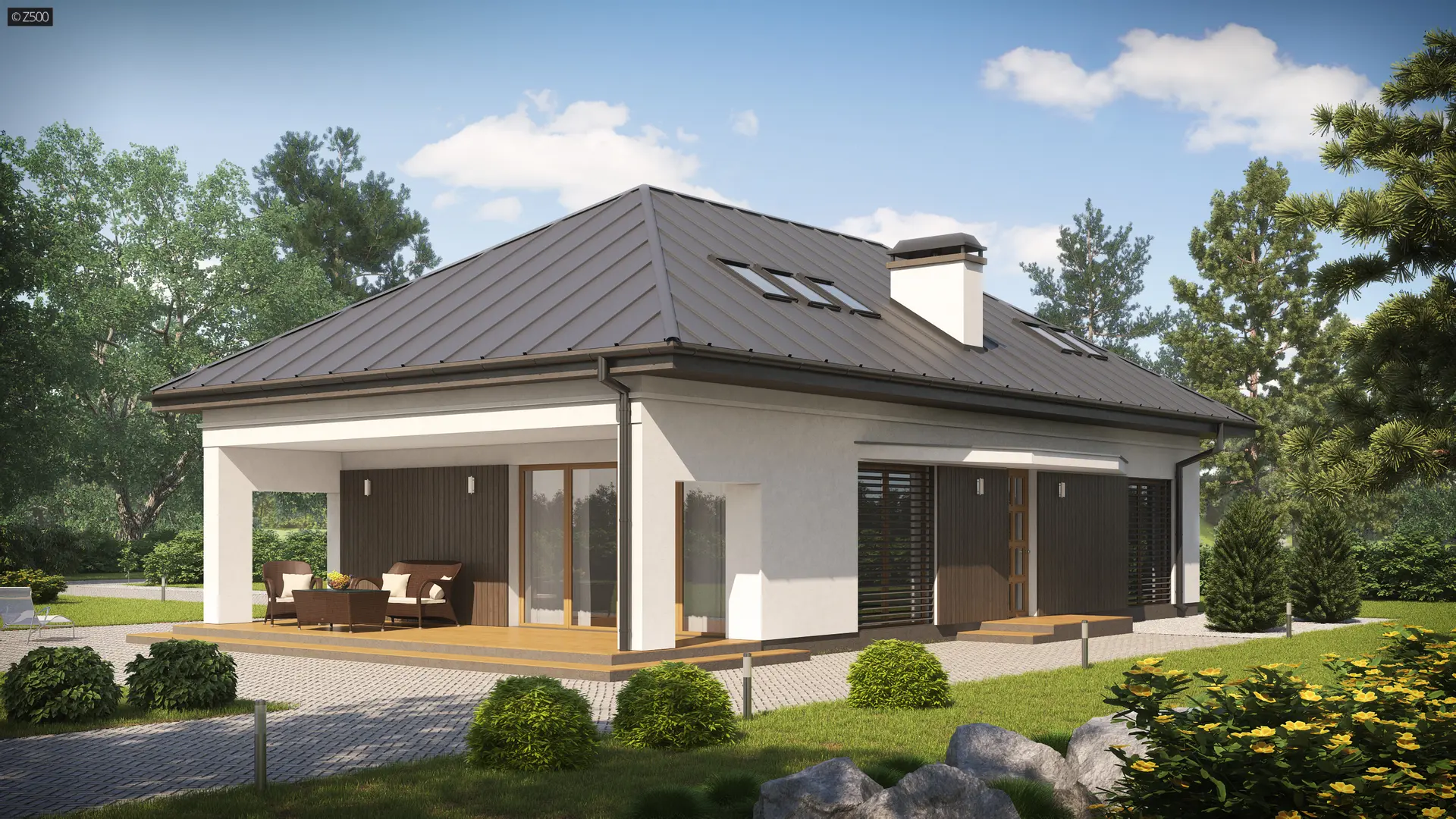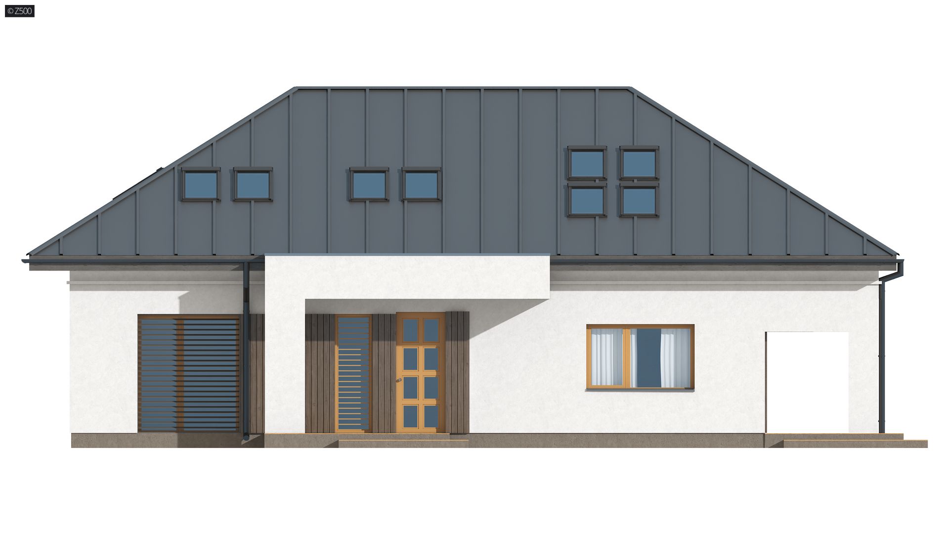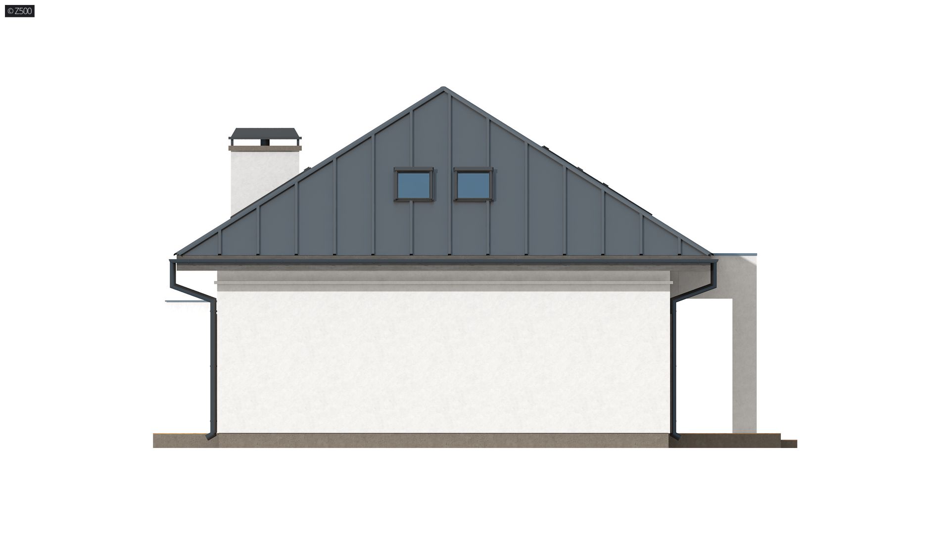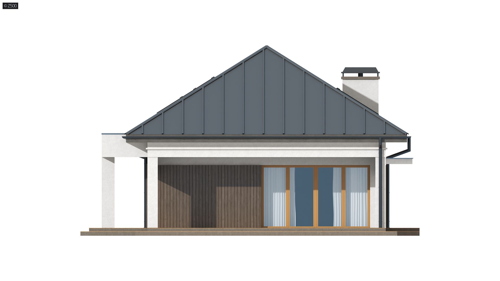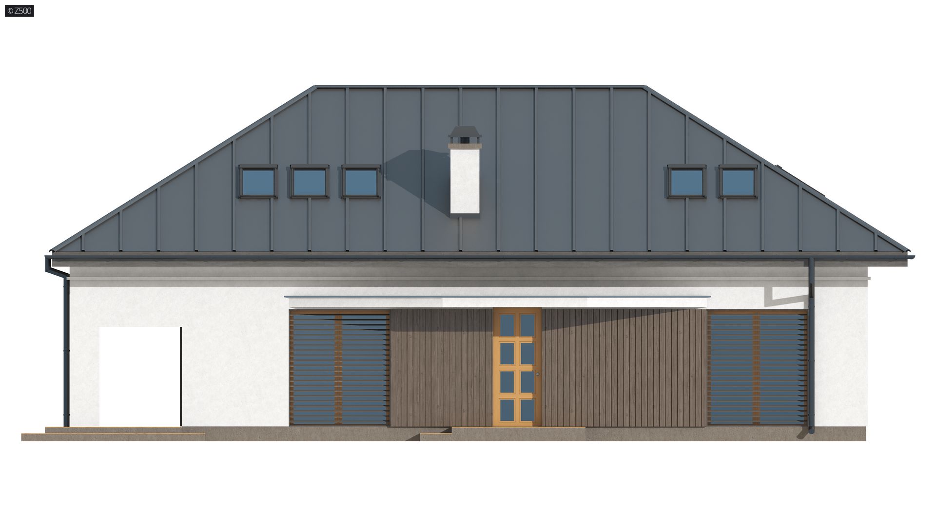 Dom z poddaszem na planie prostokąta z dachem kopertowym, 5 pokojami i tarasem