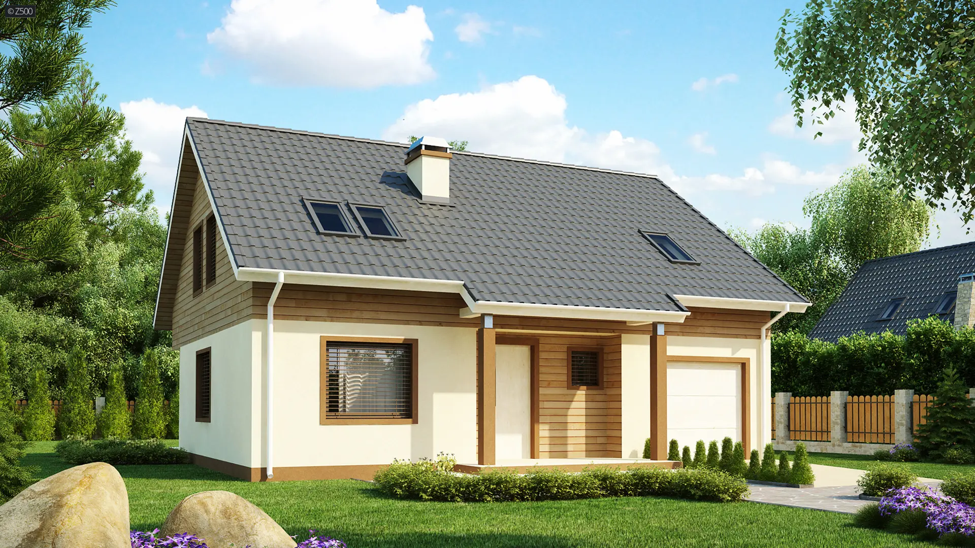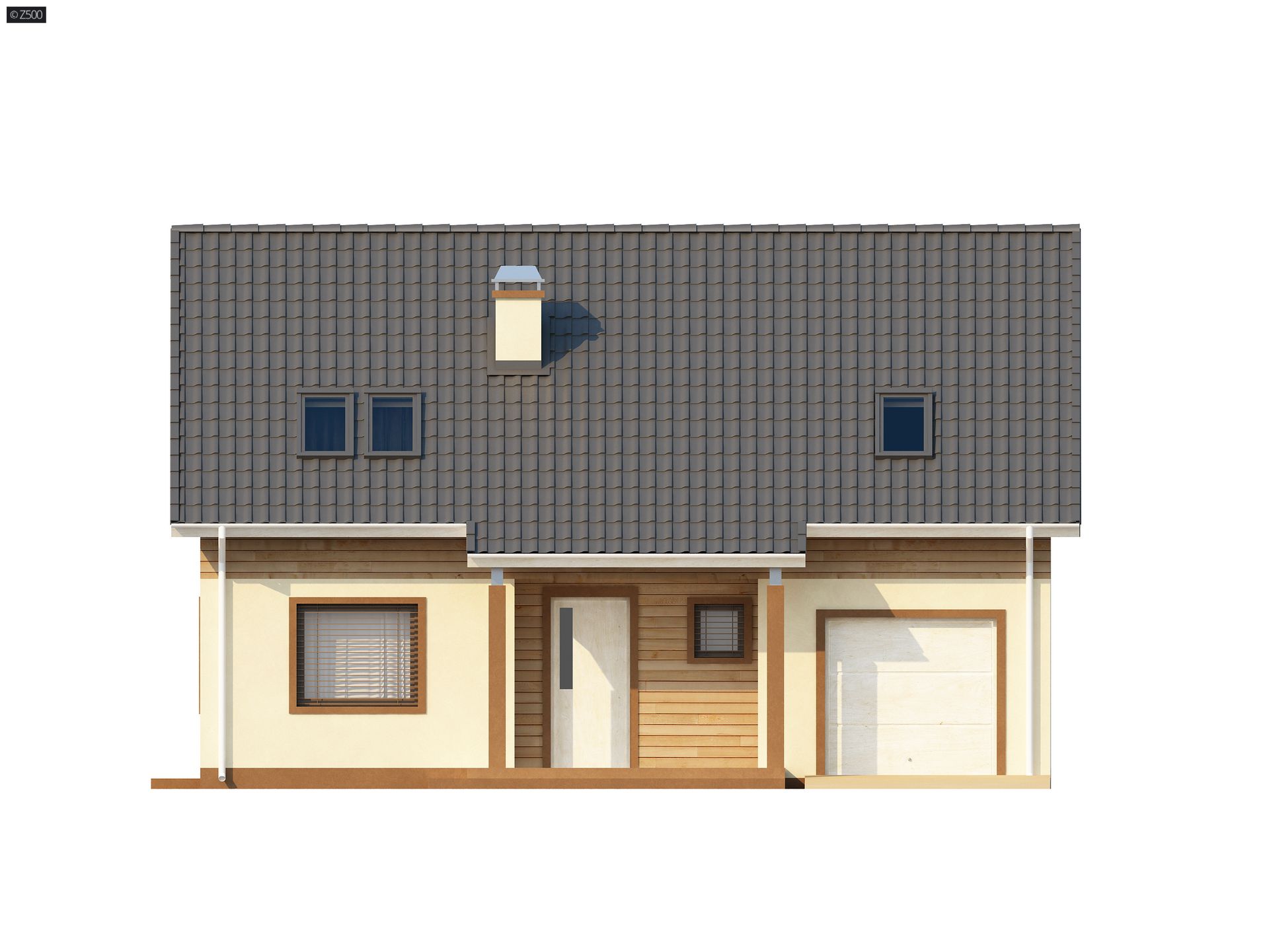 Nieduży dom z poddaszem, dachem dwuspadowym, kuchnią od frontu, garażem i PG