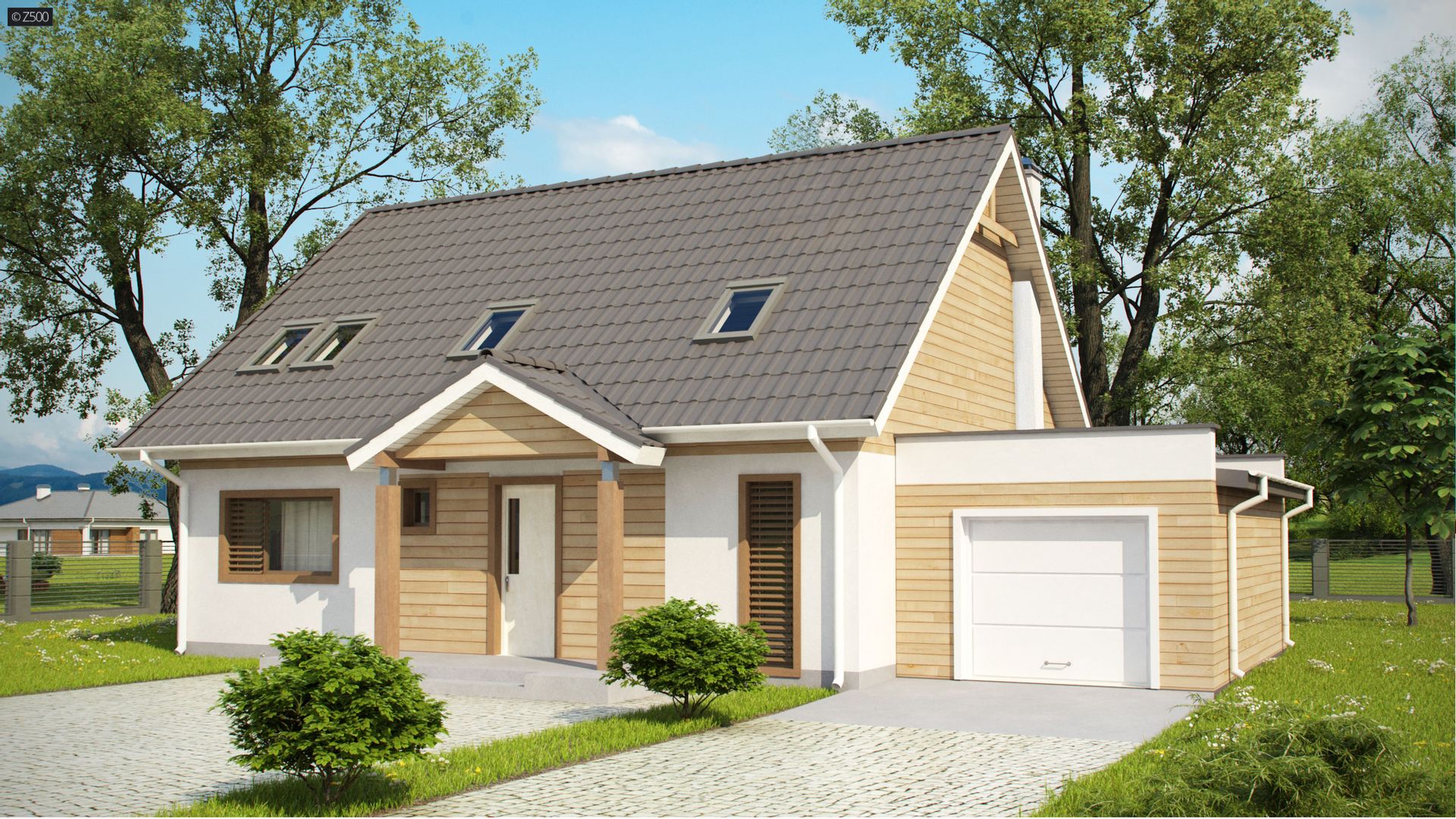 Z95 GL to dom z użytkowym poddaszem oraz garażem po prawej stronie. Elewacja została wykonana z jasnego tynku strukturalnego.