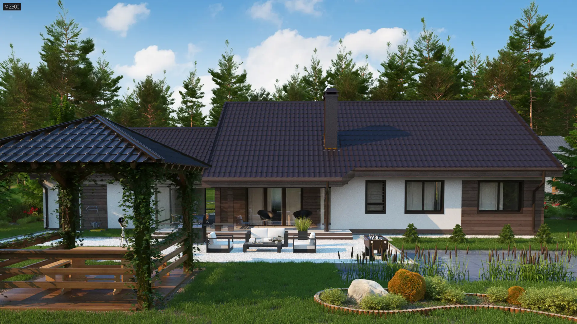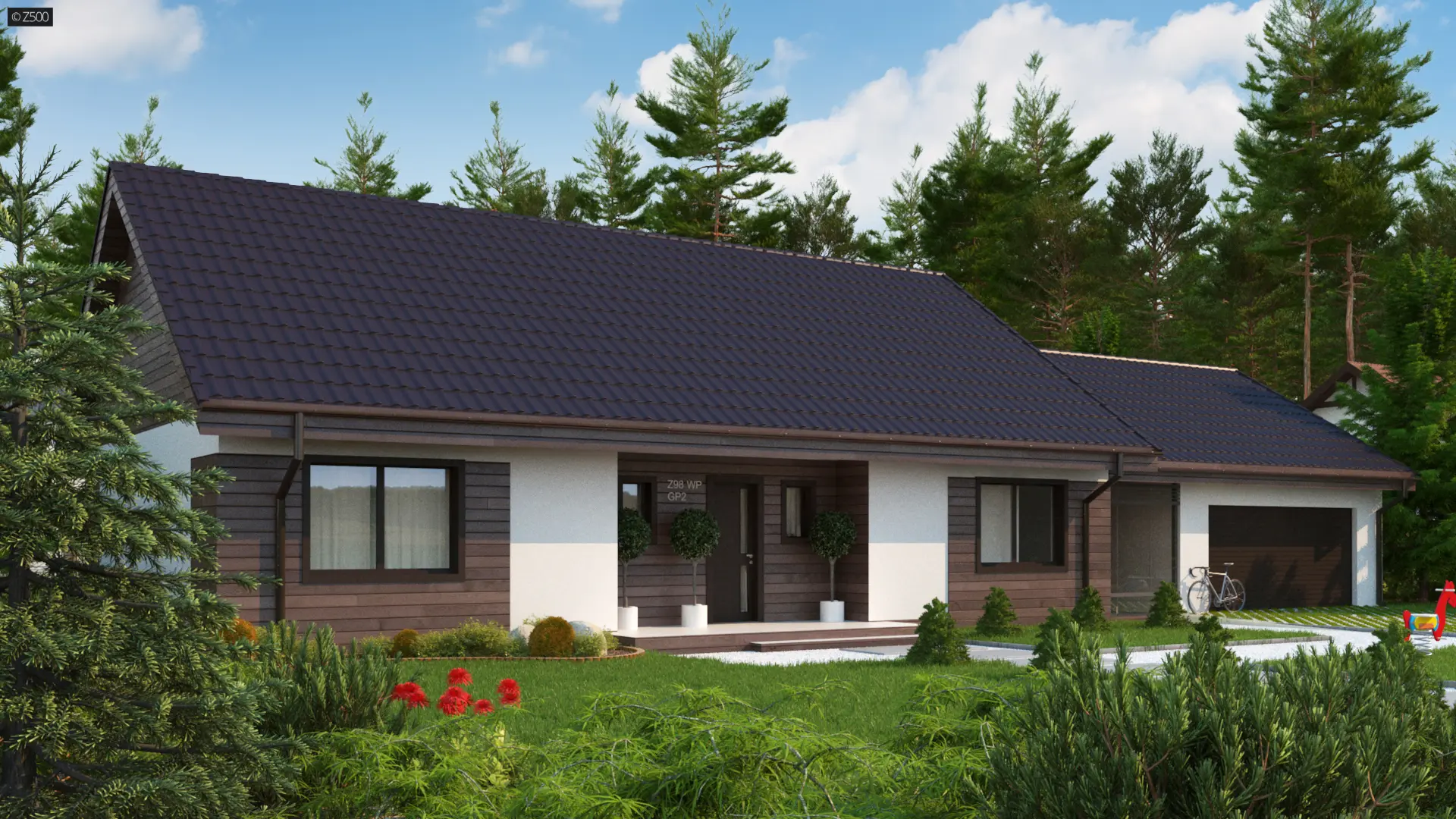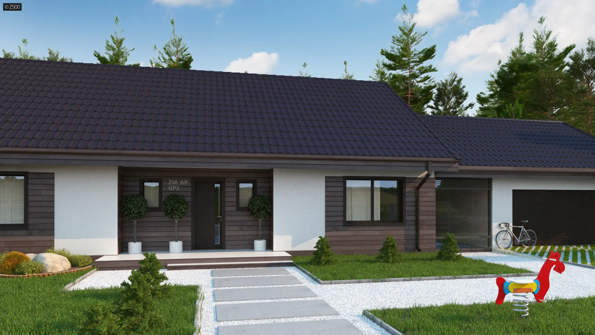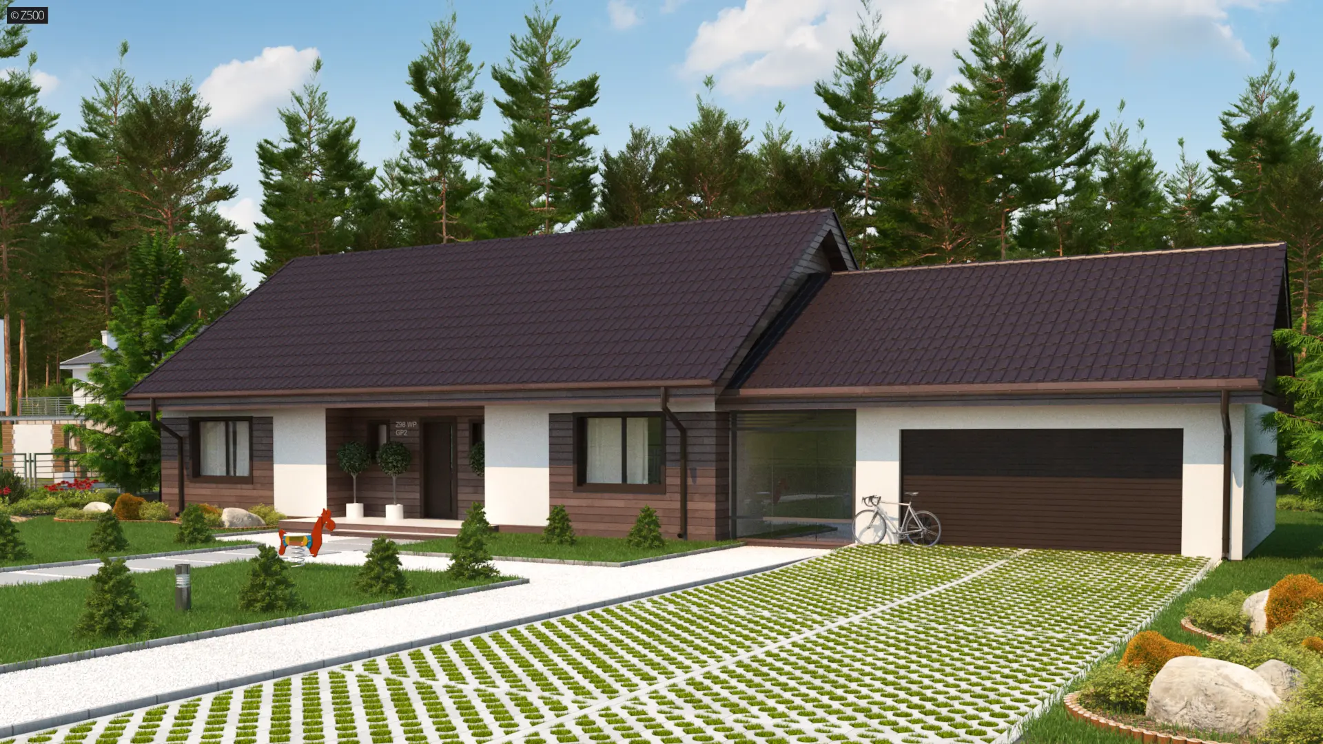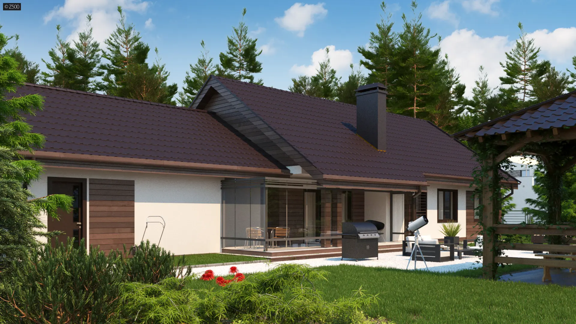 Parterowy dom z dachem dwuspadowym, garażem, trzema sypialniami i tarasem