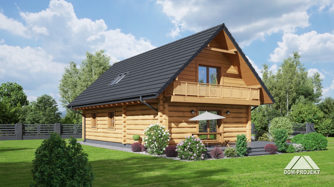 Dom z bali drewnianych. Duży salon z aneksem kuchennym, kominkiem, wyjściem na taras i schodami na poddasze. Dwa pokoje, dwie łazienki, dwa wiatrołapy. Na poddaszu trzy pokoje, dwie łazienki, balkon i komunikacja. Zwarta bryła budynku i dach dwuspadowy sprzyjają szybkiej i taniej budowie i niskim kosztom eksploatacji.