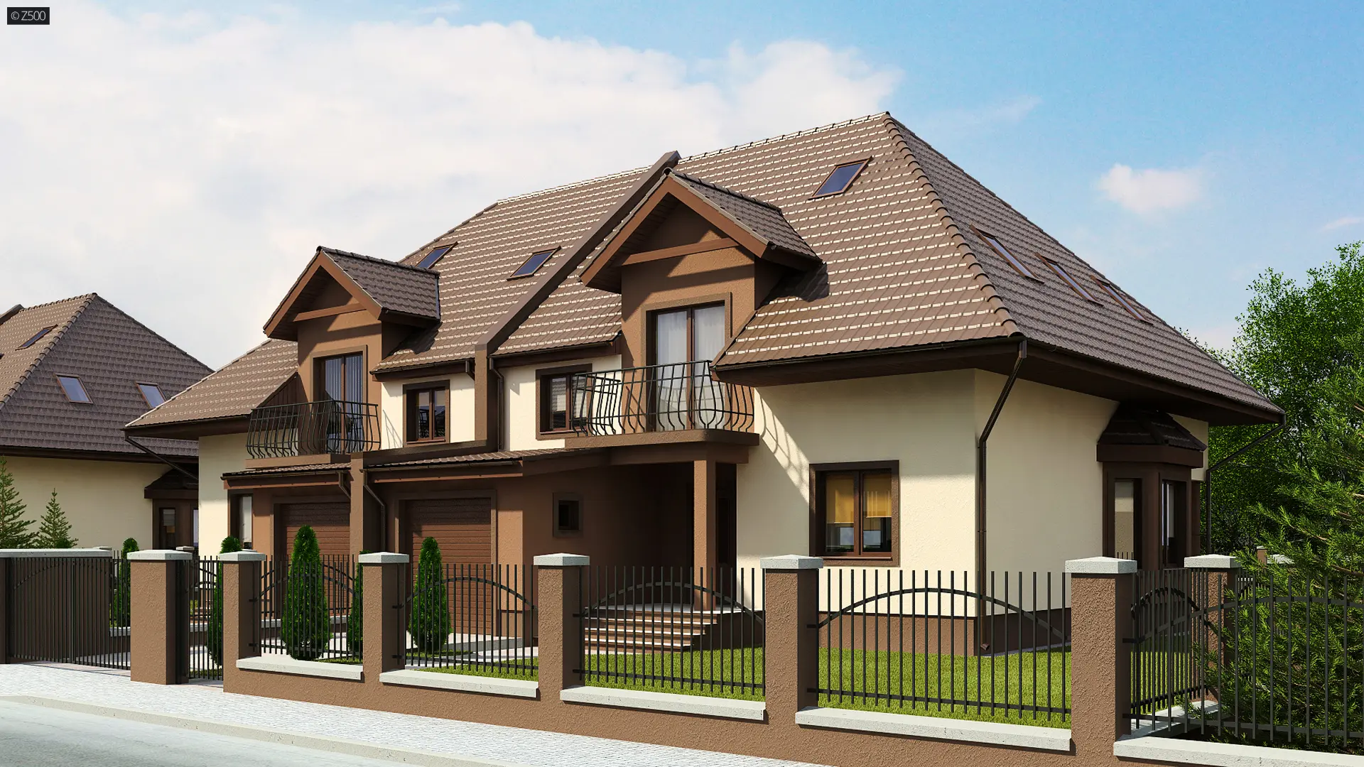 ZB1 to projekt w zabudowie bliźniaczej, który dzięki wbudowanemu w bryłę garażowi, zmieści się na stosunkowo wąskiej działce. Ciekawym, urozmaicającym bryłę elementem są lukarny z balkonami, zaprojektowane zarówno od frontu, jak i od strony ogrodu.