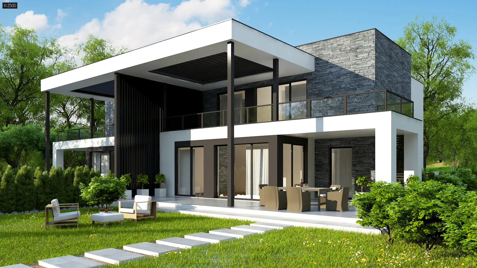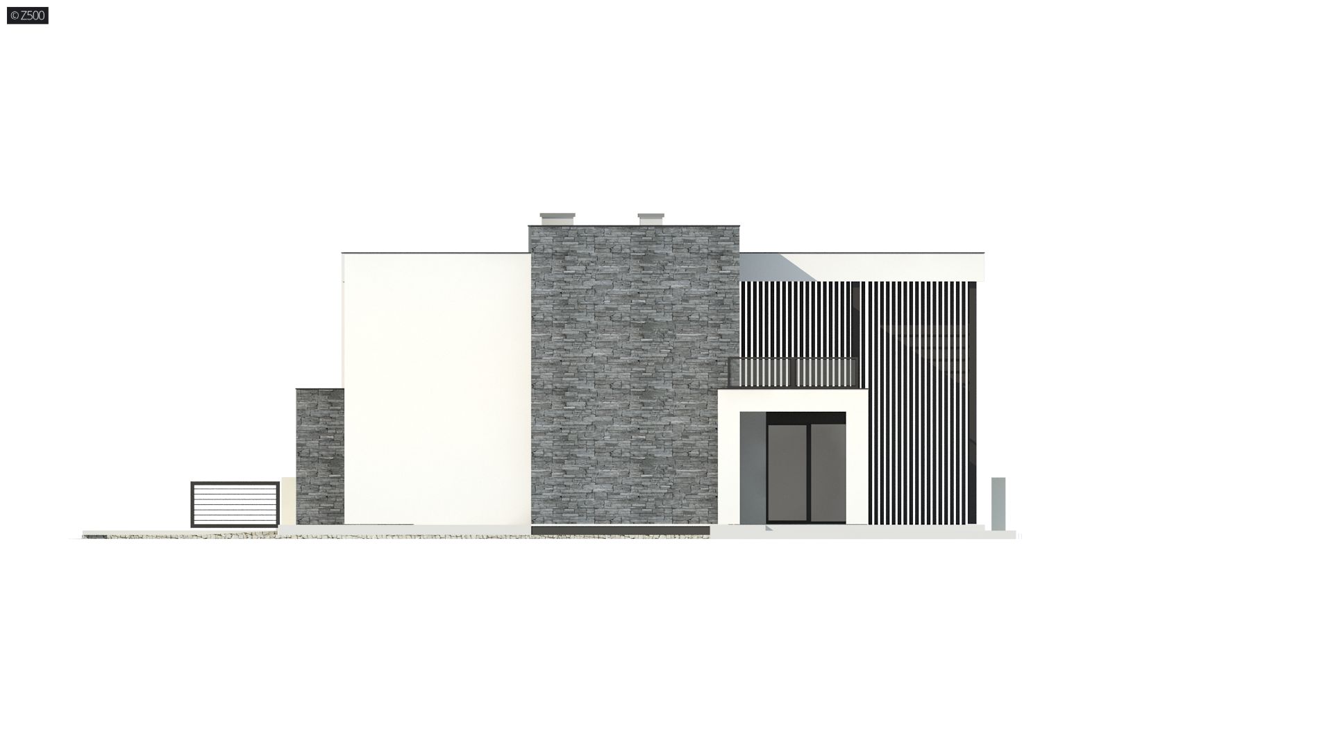 Powierzchnia wynosi ok. 140m2. Bryła prosta, geometryczna, z wypuszczonymi zadaszeniami, biało-grafitowa, z pionowymi słupkami oddzielającymi sąsiada i stanowiącymi jednocześnie pergole, przykuje uwagę nie jednego przechodnia. W całym domu zamontowano okna do samej podłogi w celu maksymalnego doświetlenia pomieszczeń.