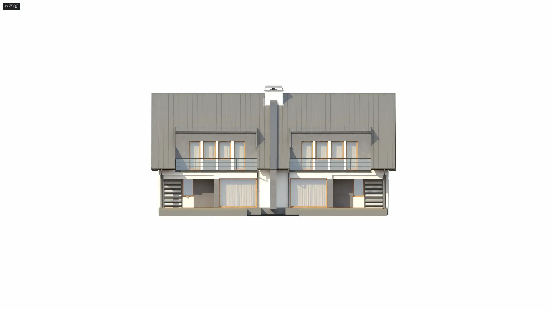 Projekt domu bliźniaka z garażem i użytkowym poddaszem.