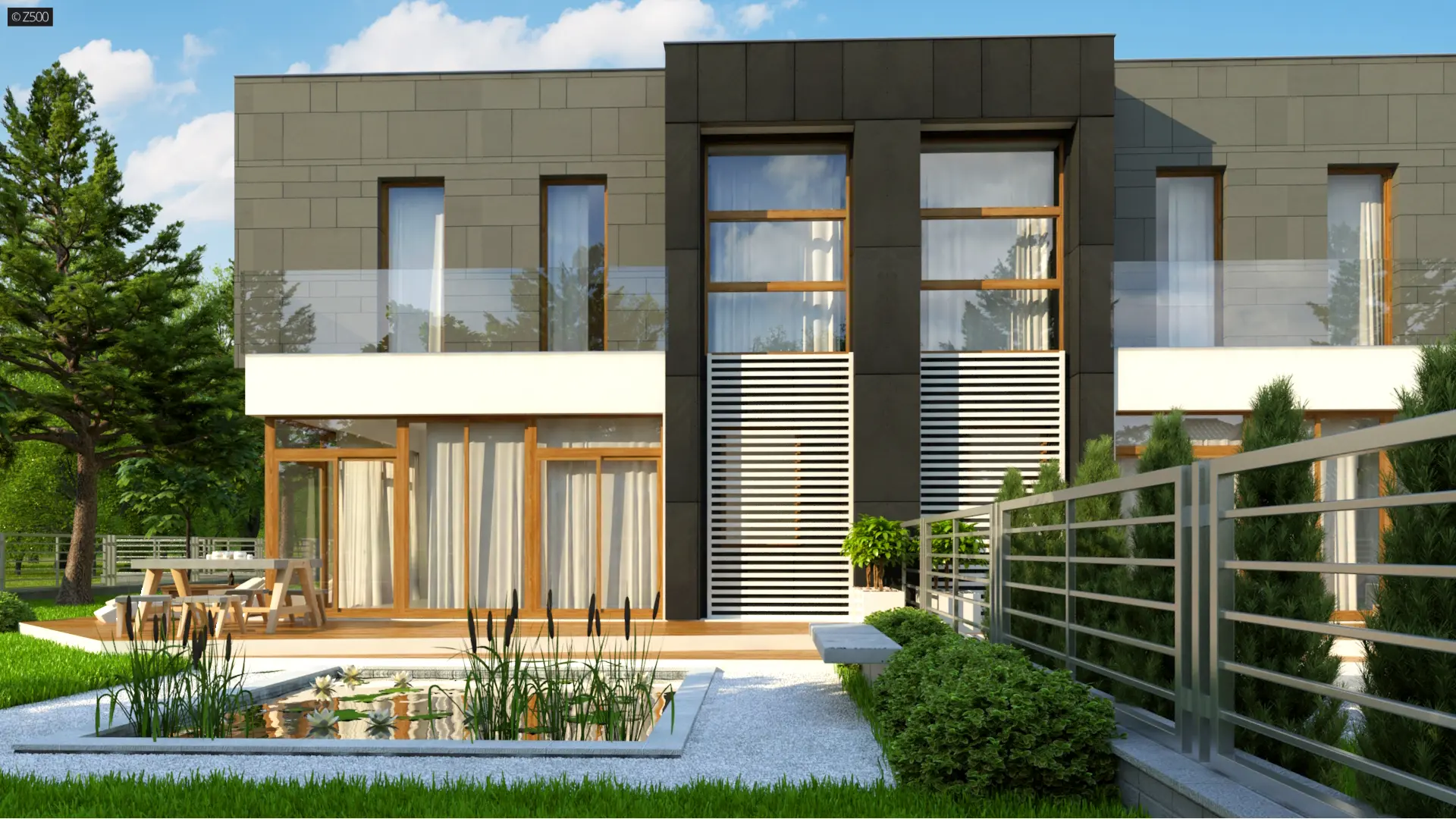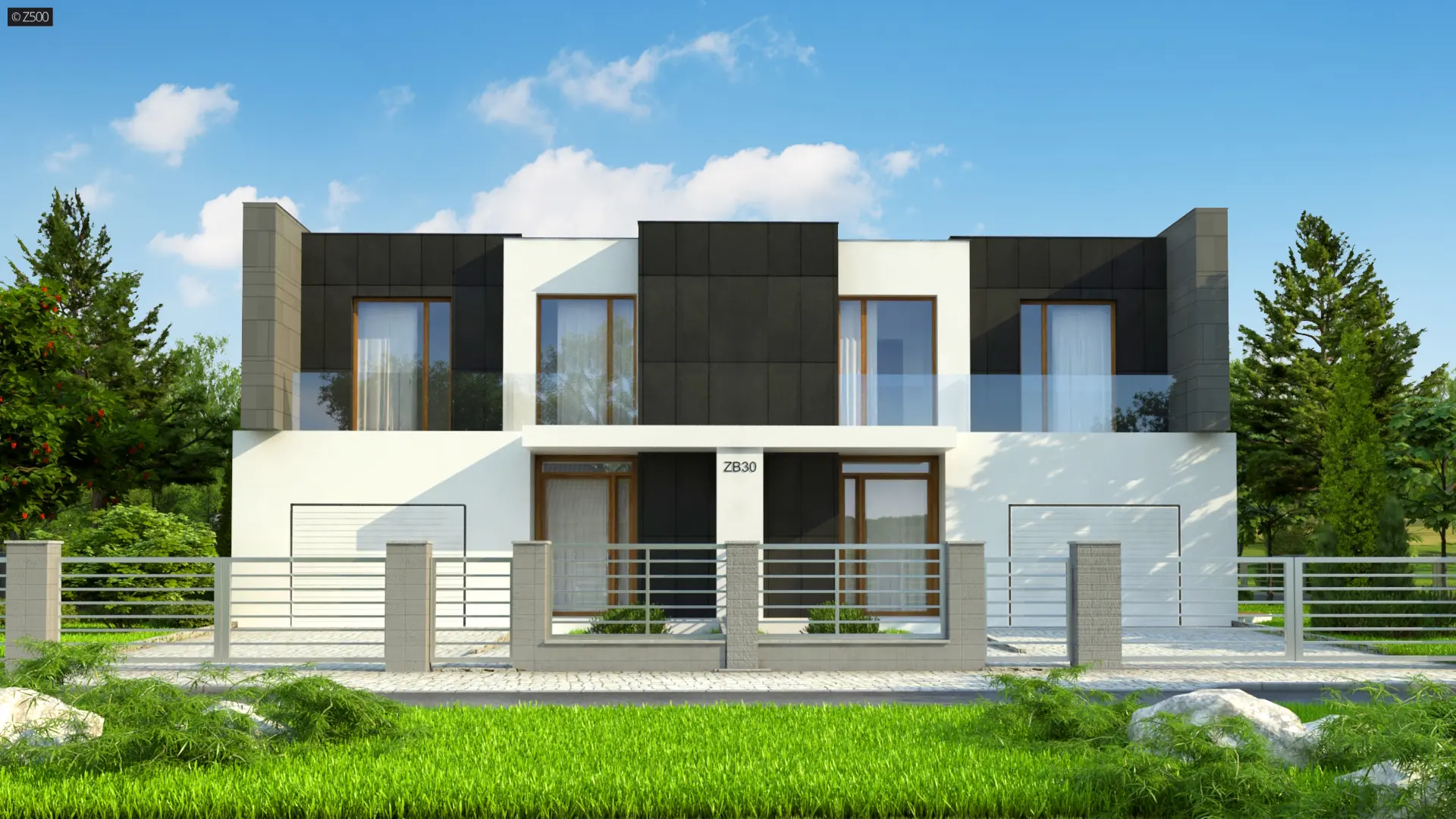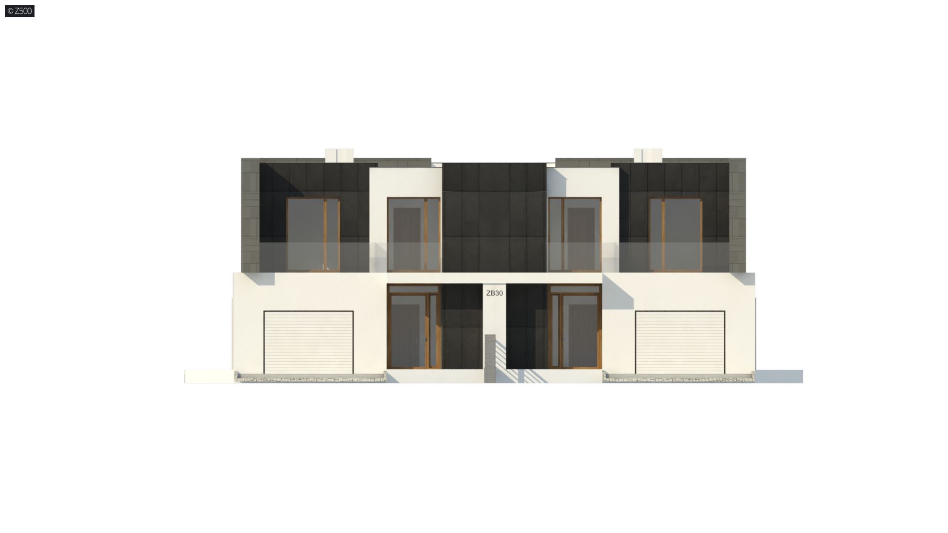 Propozycja projektu domu Z500 idealnie przystosowana do zabudowy bliźniaczej. Nowoczesne wykończenie elewacji podkreślono okładziną w odcieniach czerni, grafitu i szarości oraz zabezpieczeniem balkonów w postaci przeszklonej balustrady.