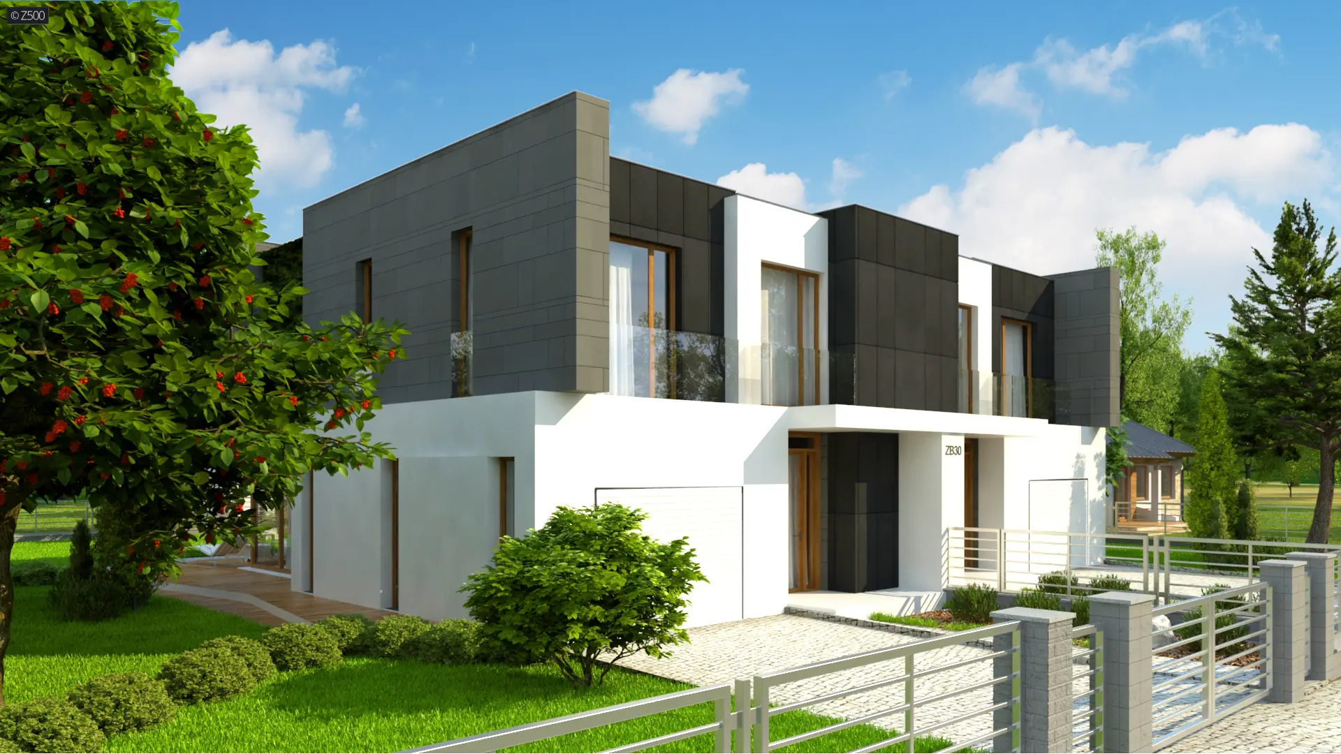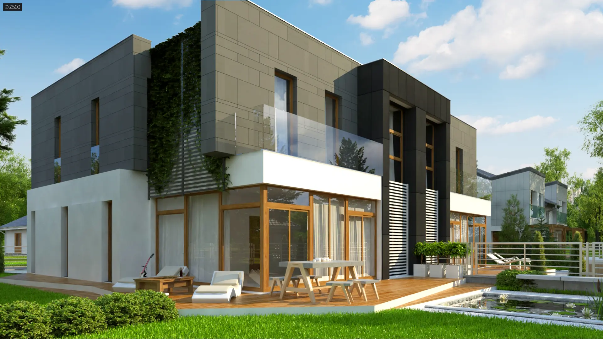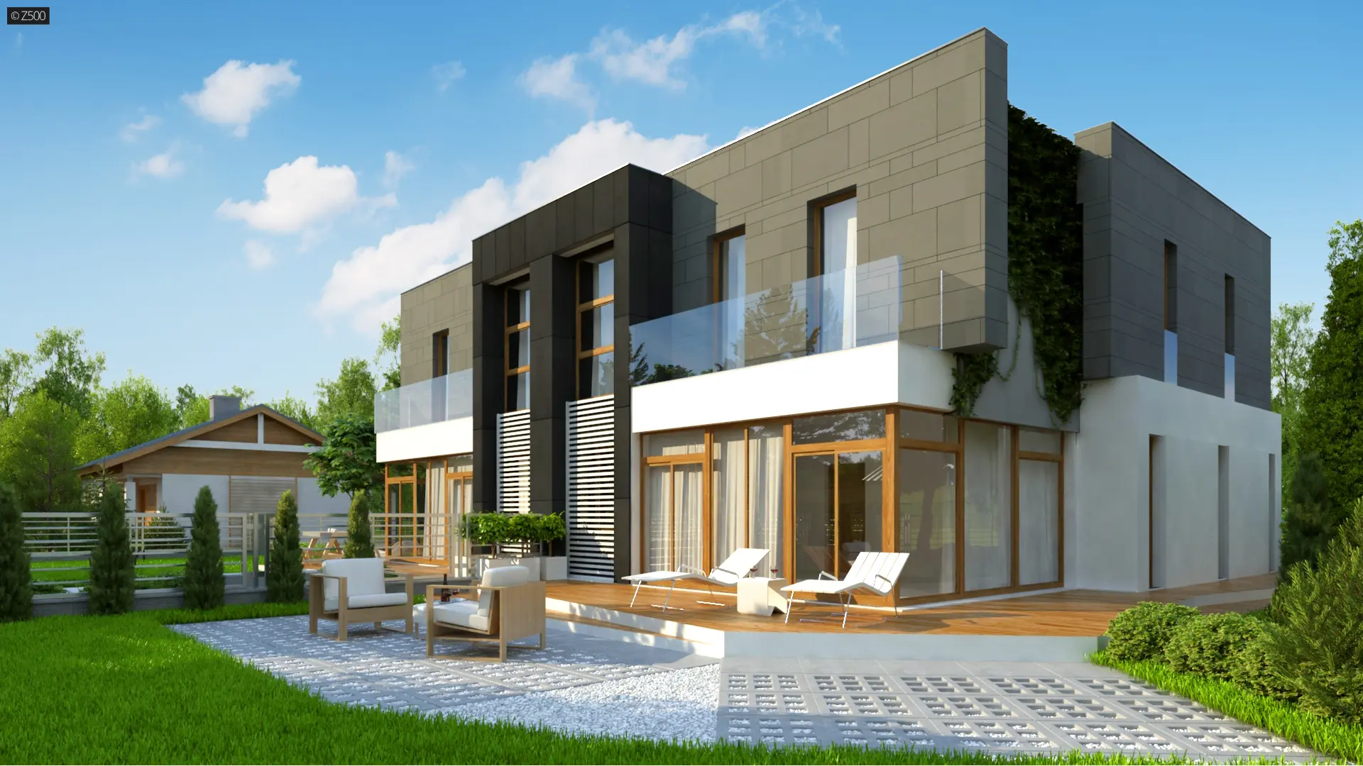 Propozycja projektu domu Z500 idealnie przystosowana do zabudowy bliźniaczej. Nowoczesne wykończenie elewacji podkreślono okładziną w odcieniach czerni, grafitu i szarości oraz zabezpieczeniem balkonów w postaci przeszklonej balustrady.