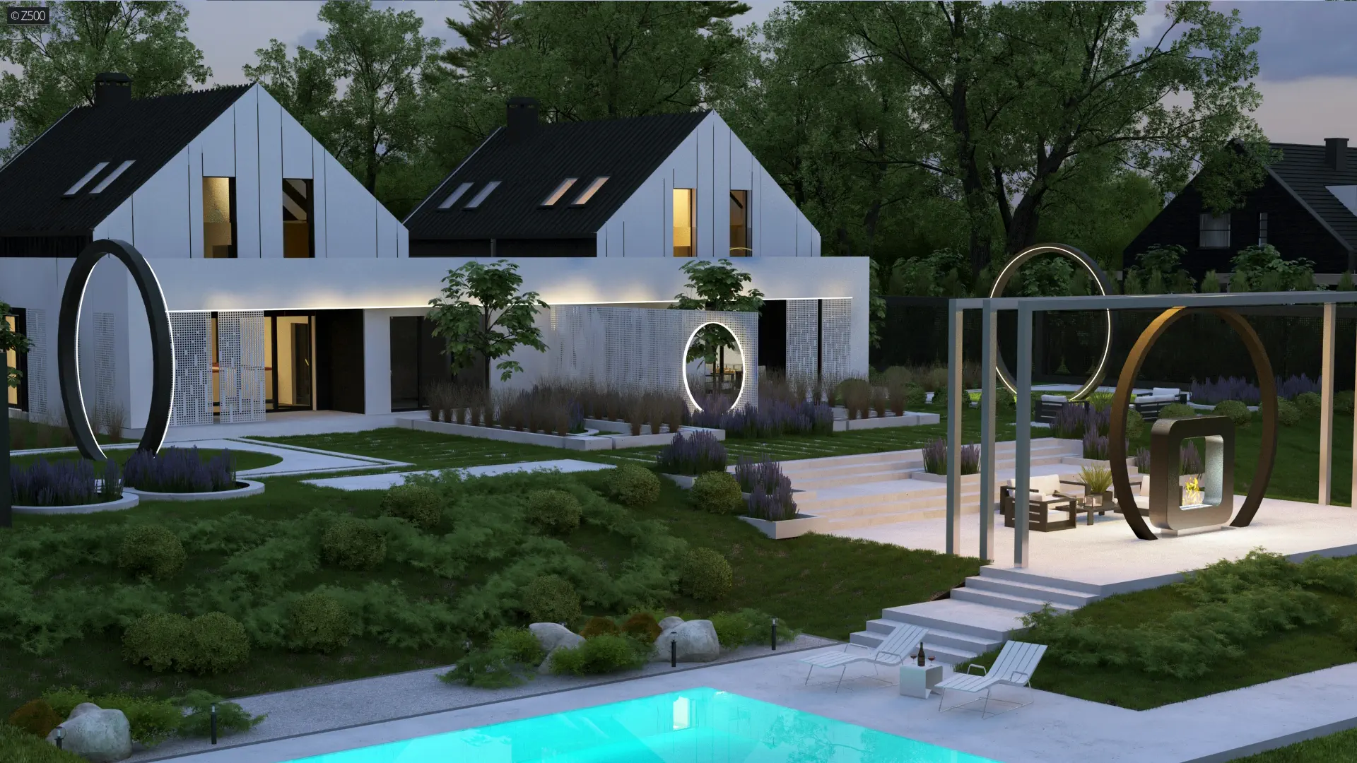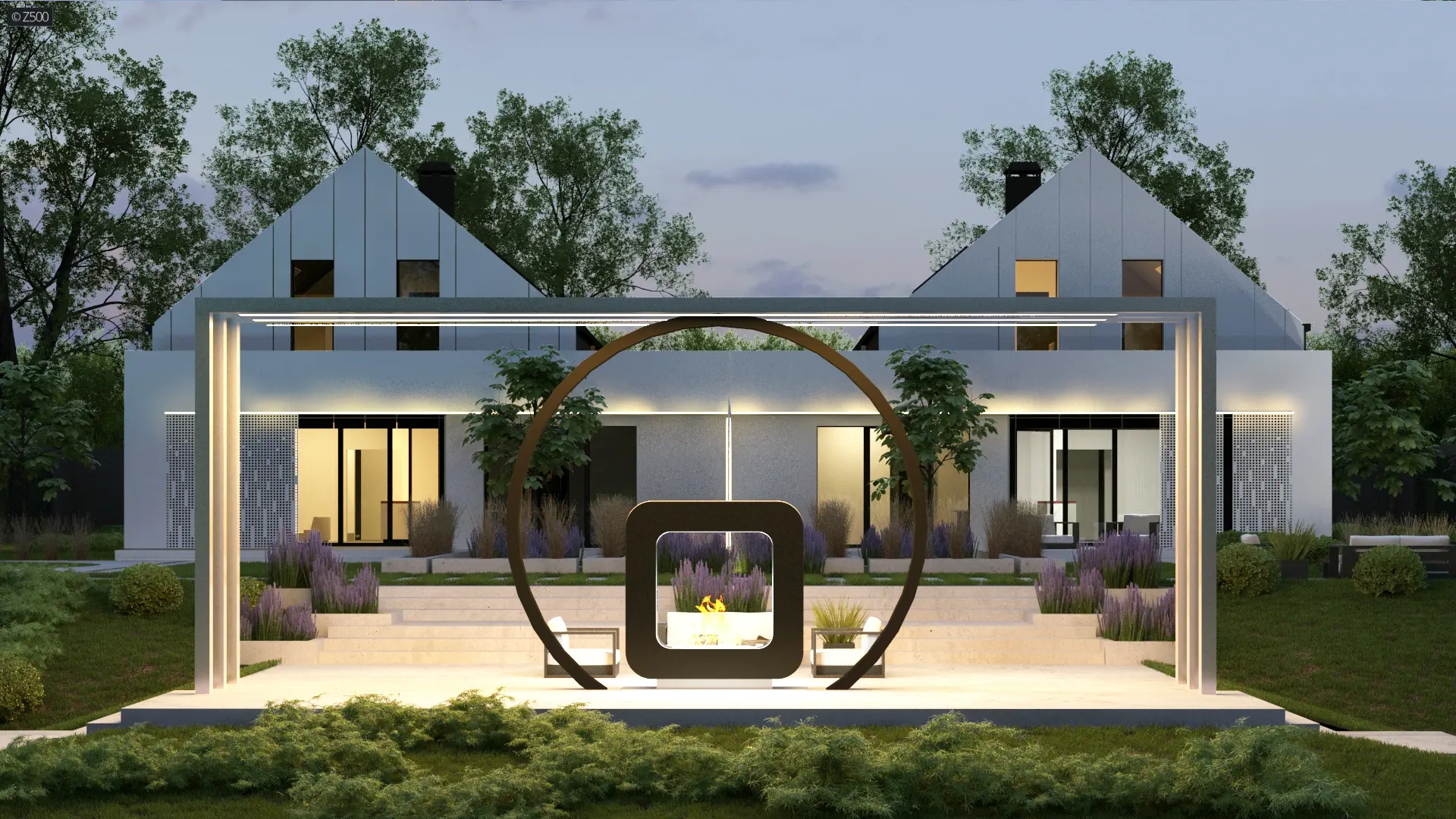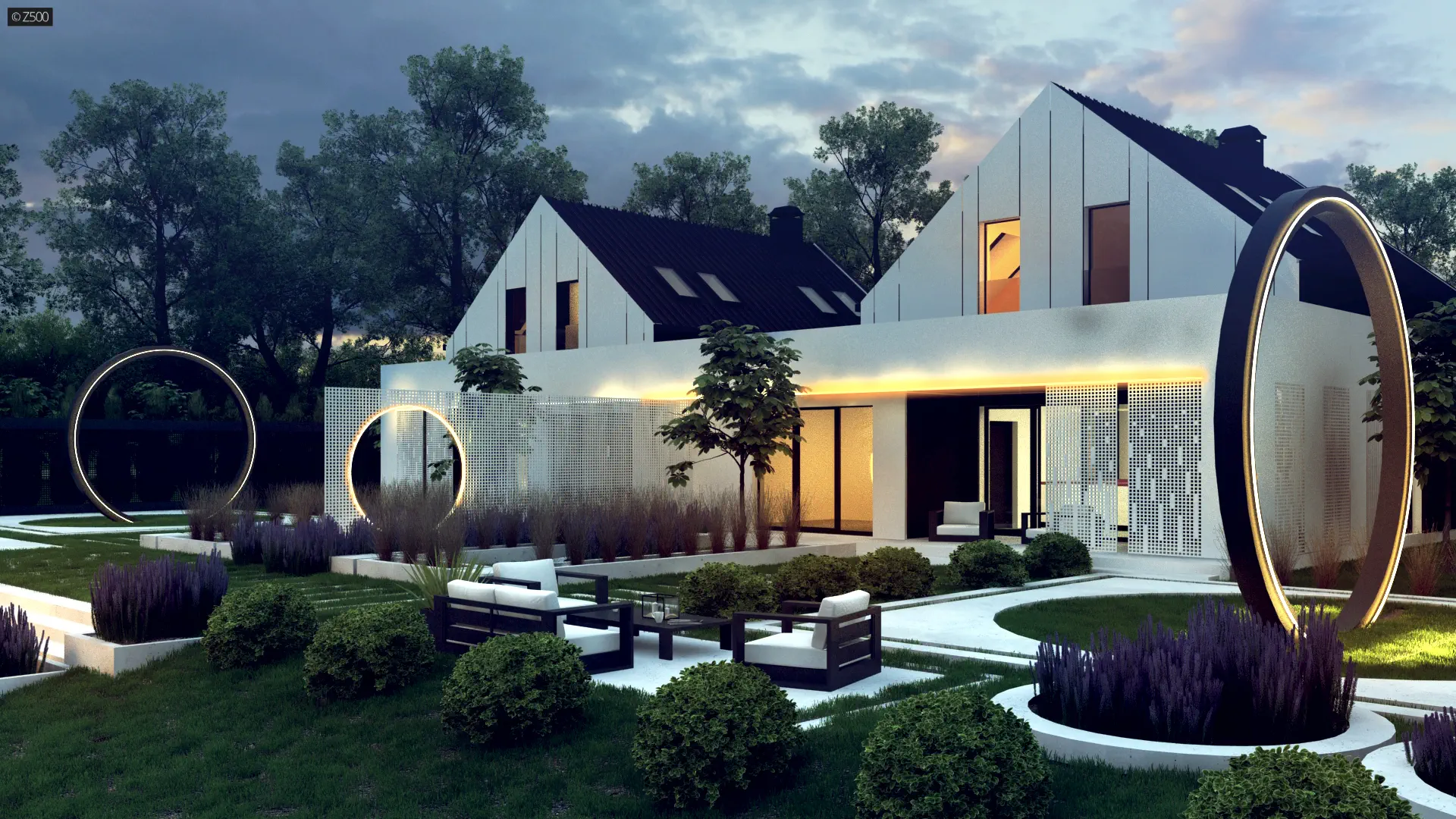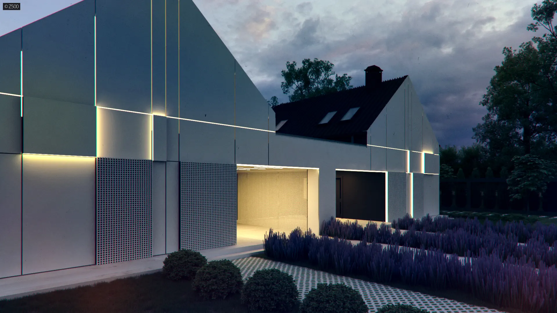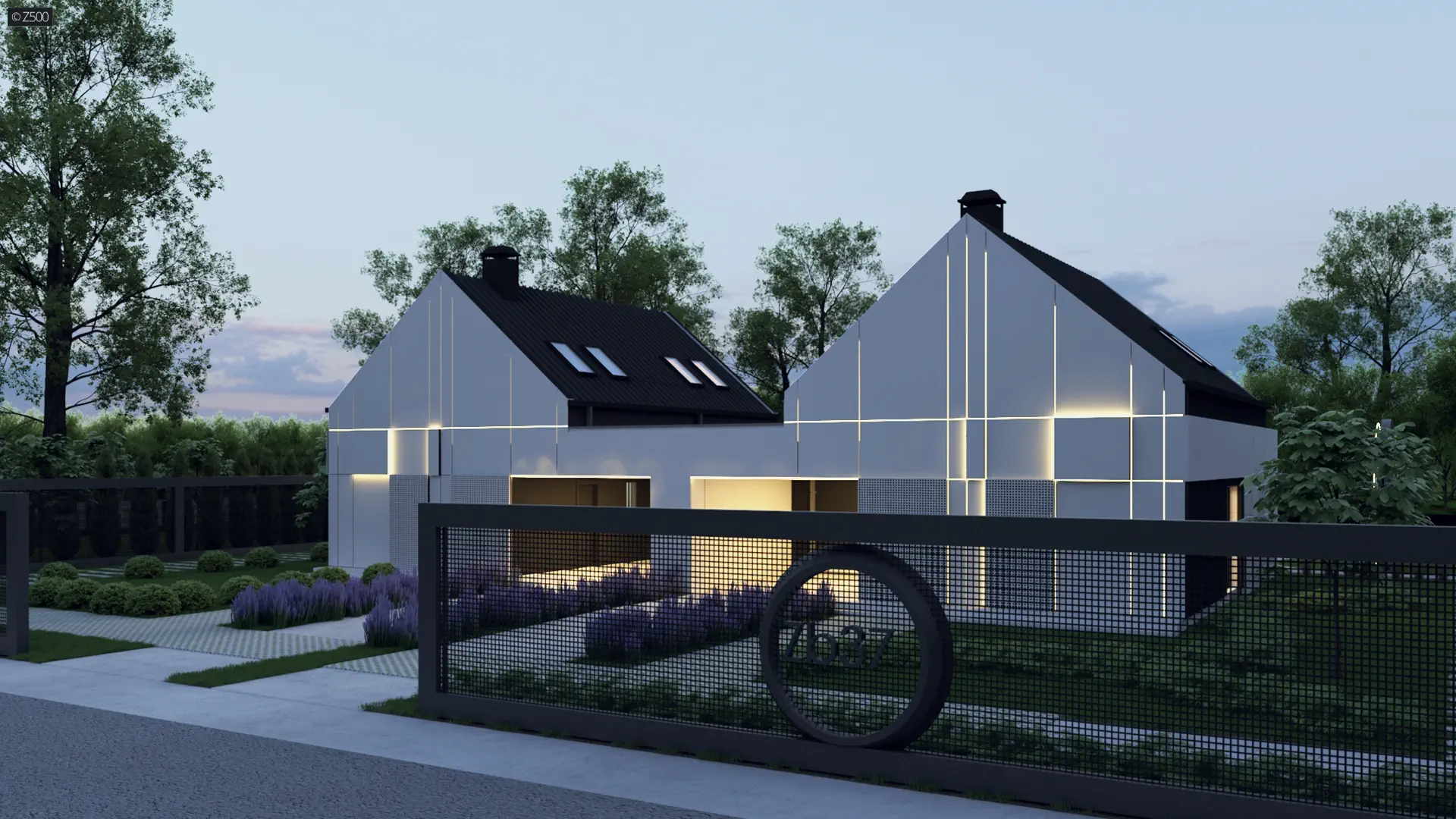 Zb37 to współczesny bliźniak z dachem dwuspadowym o powierzchni ok 120 m2. Jasna elewacja obłożona panelami elewacyjnym została podświetlona od wewnątrz. W domu zaprojektowano wiatę na samochód zamiast typowego garażu.
