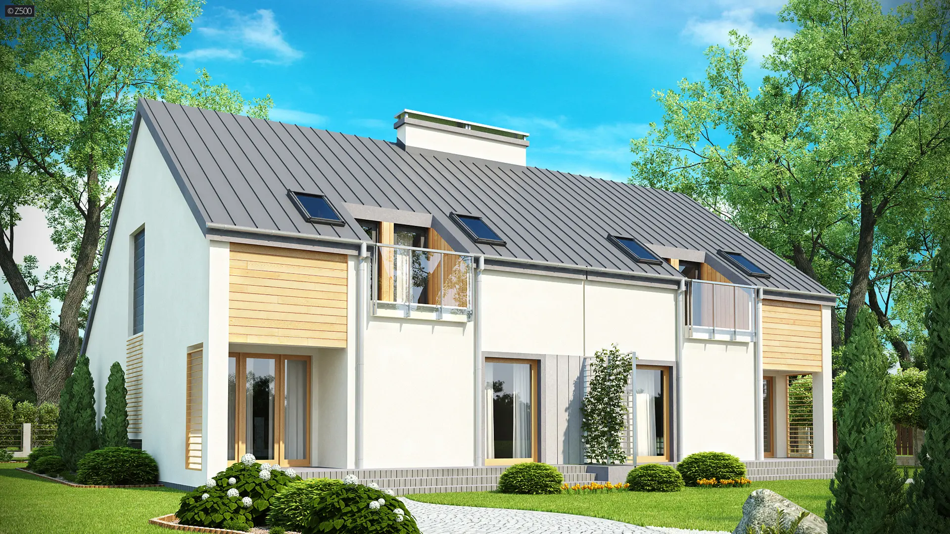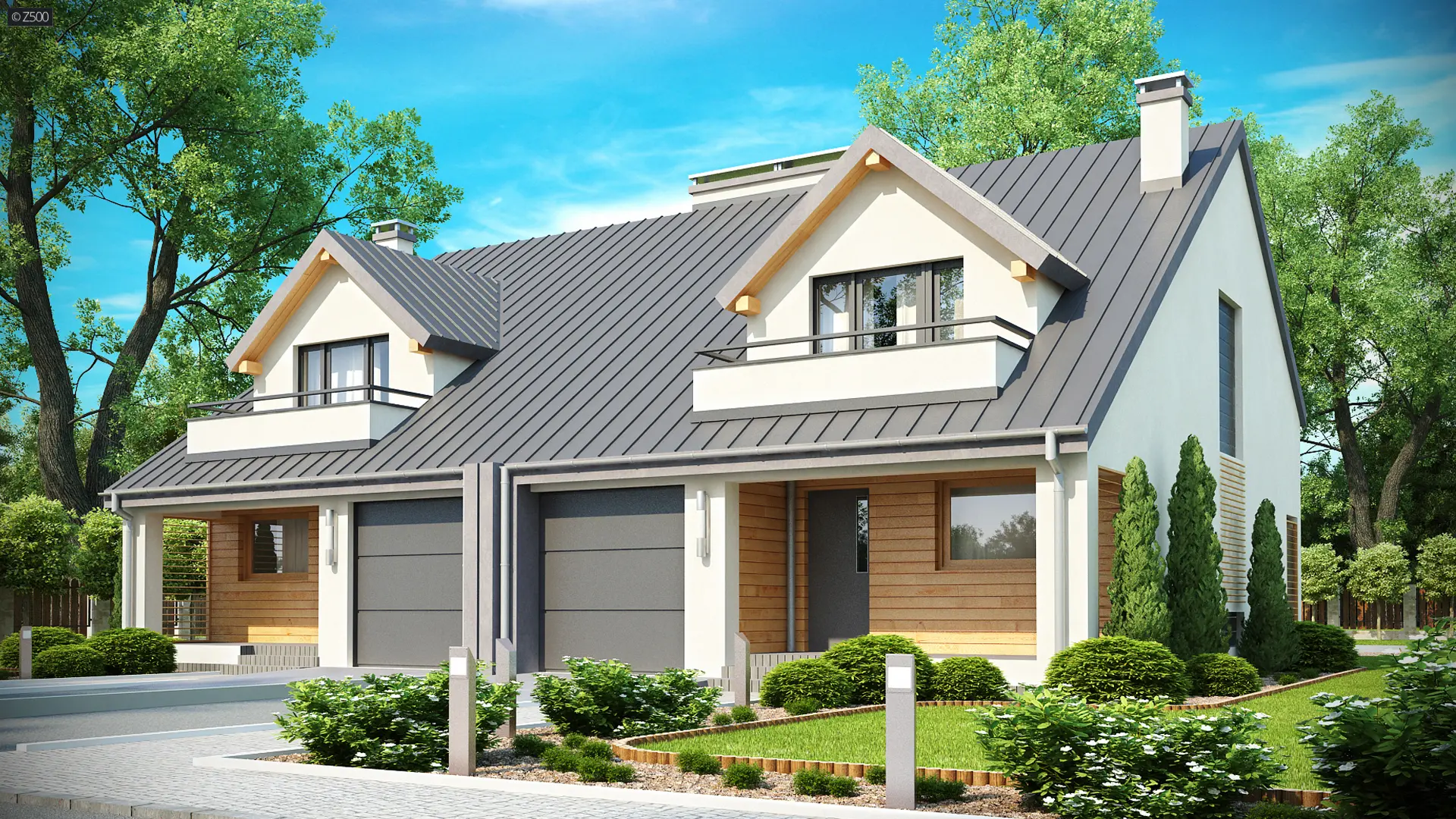 Zb4 sp prawy to projekt domu z użytkowym poddaszem oraz garażem. Elewacja budynku została wykonana z jasnego tynku strukturalnego.