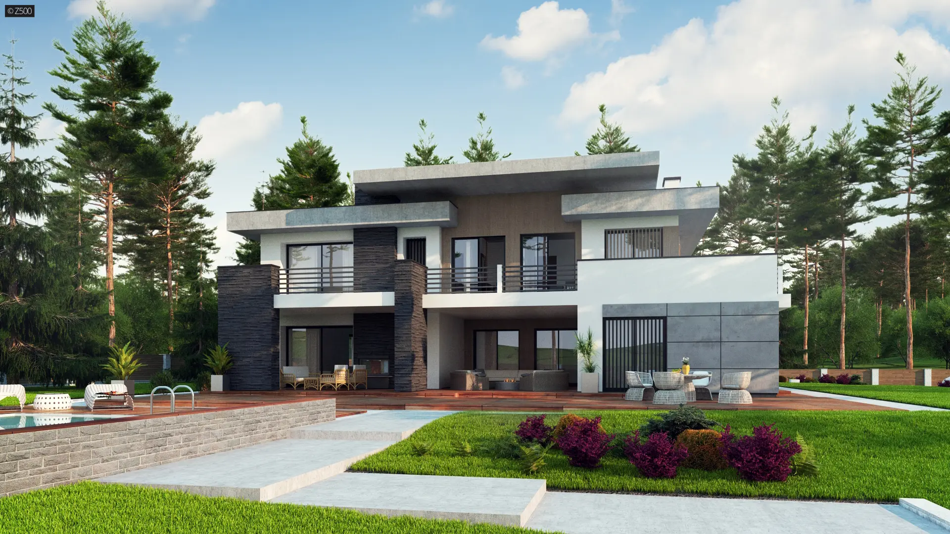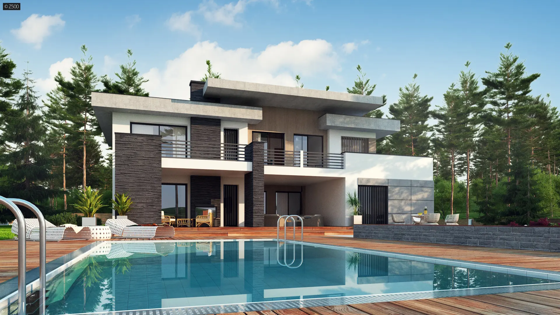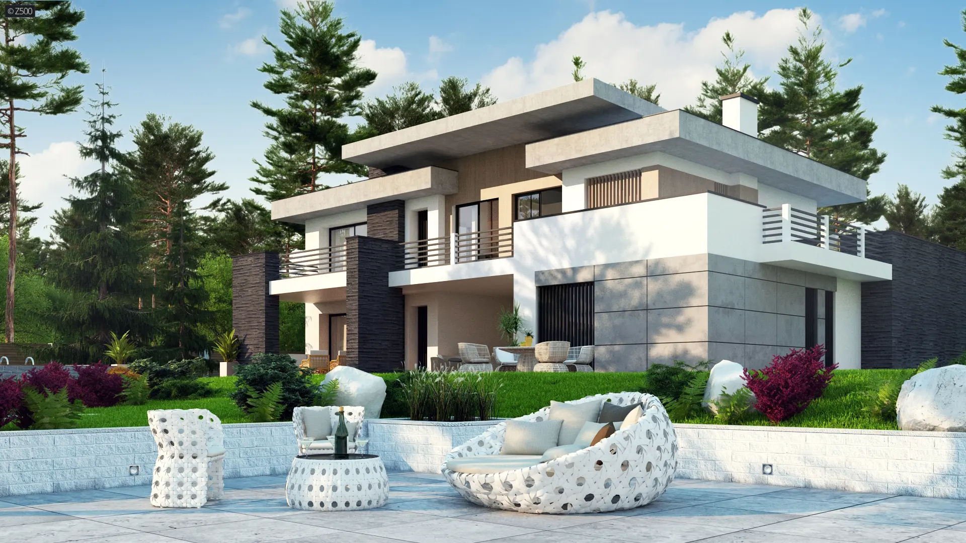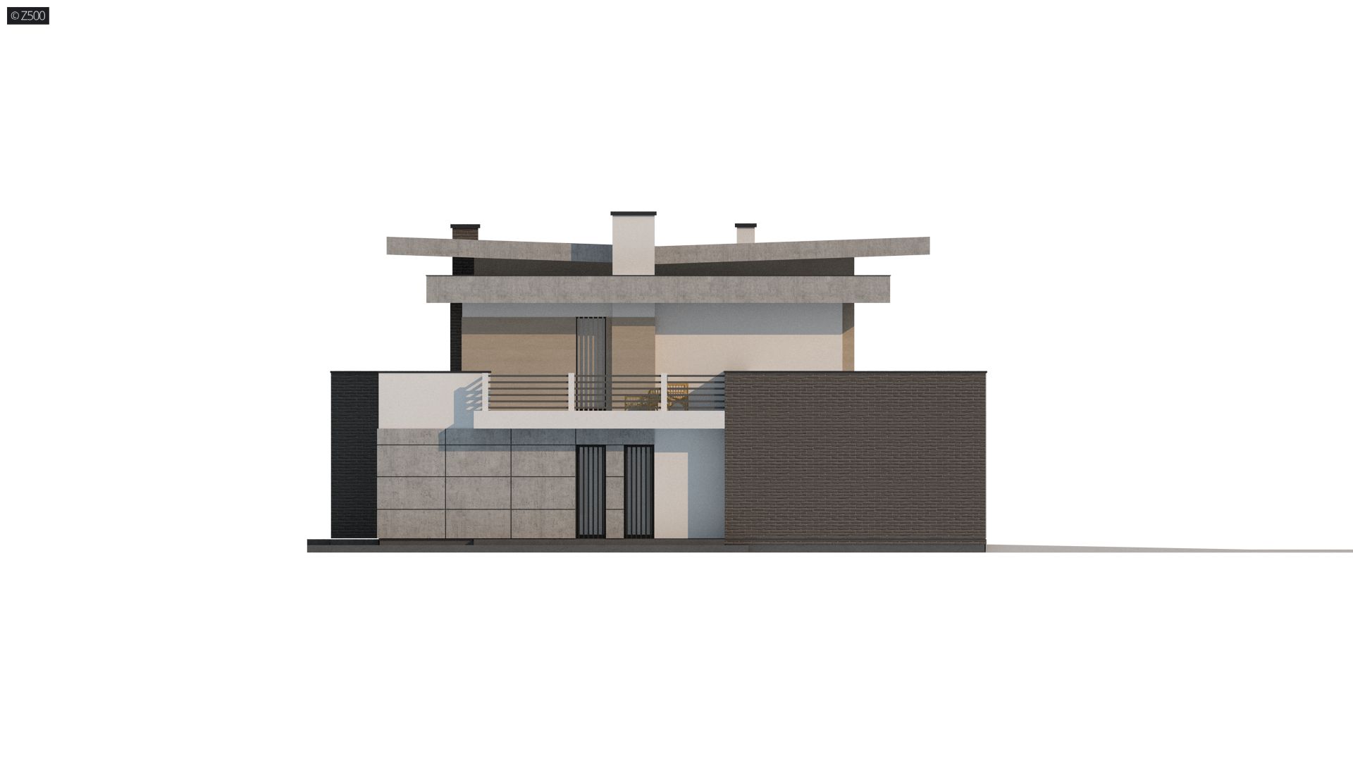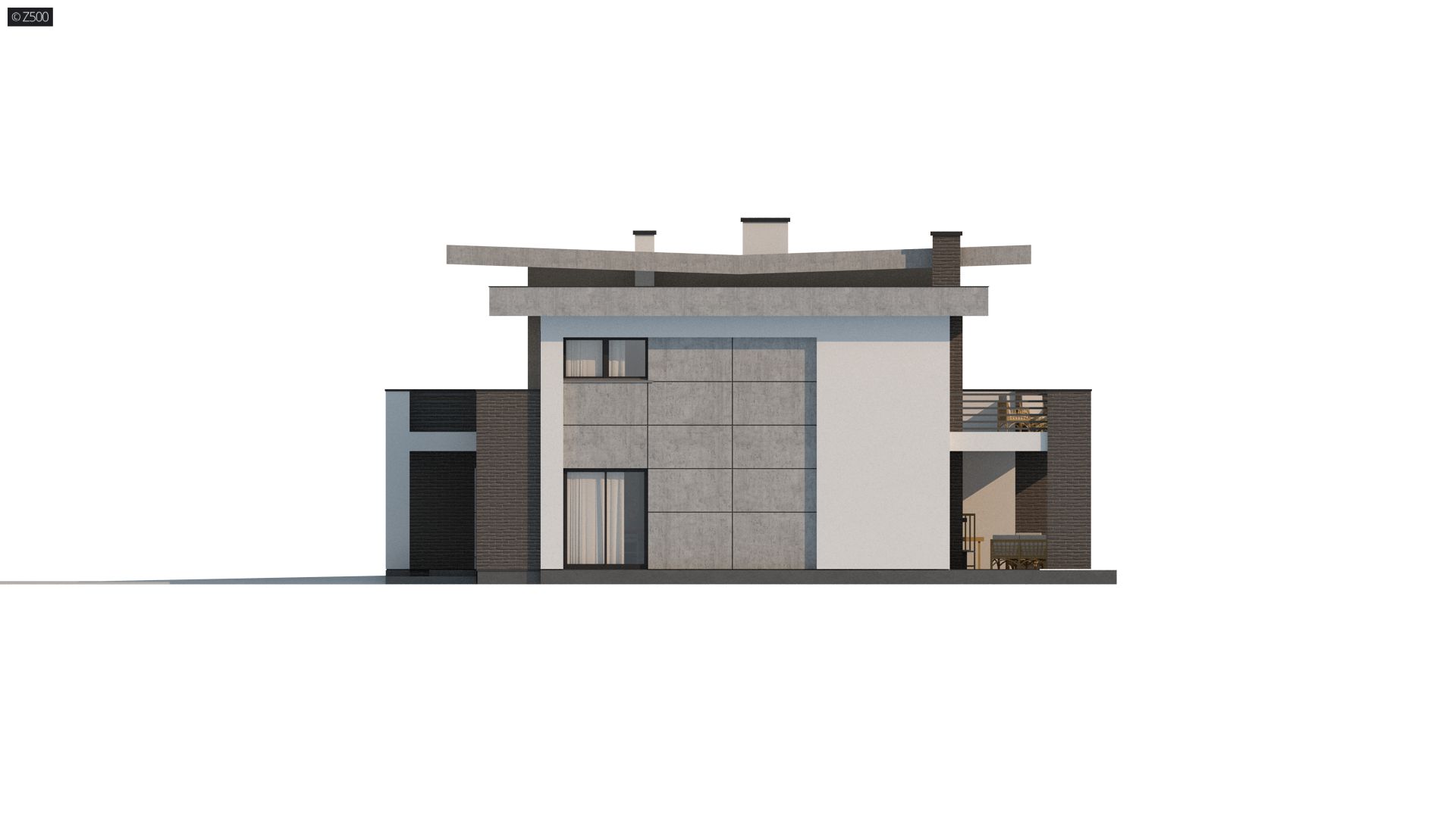 Dom prezentuje się okazale, jest nowoczesny, z dużymi okapami, posiada płaski dach i dwustanowiskowy garaż. Do wykończenia go z zewnątrz użyto 4 materiałów elewacyjnych: drewna, białego tynku, czarnego kamienia i surowego betonu. Do elewacji dodano elementy dekoracyjne w postaci pionowych żaluzji, które jednocześnie pełnią funkcję osłony słonecznej.