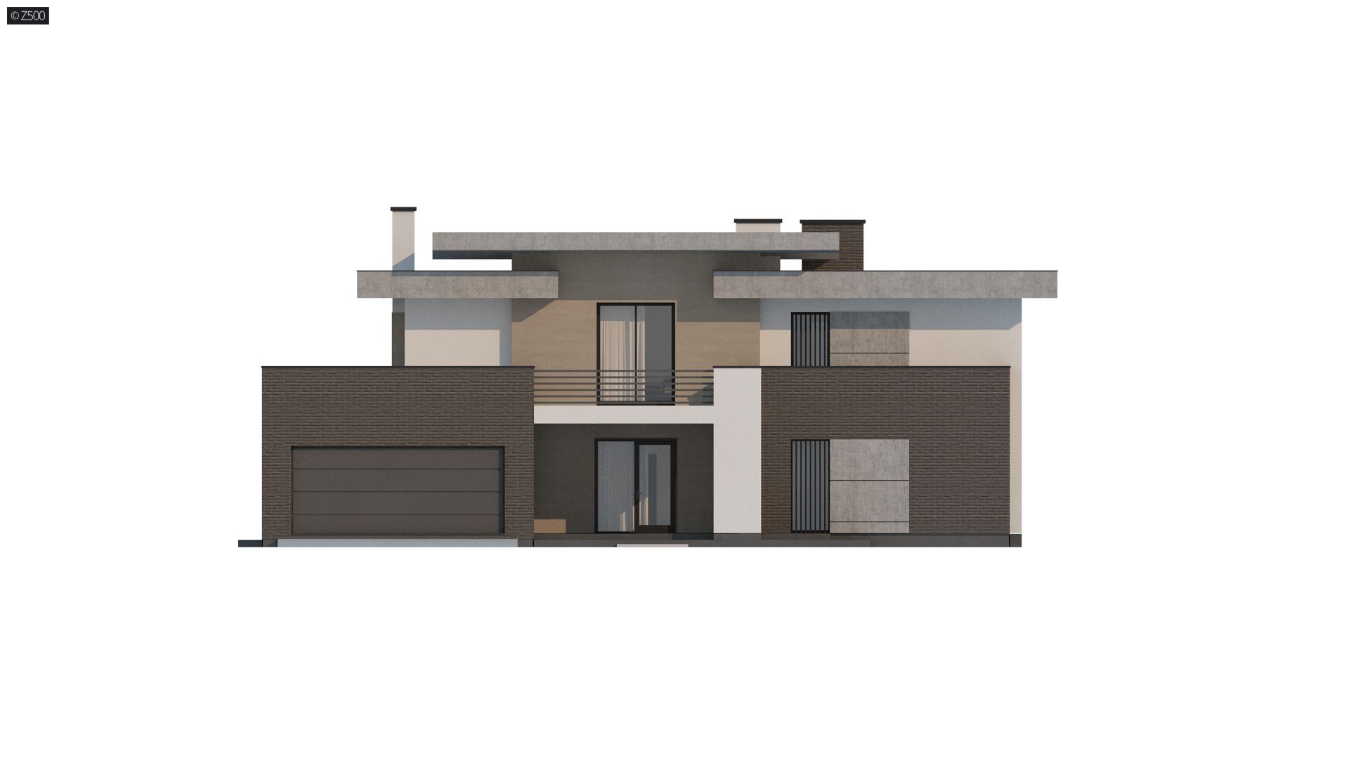 Piętrowy dom nowoczesny z garażem dwustanowiskowym oraz tarasami na piętrze.