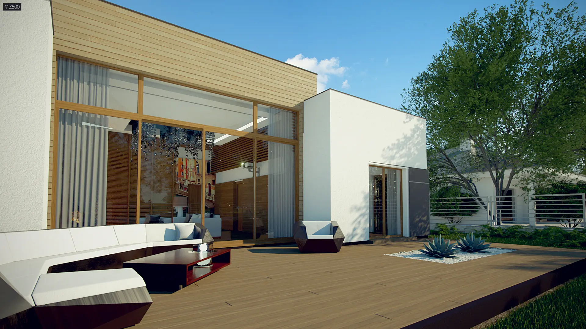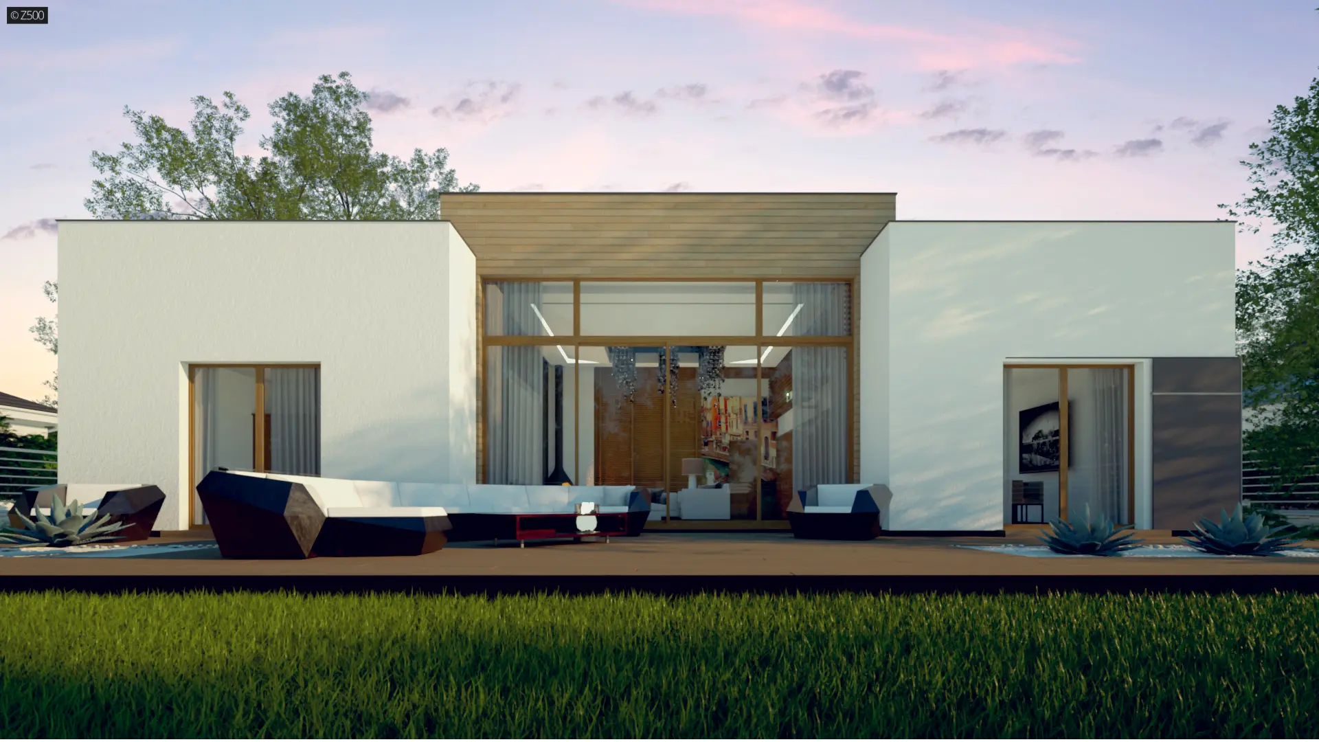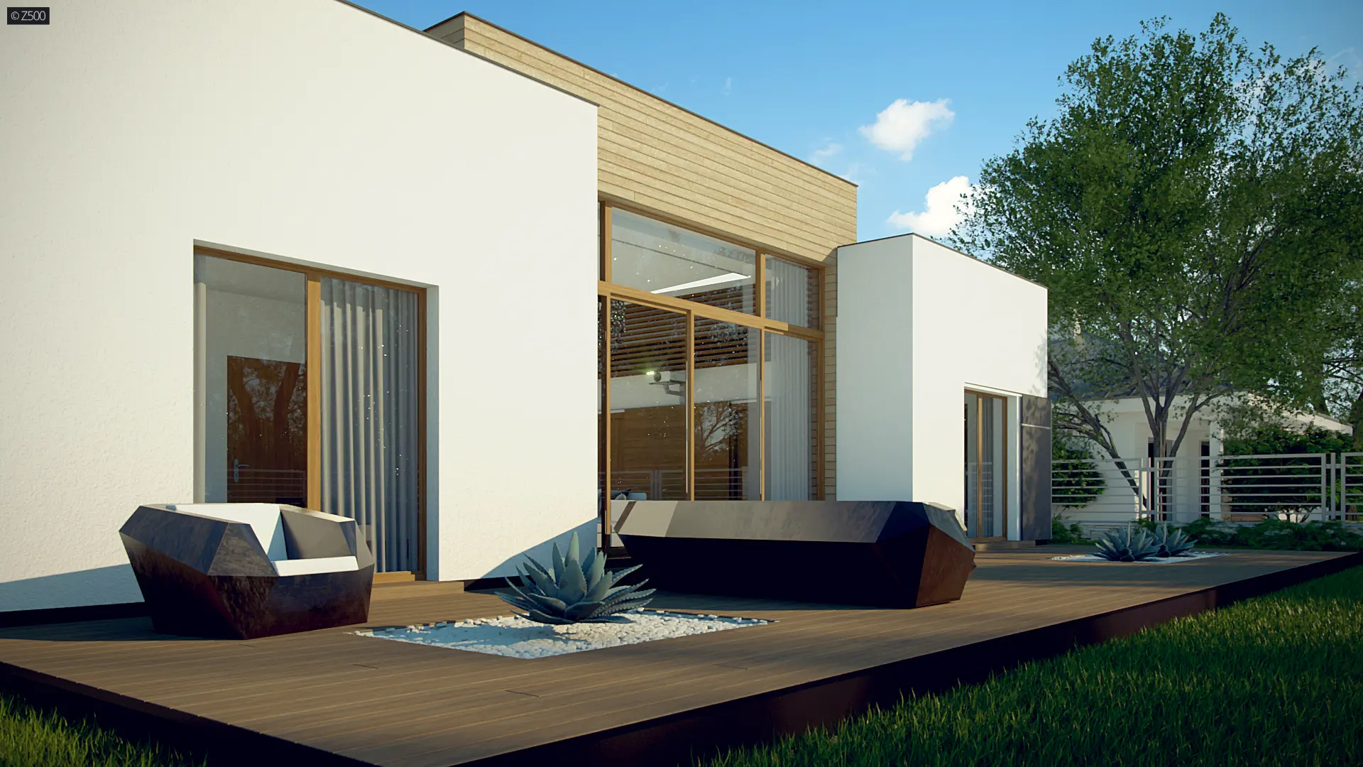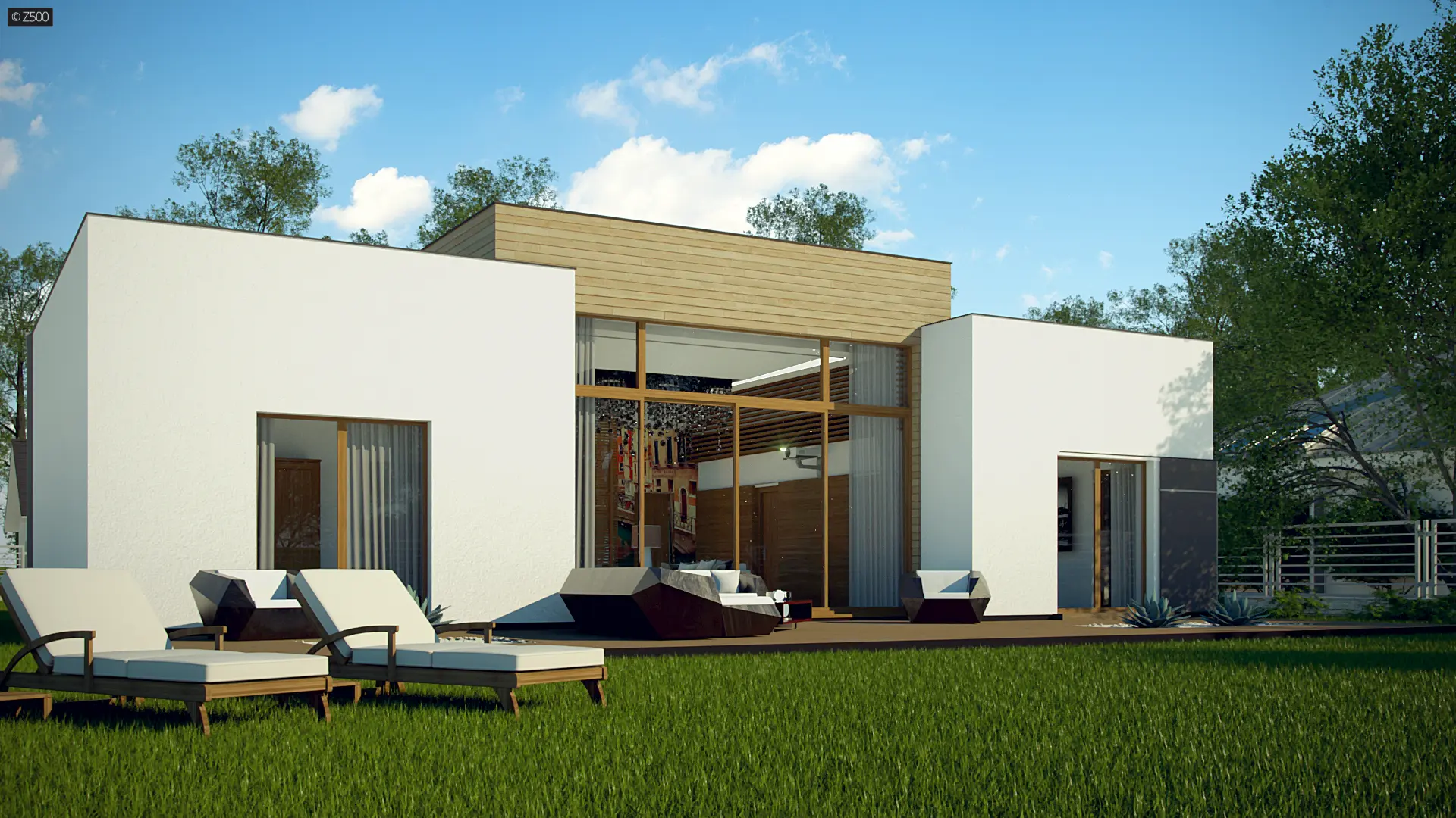 Zx111 jest nowoczesnym domem średniej wielkości, z płaskim dachem, w którym połączenie bieli, szarości, drewna i dużych salonowych przeszkleń podkreśla jego osobliwy wygląd z zewnątrz, a przestrzenny, podwyższony salon, wewnątrz domu.