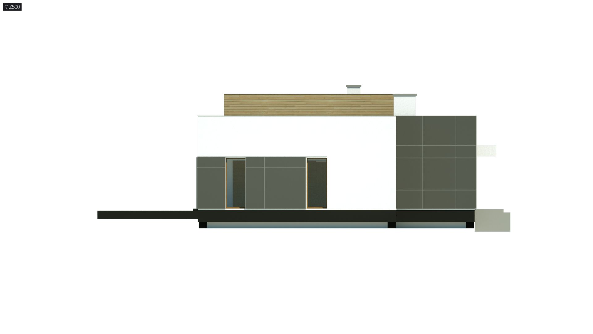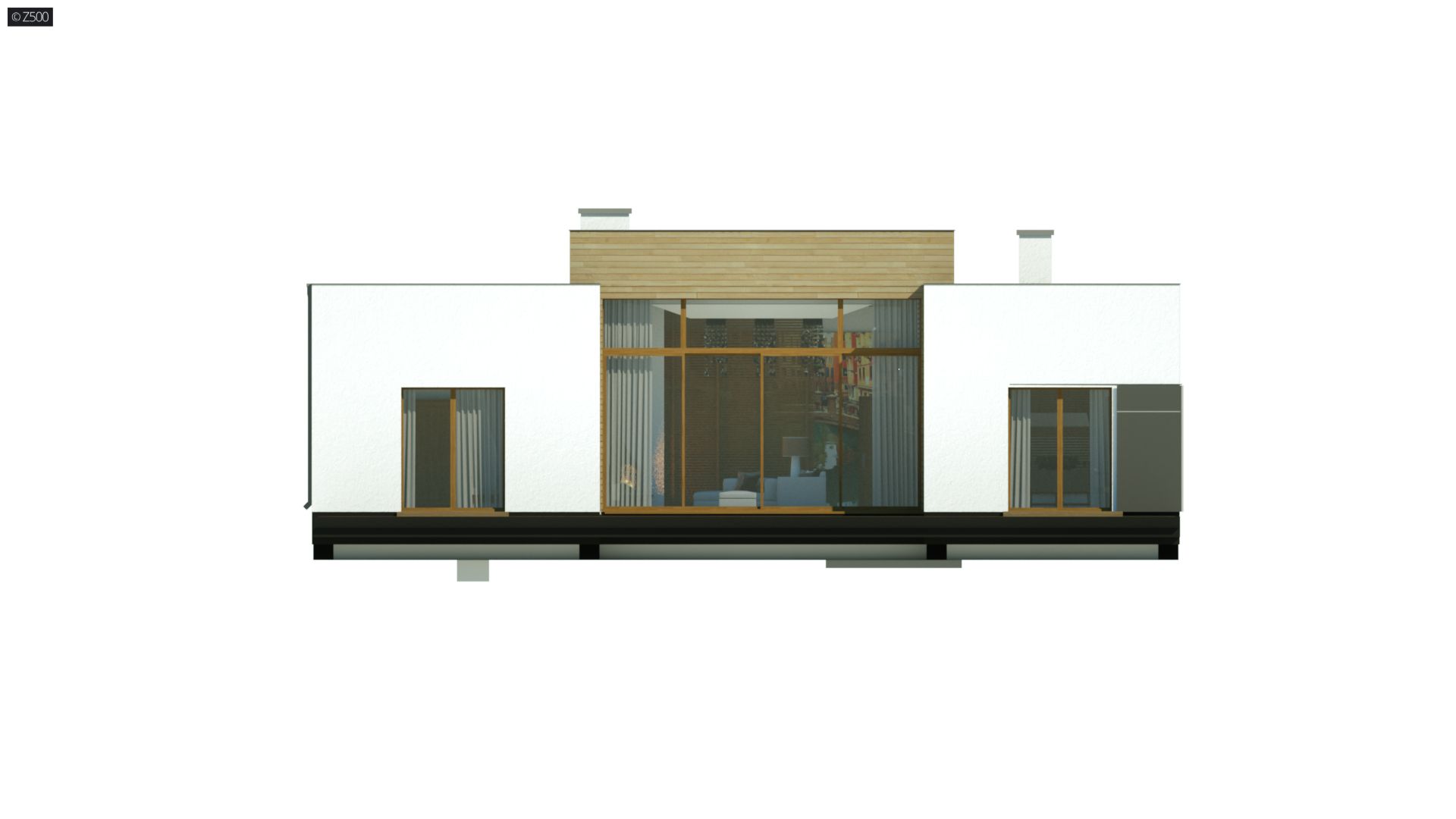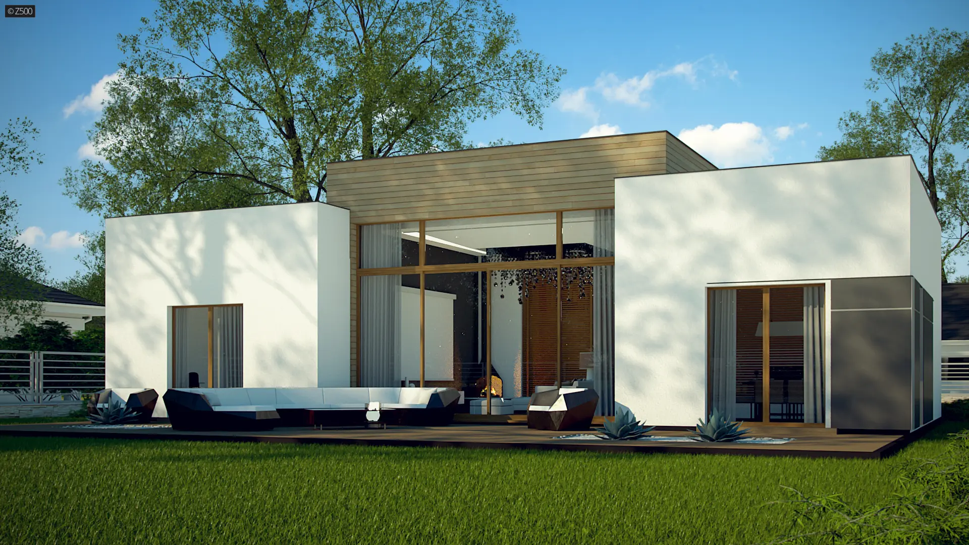 Zx111 jest nowoczesnym domem średniej wielkości, z płaskim dachem, w którym połączenie bieli, szarości, drewna i dużych salonowych przeszkleń podkreśla jego osobliwy wygląd z zewnątrz, a przestrzenny, podwyższony salon, wewnątrz domu.