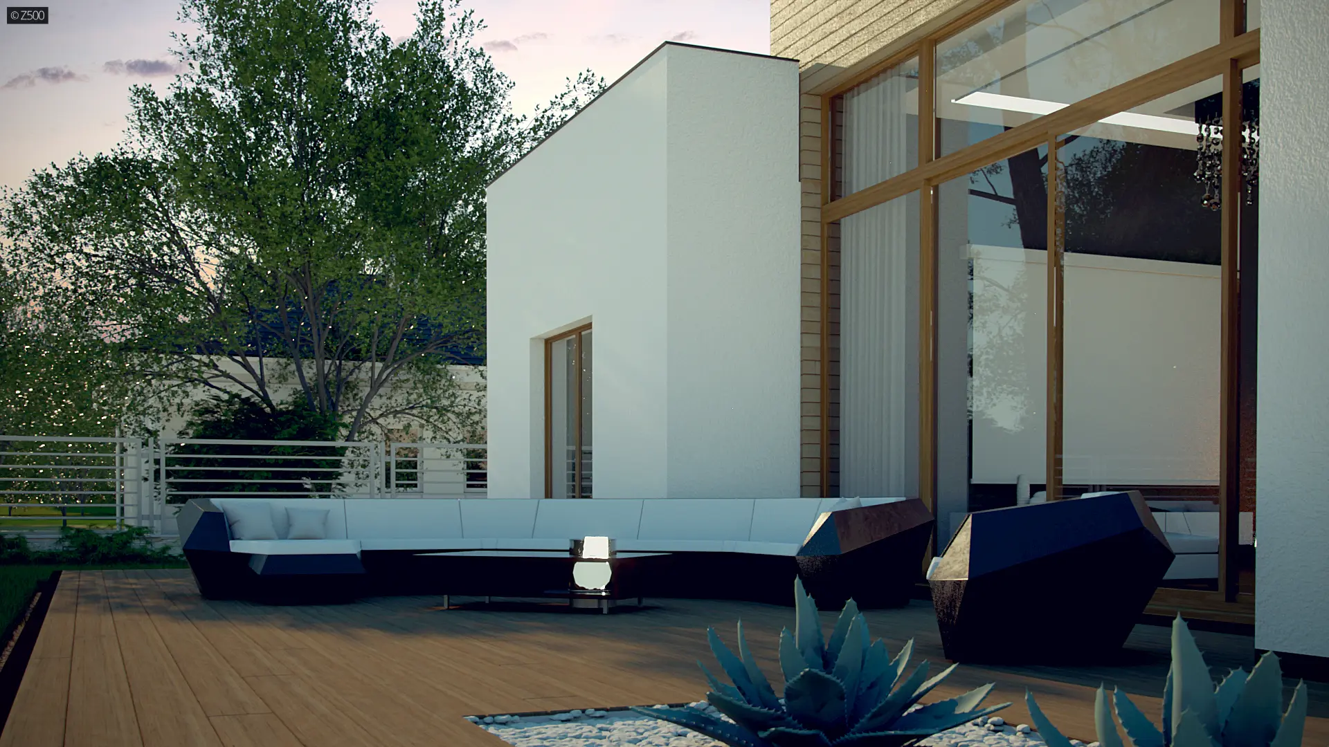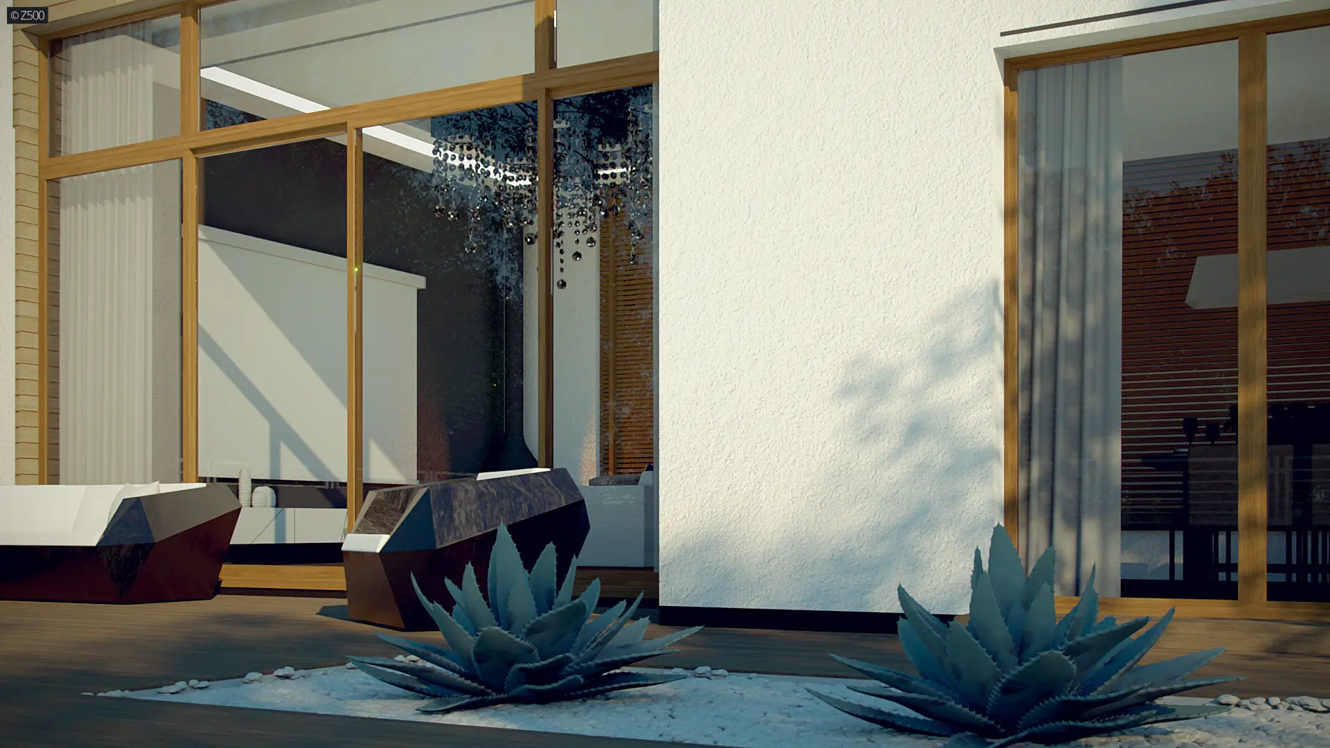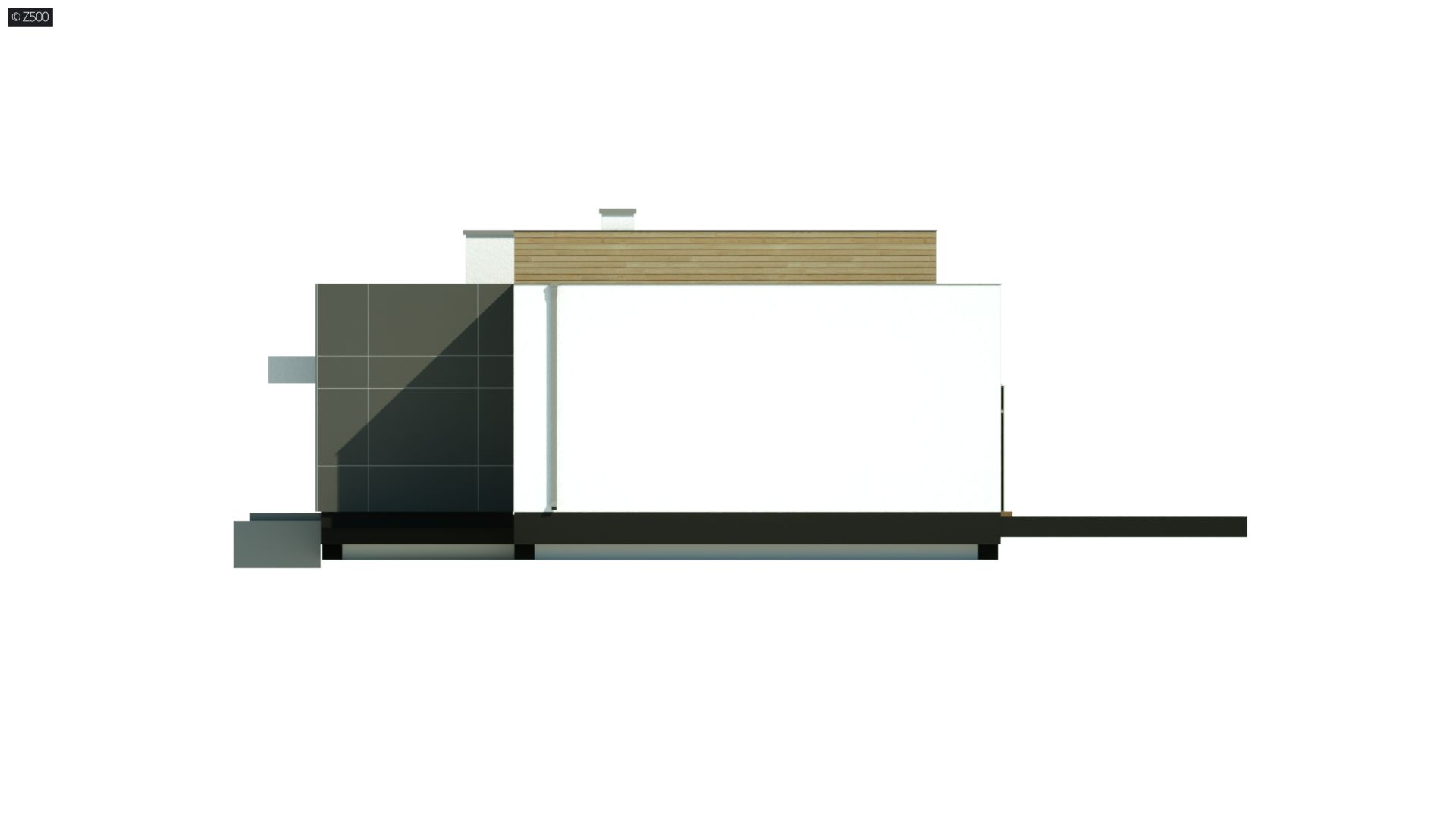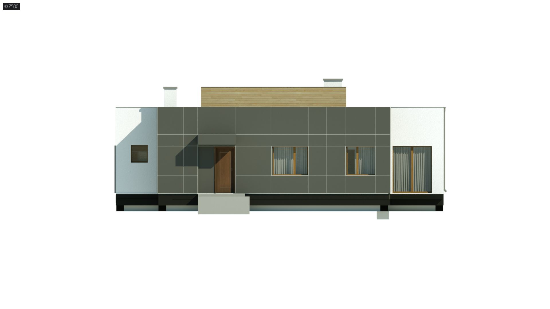 Zx111 jest nowoczesnym domem średniej wielkości, z płaskim dachem, w którym połączenie bieli, szarości, drewna i dużych salonowych przeszkleń podkreśla jego osobliwy wygląd z zewnątrz, a przestrzenny, podwyższony salon, wewnątrz domu.