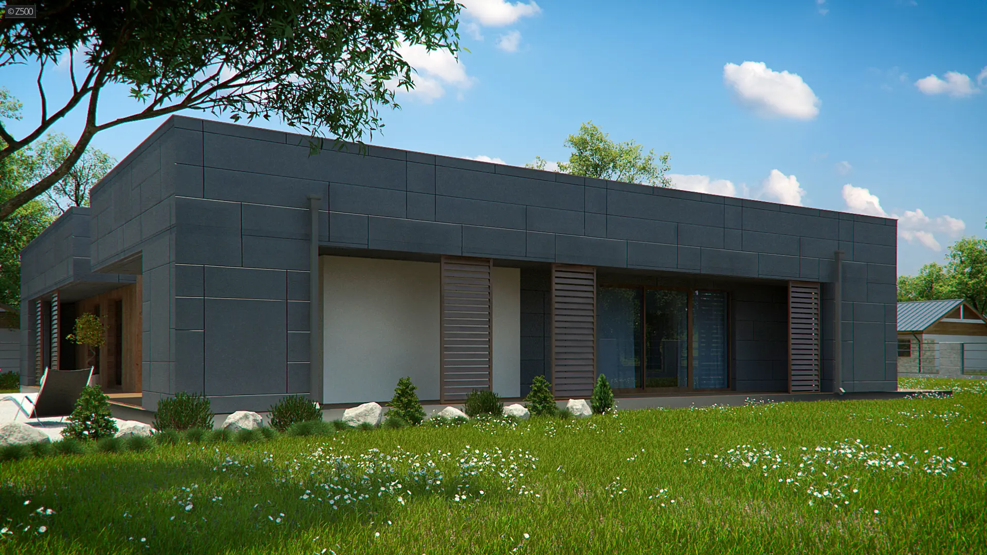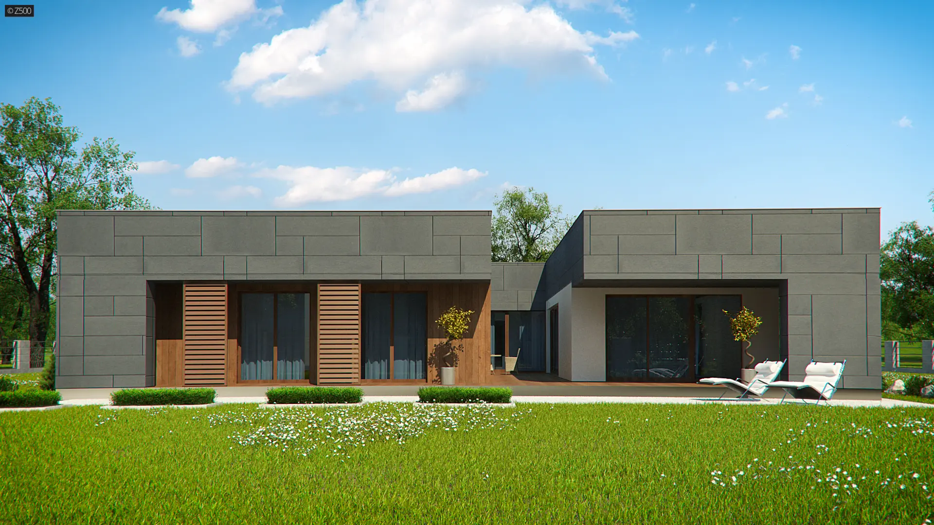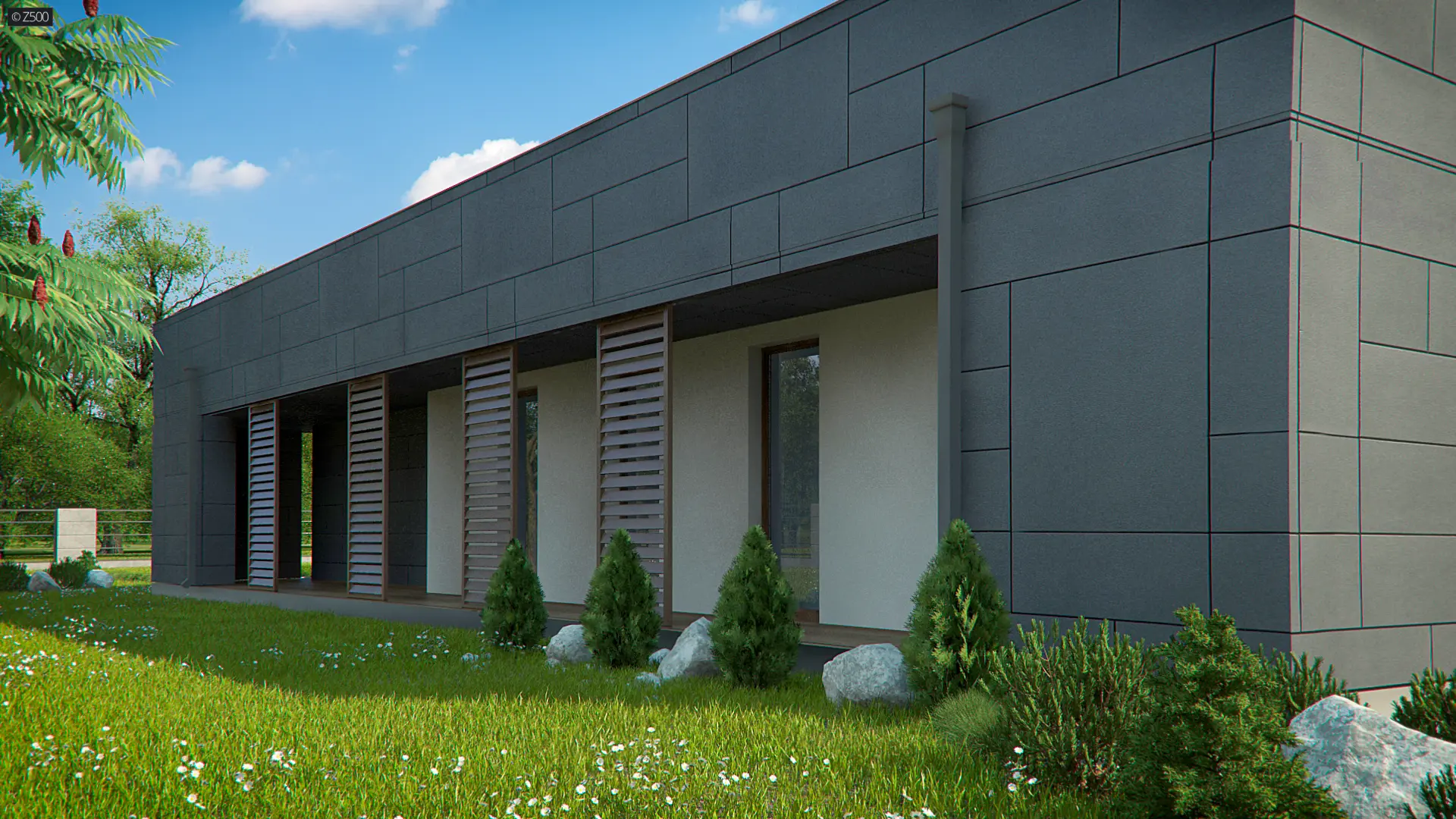 Architektonika z wierzchu przypomina nieco skorupę żółwia. Biały tynk w połączeniu z drewnem a na zewnątrz bryłę przykryto szarą płytę elewacyjną. Na „skorupie żółwiowego pancerza” można dodatkowo zamontować przesuwne rolety, które zasunięte ochronią nas przed wścibskim okiem sąsiada, a odsunięte dostarczą odpowiedniej ilości światła i dobrego nastroju. Zx118 będzie również długowieczny niczym żółw. Nacieszy się nim kilka pokoleń.