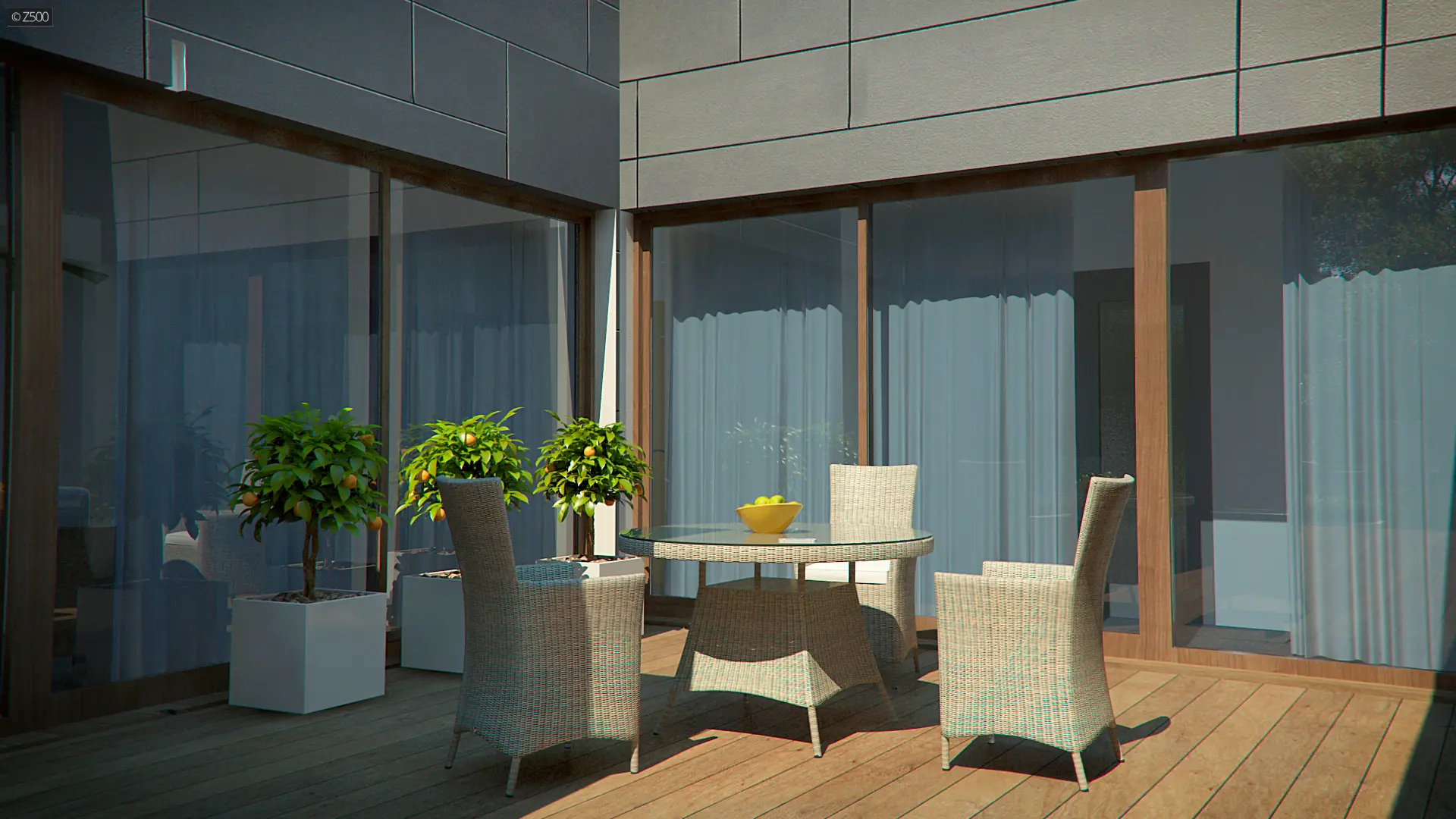 Centralnie umieszczone atrium nie jest zadaszone, więc będąc w zacisznym osłonięciu można swobodnie korzystać z kąpieli słonecznych. Aranżacja tej przestrzeni zostawia nam wiele dowolności. Pięknie wpisywałby się tu kompleks zieleni z oczkiem wodnym lub z wydzielonym miejscem na zabawę dla dzieci.