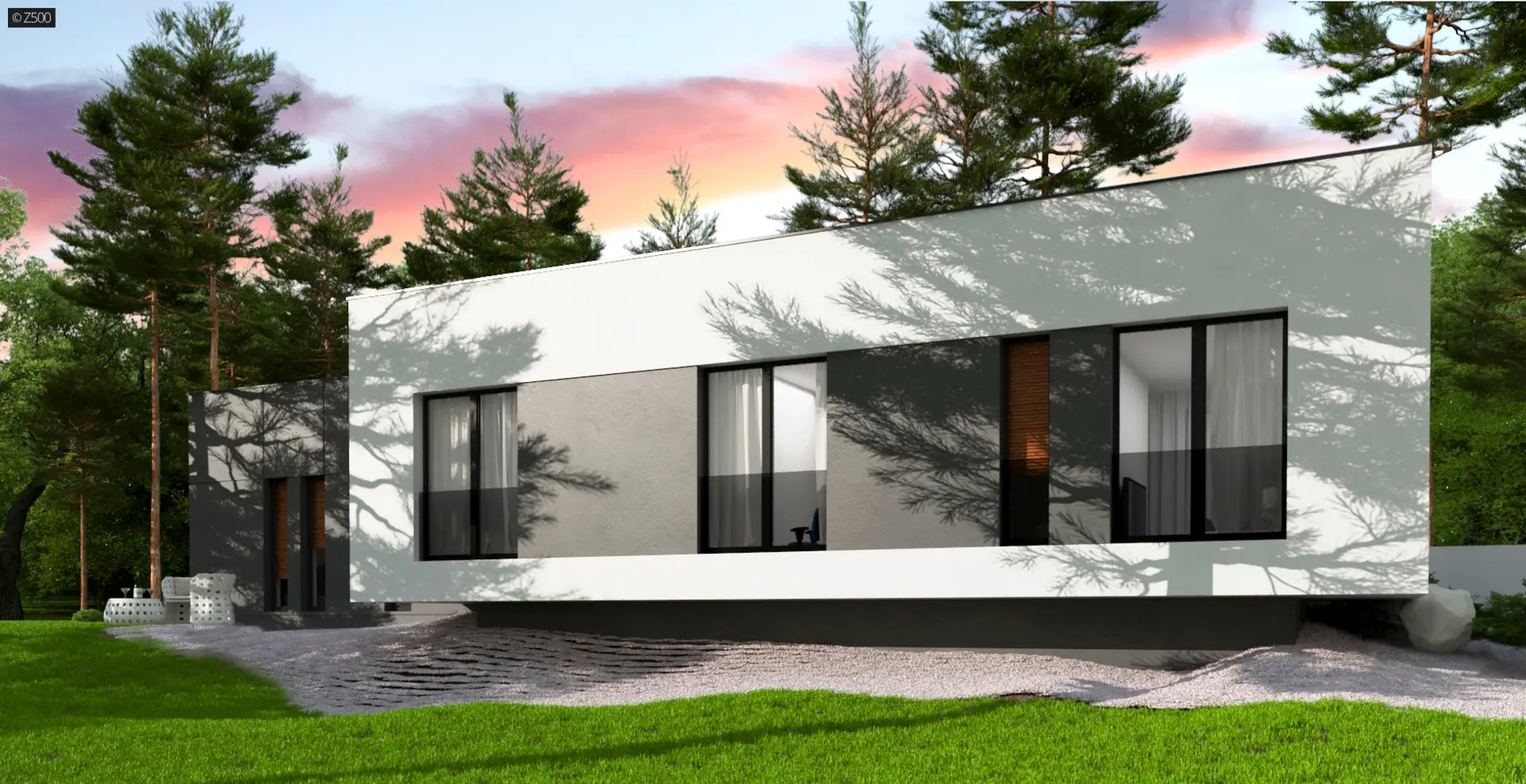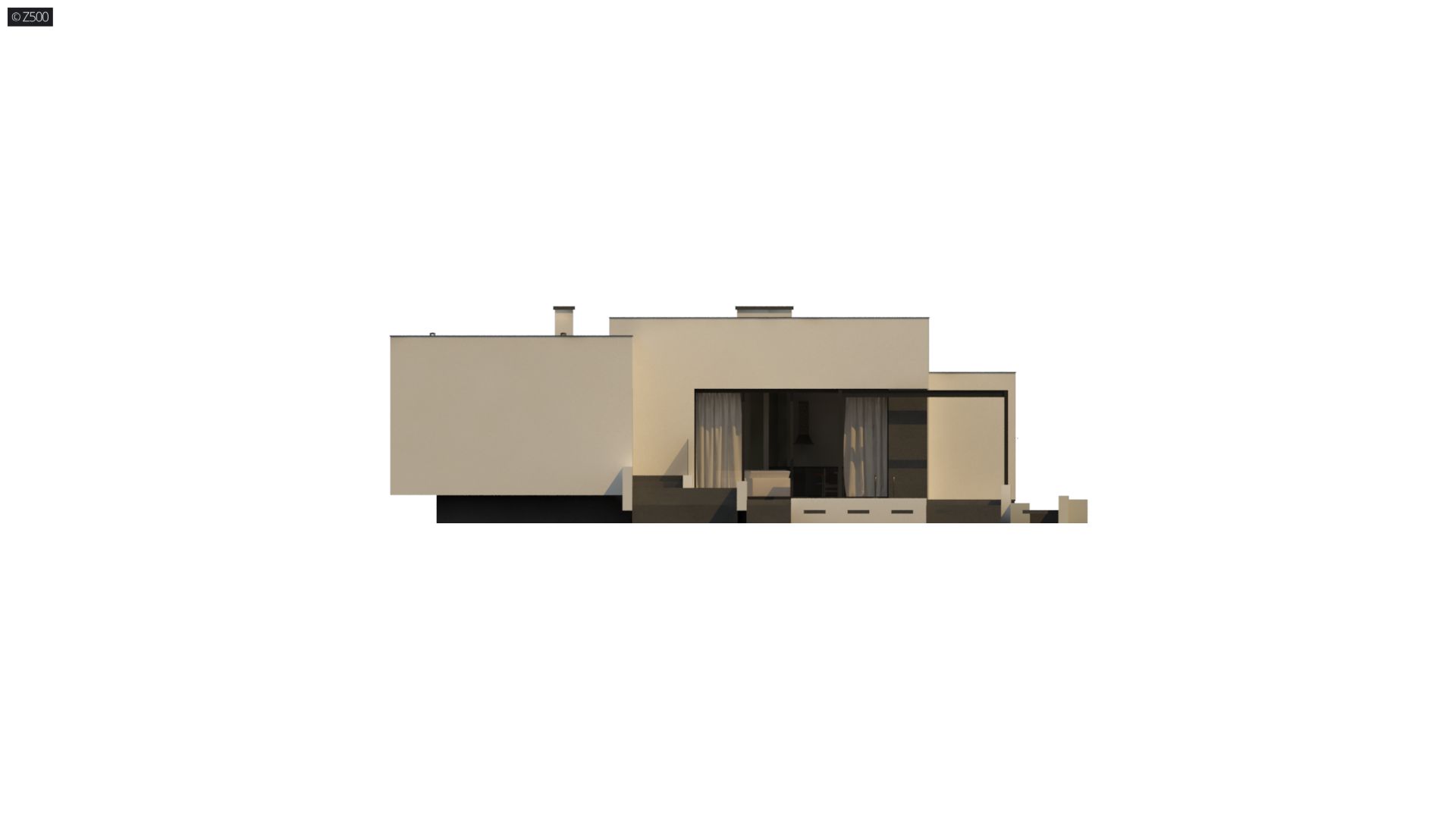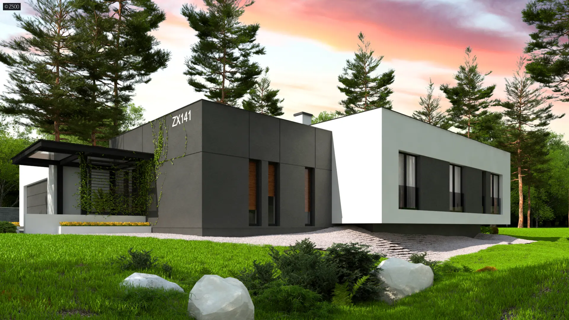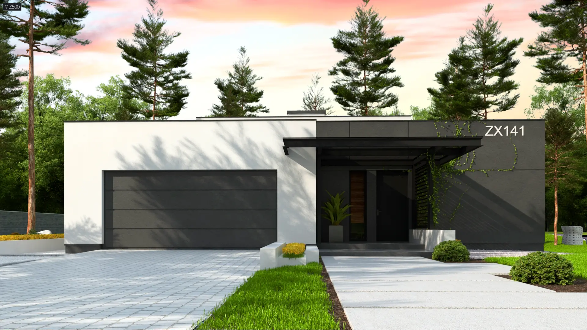 Zx141 to dom parterowy z płaskim dachem wielospadowym i dwustanowiskowym garażem charakteryzujący się wizualnym aspektem nowoczesności. Biel i czerń oraz sypialnia wznosząca się ponad inne pomieszczenia dodają mu animuszu i elegancji. Szklane balustrady i portfenetrowe okna krystalizują jego unikalny styl.