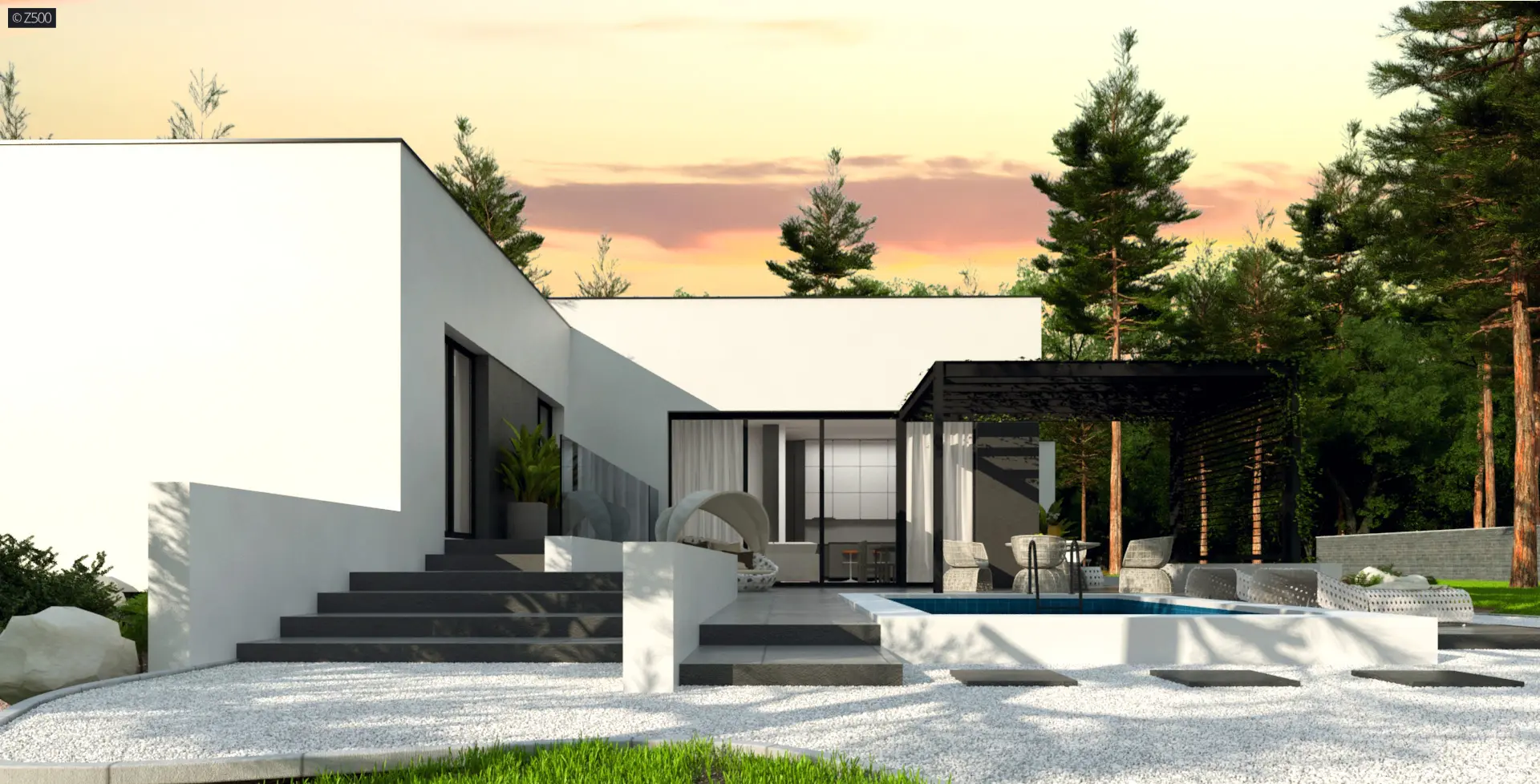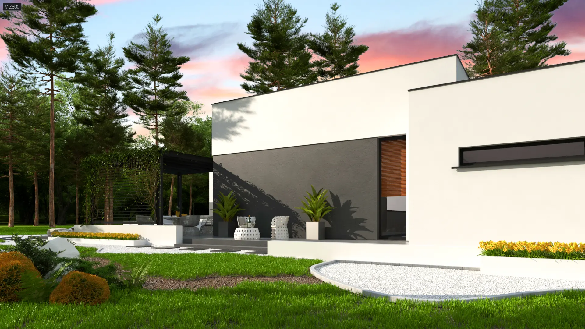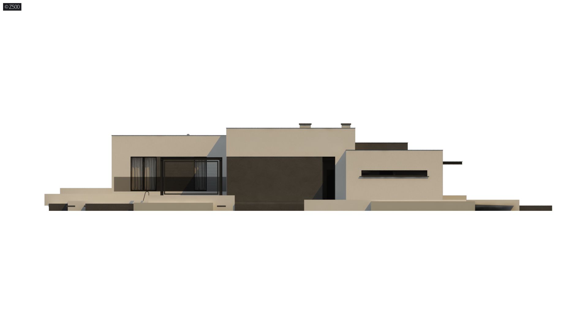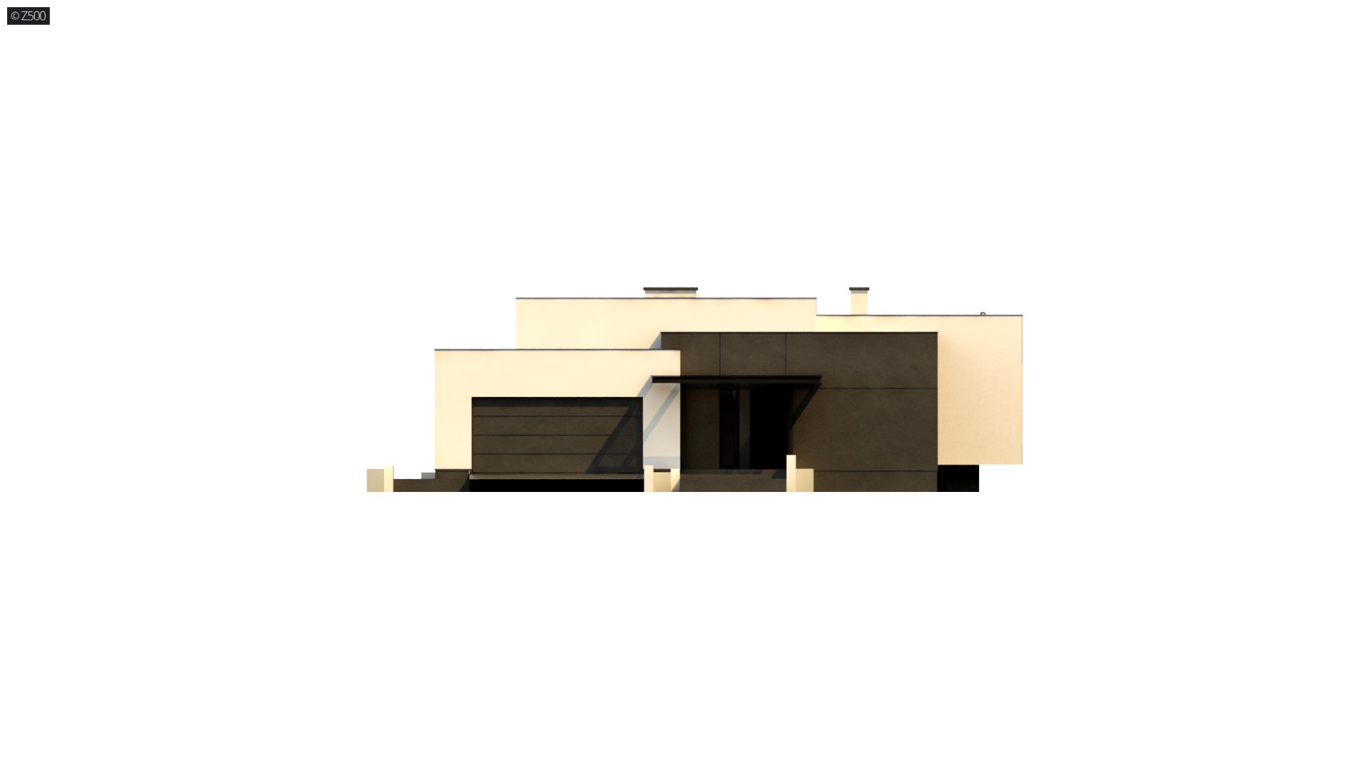 Zx141 to dom parterowy z płaskim dachem wielospadowym i dwustanowiskowym garażem charakteryzujący się wizualnym aspektem nowoczesności. Biel i czerń oraz sypialnia wznosząca się ponad inne pomieszczenia dodają mu animuszu i elegancji. Szklane balustrady i portfenetrowe okna krystalizują jego unikalny styl.