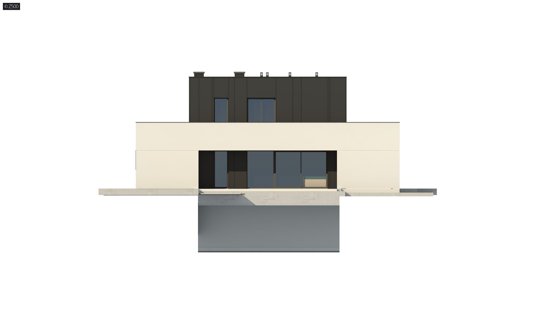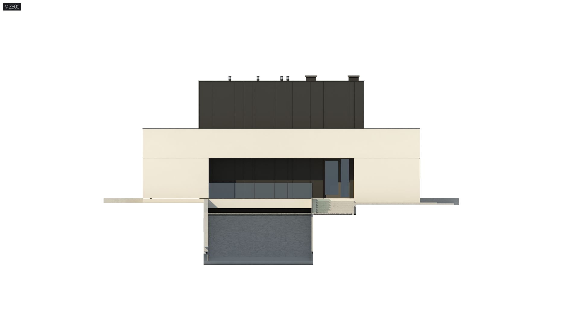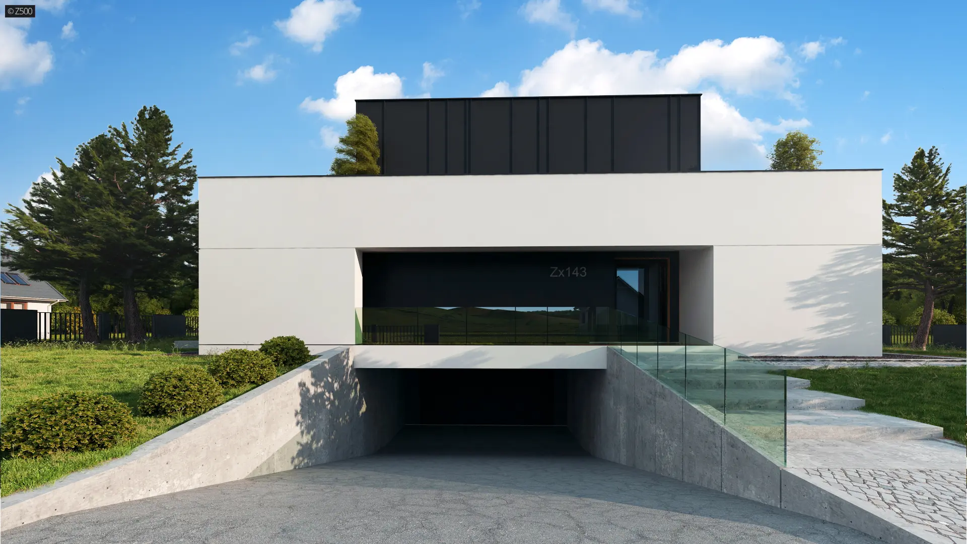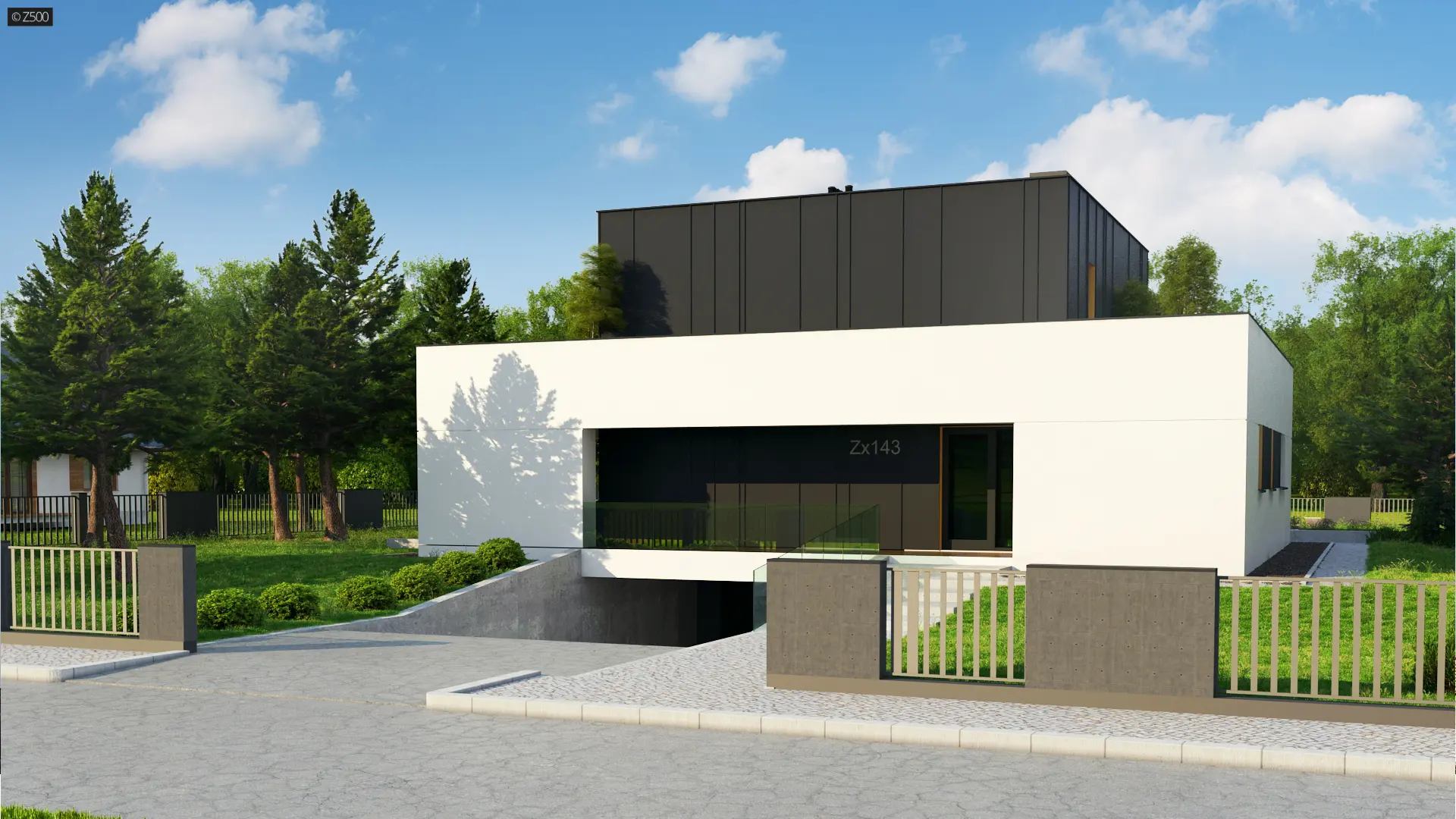 Projekt Zx143 jest propozycja uniwersalnego projektu dla każdej rodziny. Jego surowa bryła i kontrastująca kolorystyka budynku są bardzo zachowawcze. Biały kolor tynku niebiańsko ośnieża okalający budynek, natomiast centralna forma w kolorze grafitowym dodaje piekielnej pikanterii całości budynku. Elewację pokryto blaszanymi panelami, które ułatwiają utrzymanie budynku w czystości, zaś oblamowania okien wykonano tynkiem w kolorze.