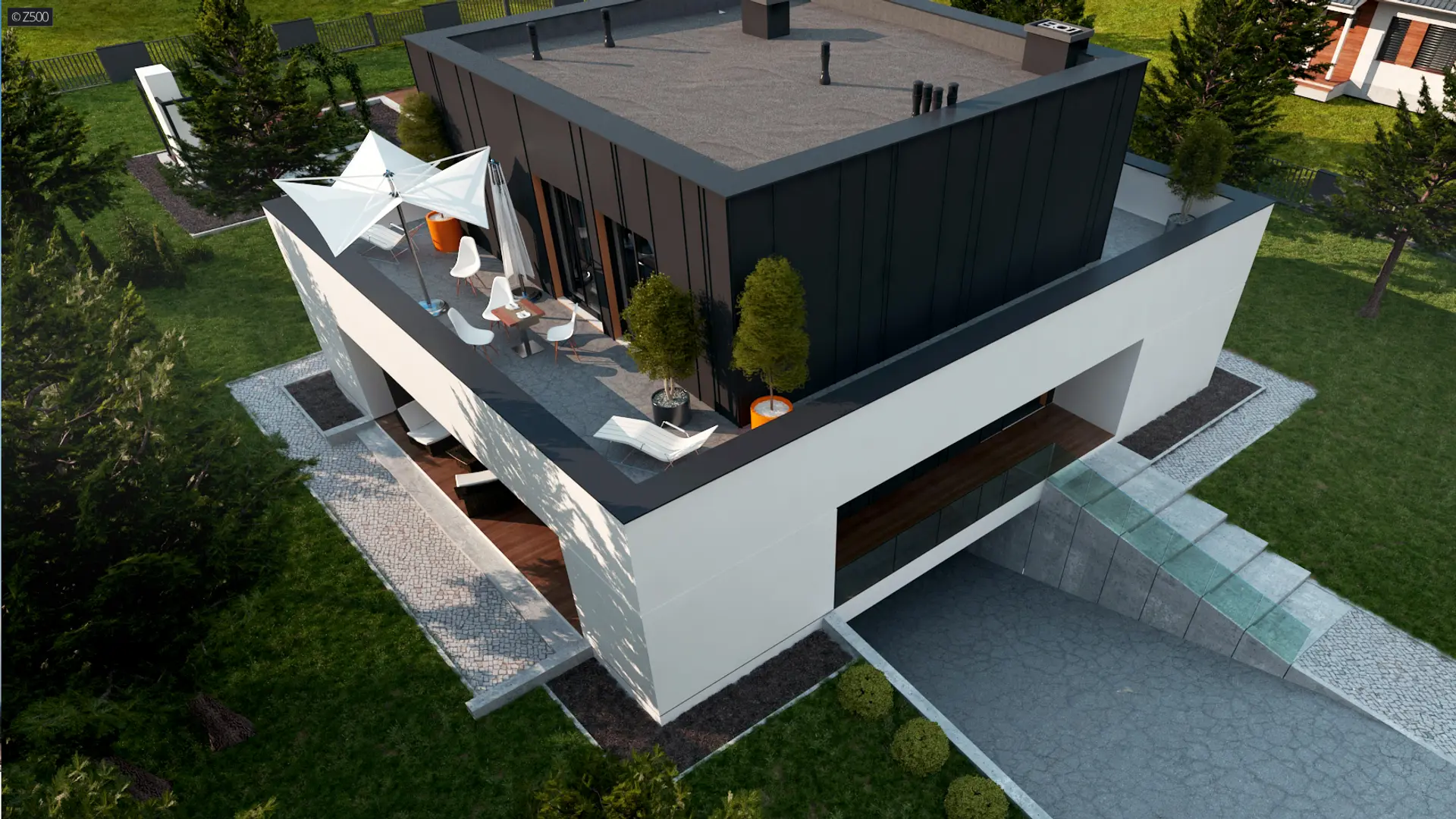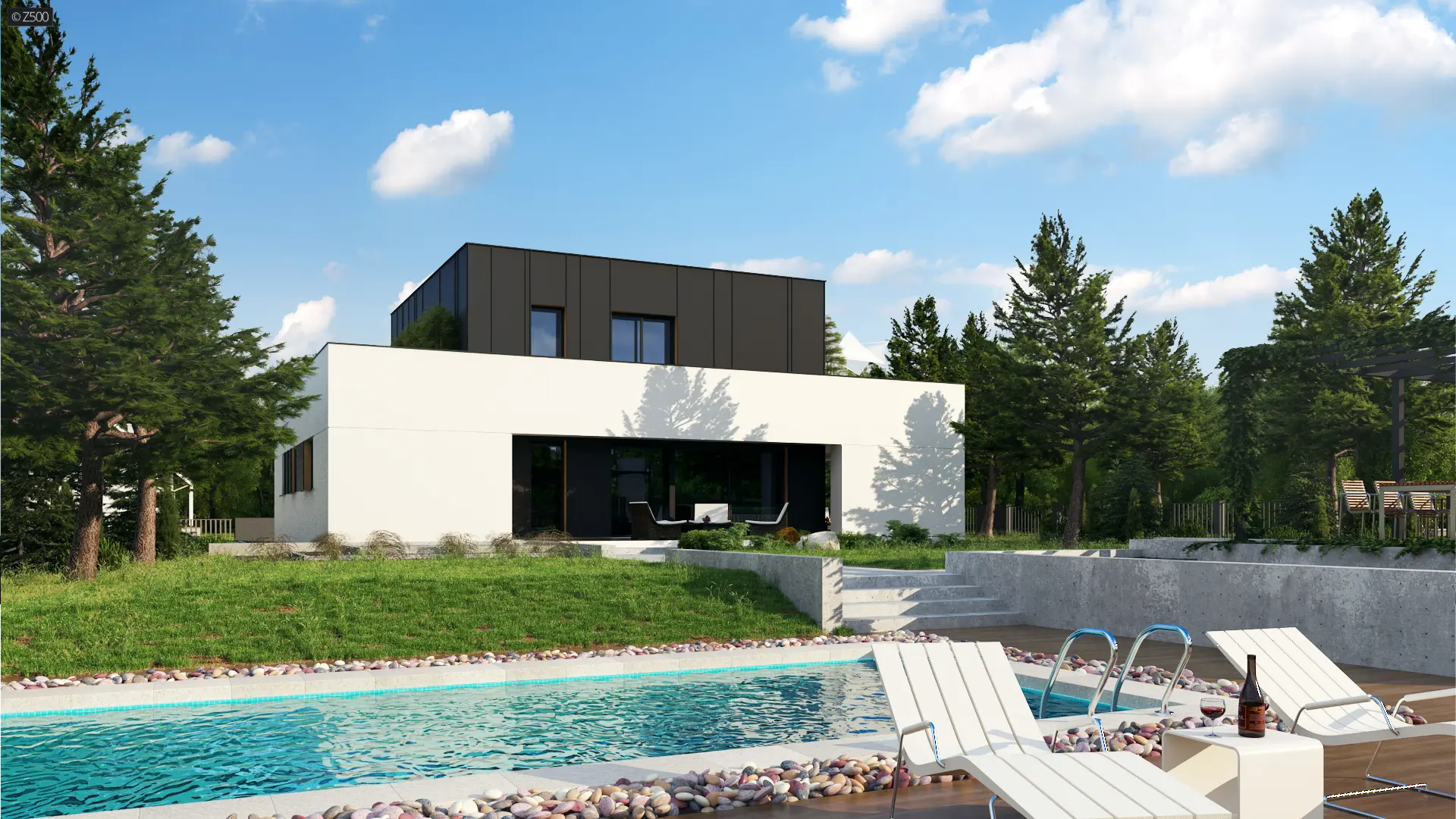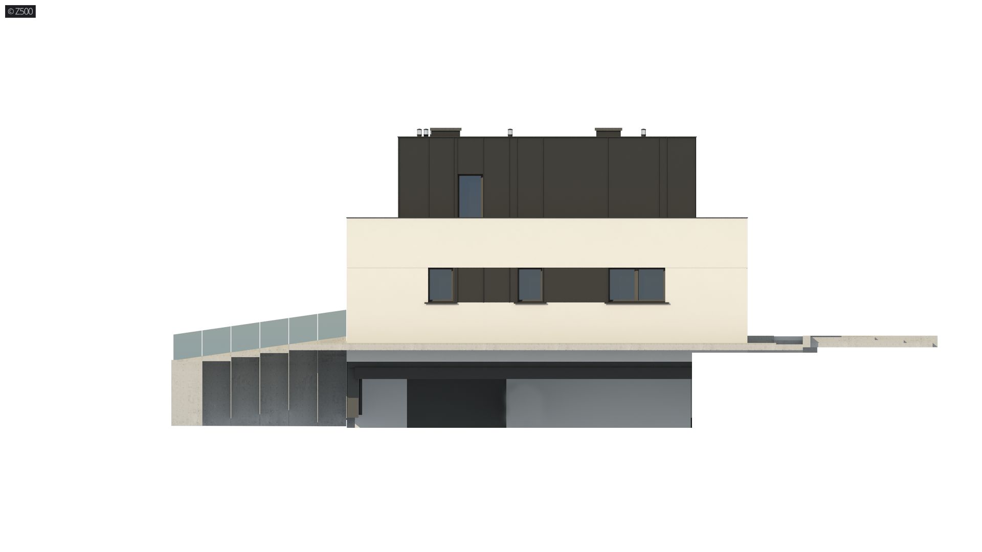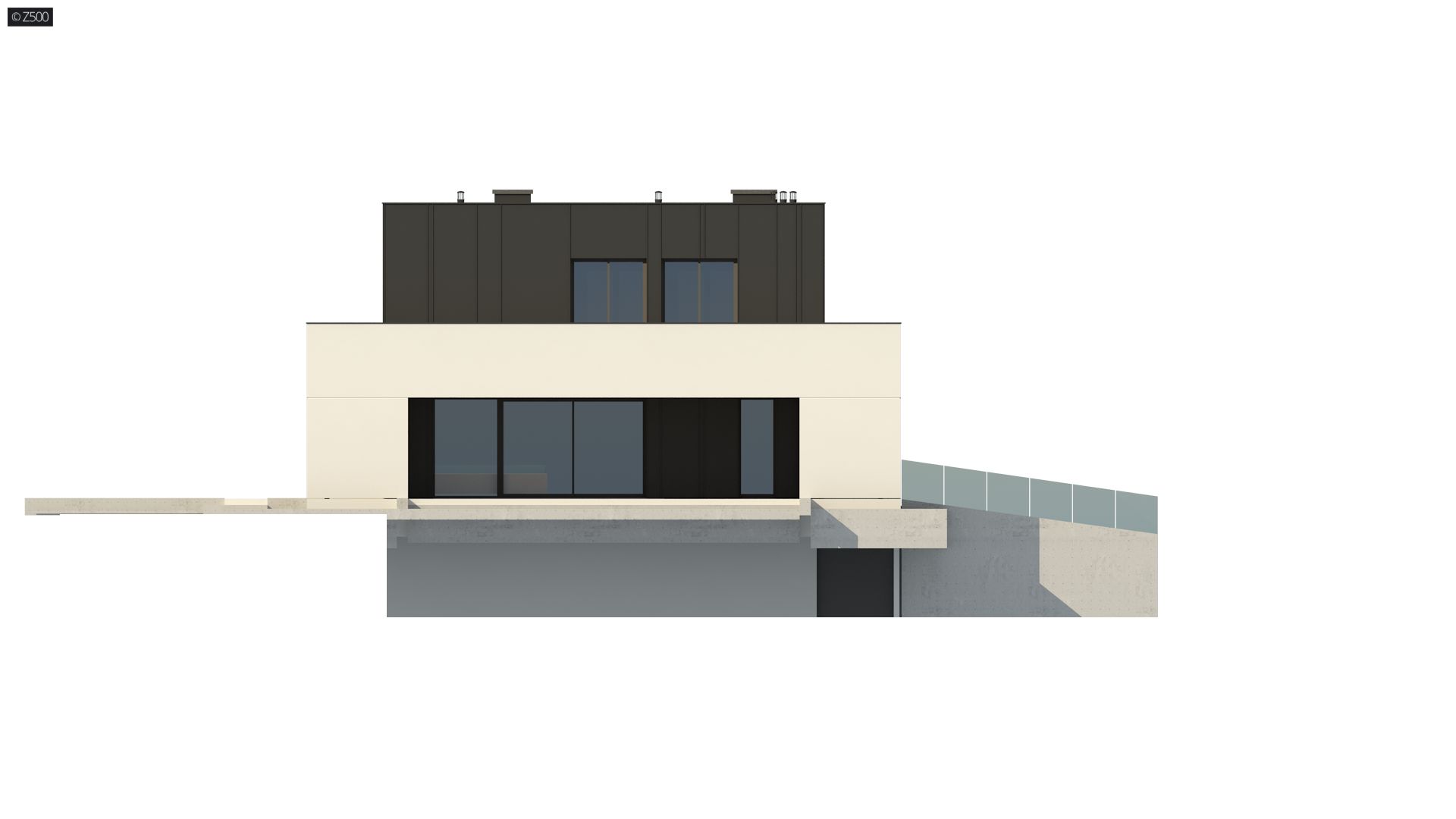 Projekt Zx143 jest propozycja uniwersalnego projektu dla każdej rodziny. Jego surowa bryła i kontrastująca kolorystyka budynku są bardzo zachowawcze. Biały kolor tynku niebiańsko ośnieża okalający budynek, natomiast centralna forma w kolorze grafitowym dodaje piekielnej pikanterii całości budynku. Elewację pokryto blaszanymi panelami, które ułatwiają utrzymanie budynku w czystości, zaś oblamowania okien wykonano tynkiem w kolorze.