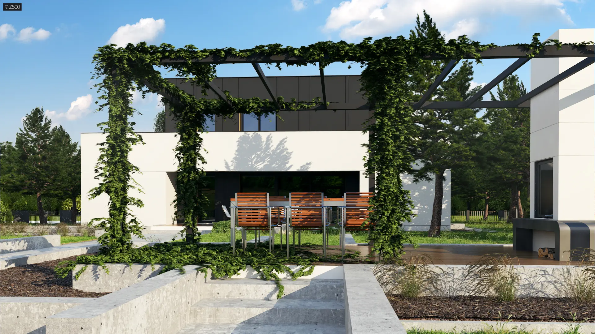 Dodatkowej formy relaksu dostarczy basen rekreacyjny i altana ogrodowa z kominkiem, które zaprojektowano przy wykorzystaniu różnicy poziomów w części ogrodowej.
