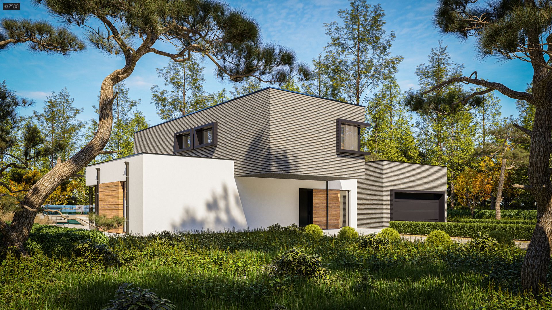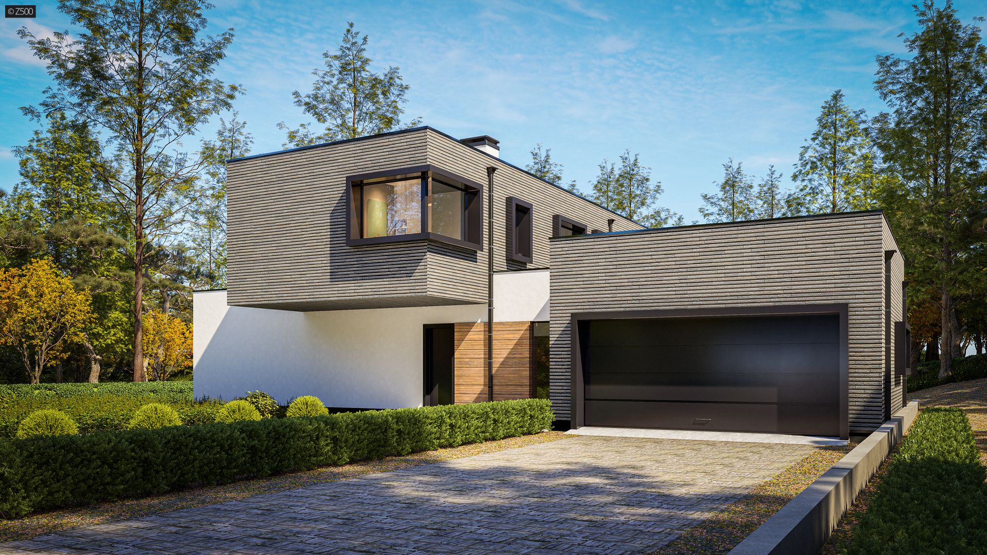 Nowoczesny dom piętrowy z płaskim dachem oraz garażem 2-stanowiskowym.