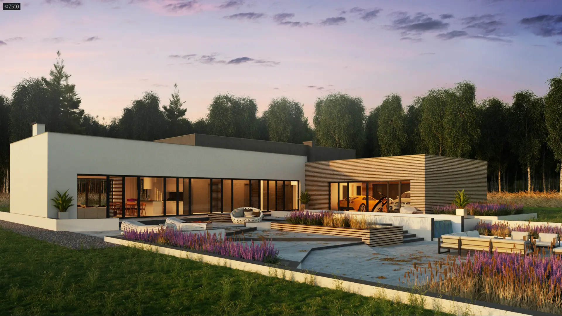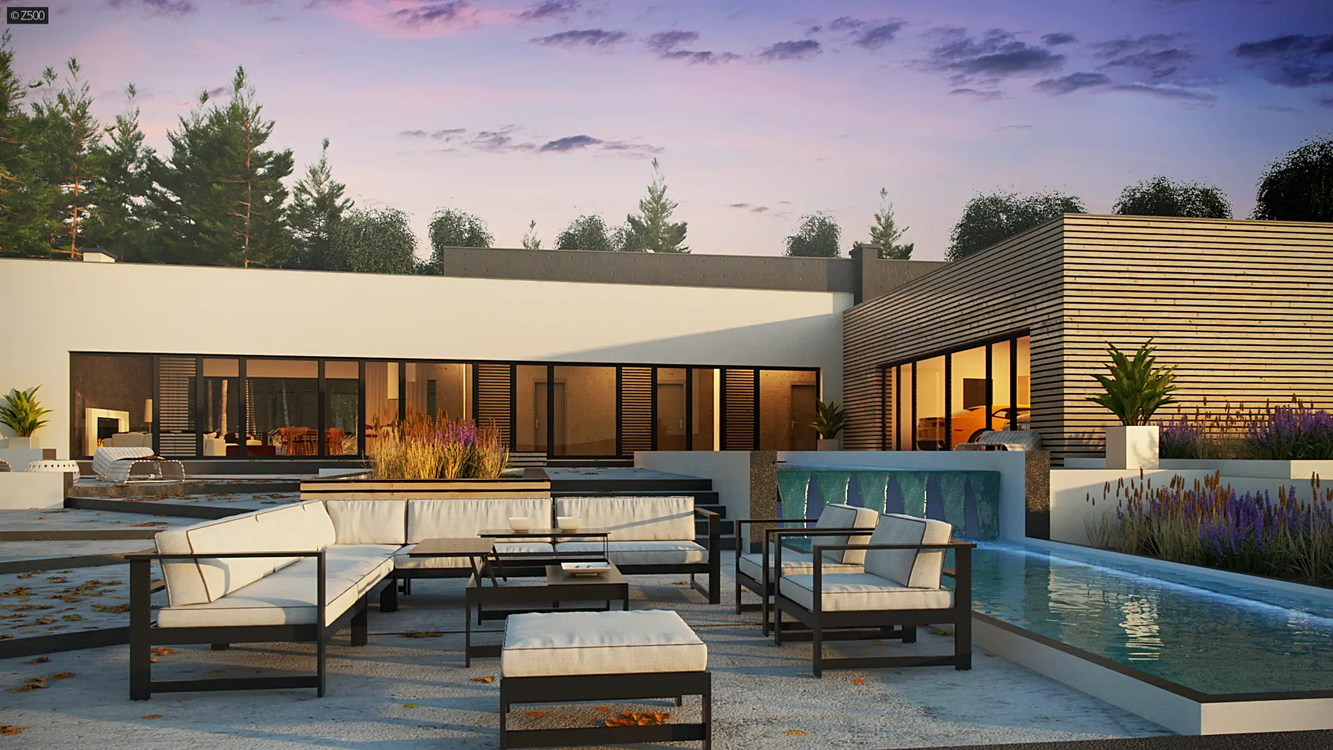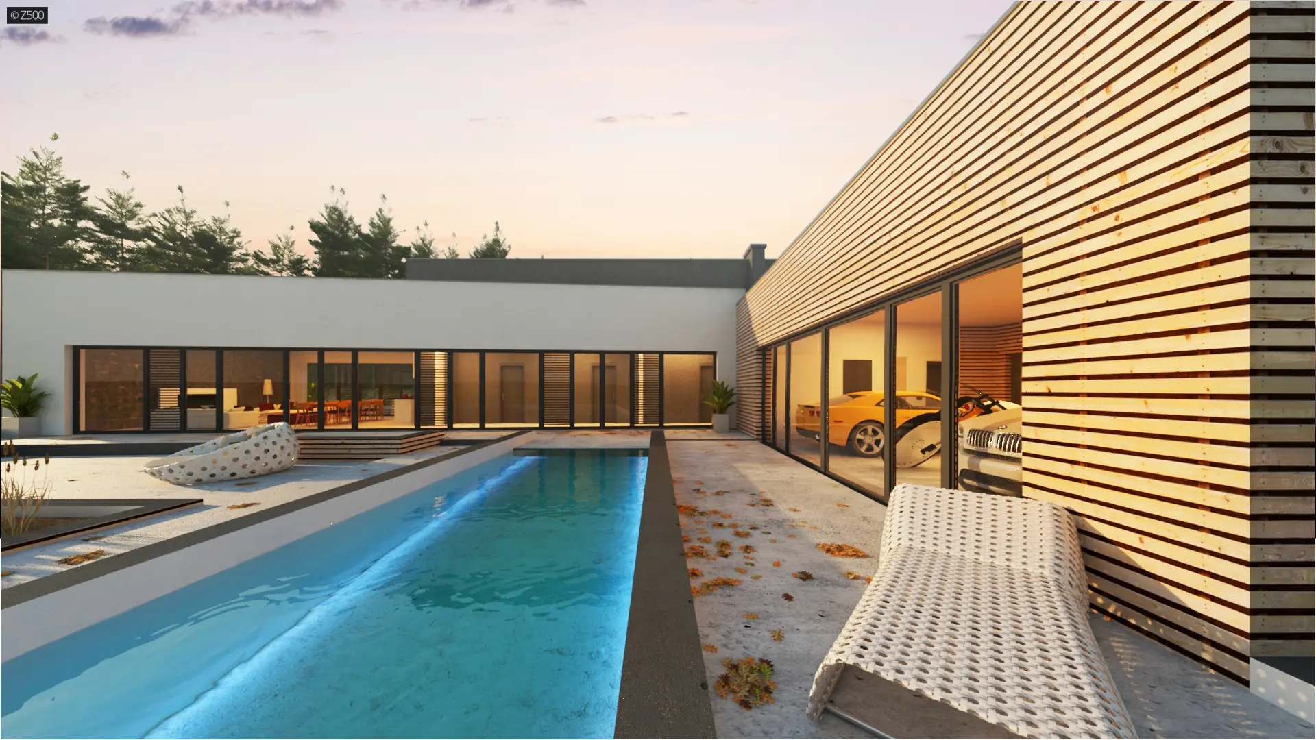 Nowoczesny autorodzinny dom w kształcie litery L, z płaskim dachem, dużymi przeszkleniami i trzystanowiskowym garażem przeszklonym od strony ogrodu. Elewację zdobioną białym tynkiem uświetnia połączenie dużych przeszkleń z drewnianymi panelami. Dwupoziomowy basen stanowi dopełnienie najwyższej jakości gustu i dobrego smaku. Możemy spędzać przy nim czas w ciepłe, letnie dni.